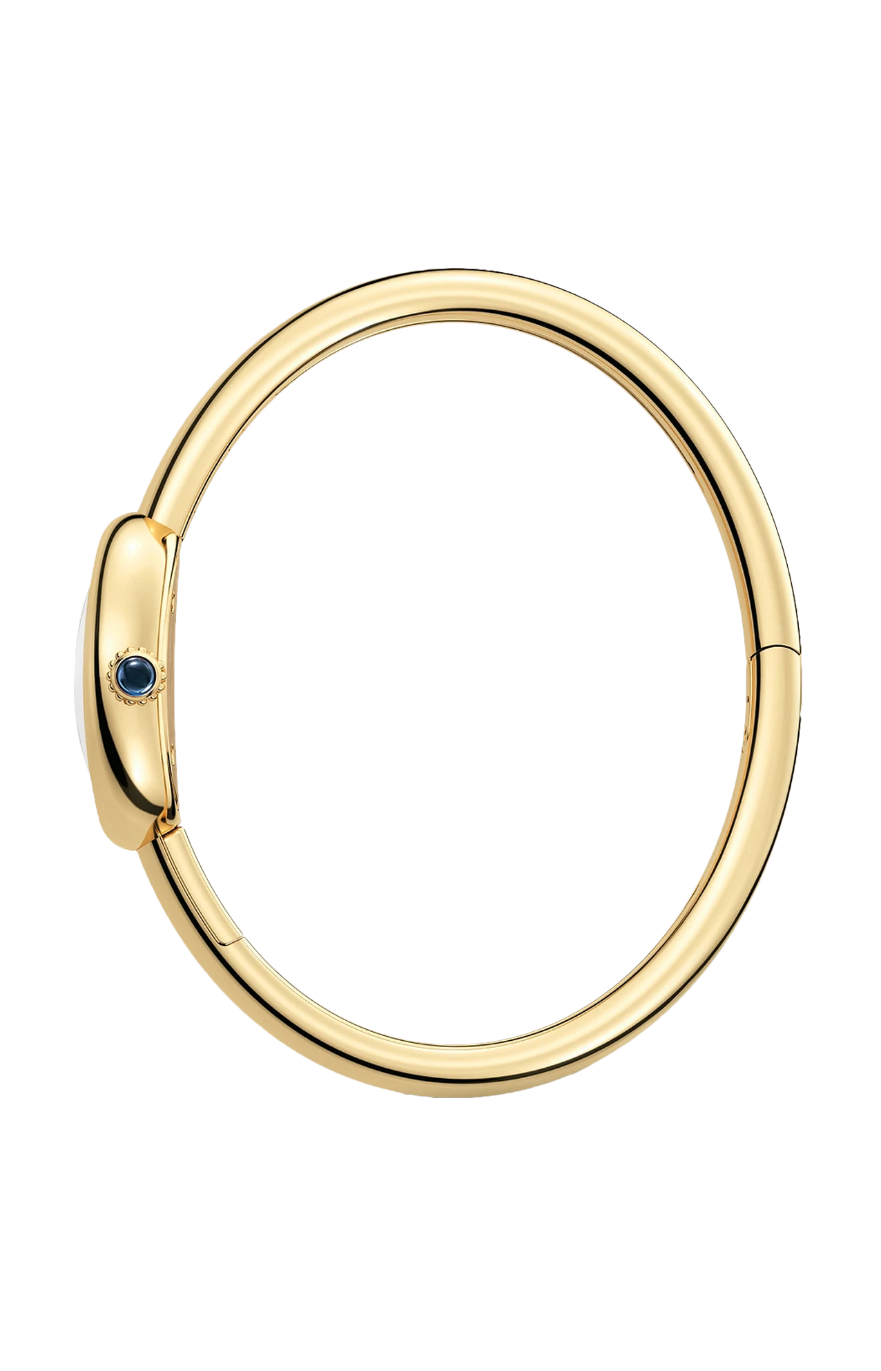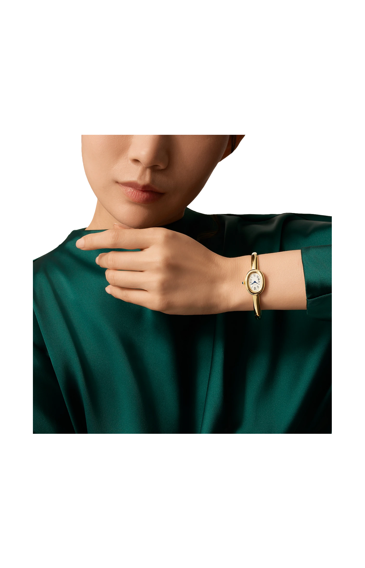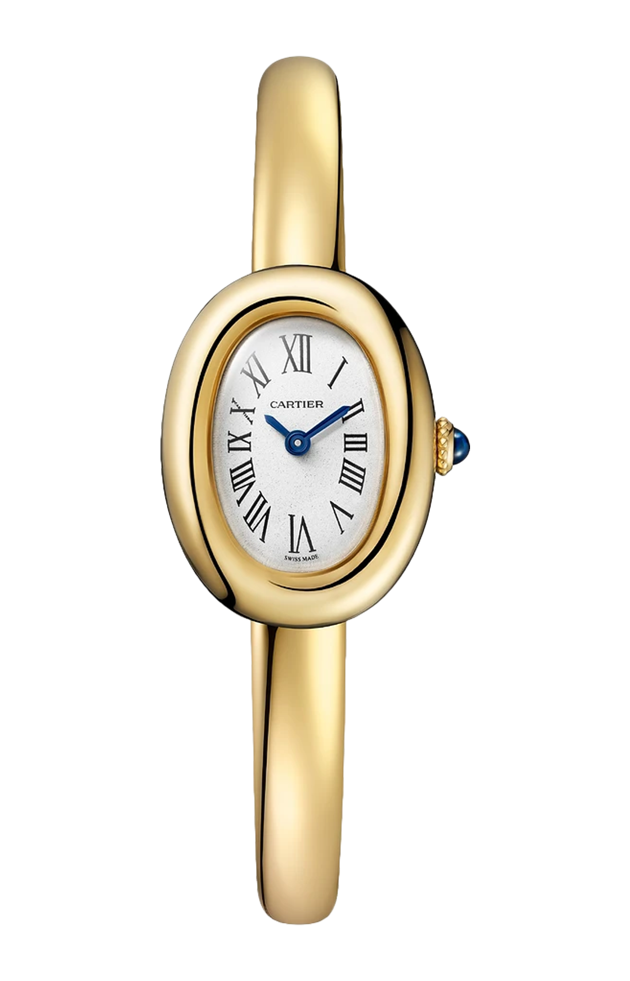 Orologio Baignoire de Cartier, modello mini, misura 17, movimento al quarzo. Cassa in oro giallo 750/1000. Corona perlata in oro giallo 750/1000 ornata di uno zaffiro cabochon. Quadrante argentato, lancette a forma di gladio d’acciaio azzurrato, vetro zaffiro. Bracciale rigido in oro giallo 750/1000. Dimensioni della cassa 24,6 x 18,7 mm, spessore 7,2 mm. Impermeabile fino a 30 metri.