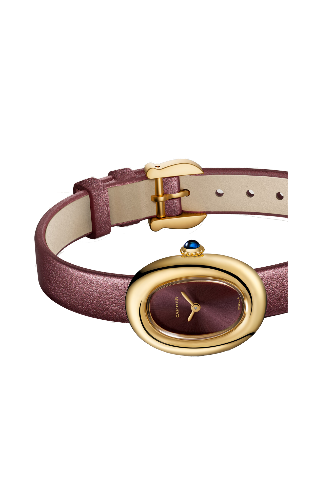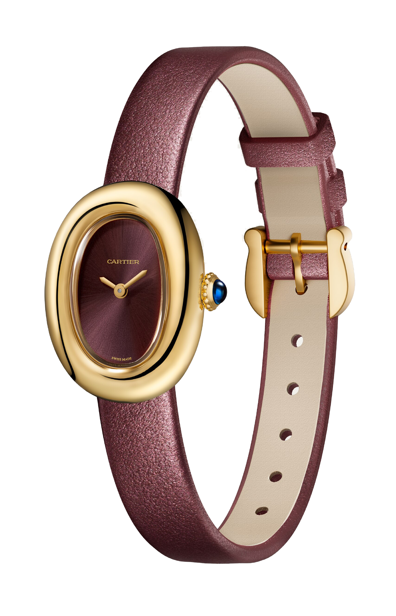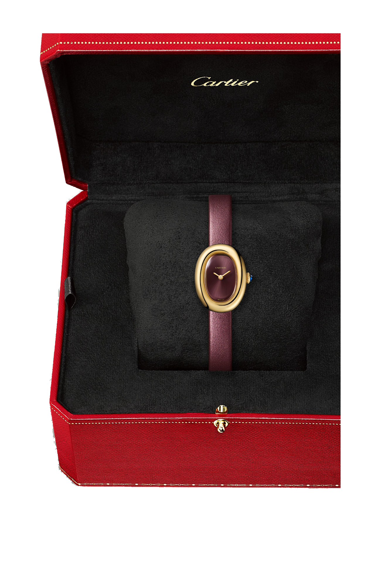 Orologio Baignoire de Cartier, modello mini, movimento al quarzo. Cassa in oro giallo 750/1000. Corona perlata in oro giallo 750/1000 ornata di uno zaffiro cabochon. Quadrante laccato coloro prugna, lancette a forma di gladio in acciaio finitura dorata, vetro zaffiro. Cinturino in pelle di vitello satinata color prugna, fibbia ad ardiglione in oro giallo 750/1000. Dimensioni della cassa 24,6 x 18,7 mm, spessore 7,2 mm. Impermeabile fino a 30 metri.