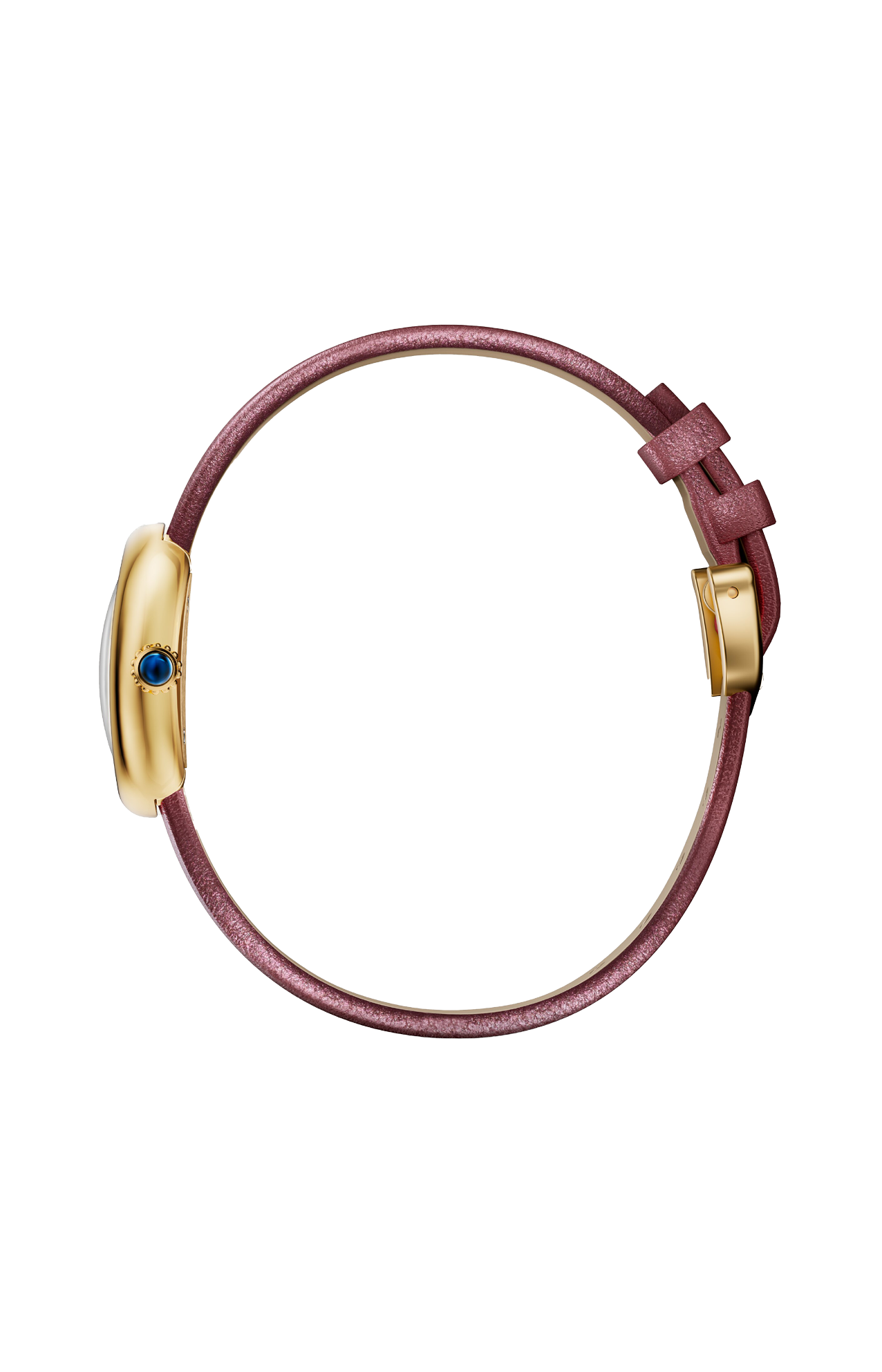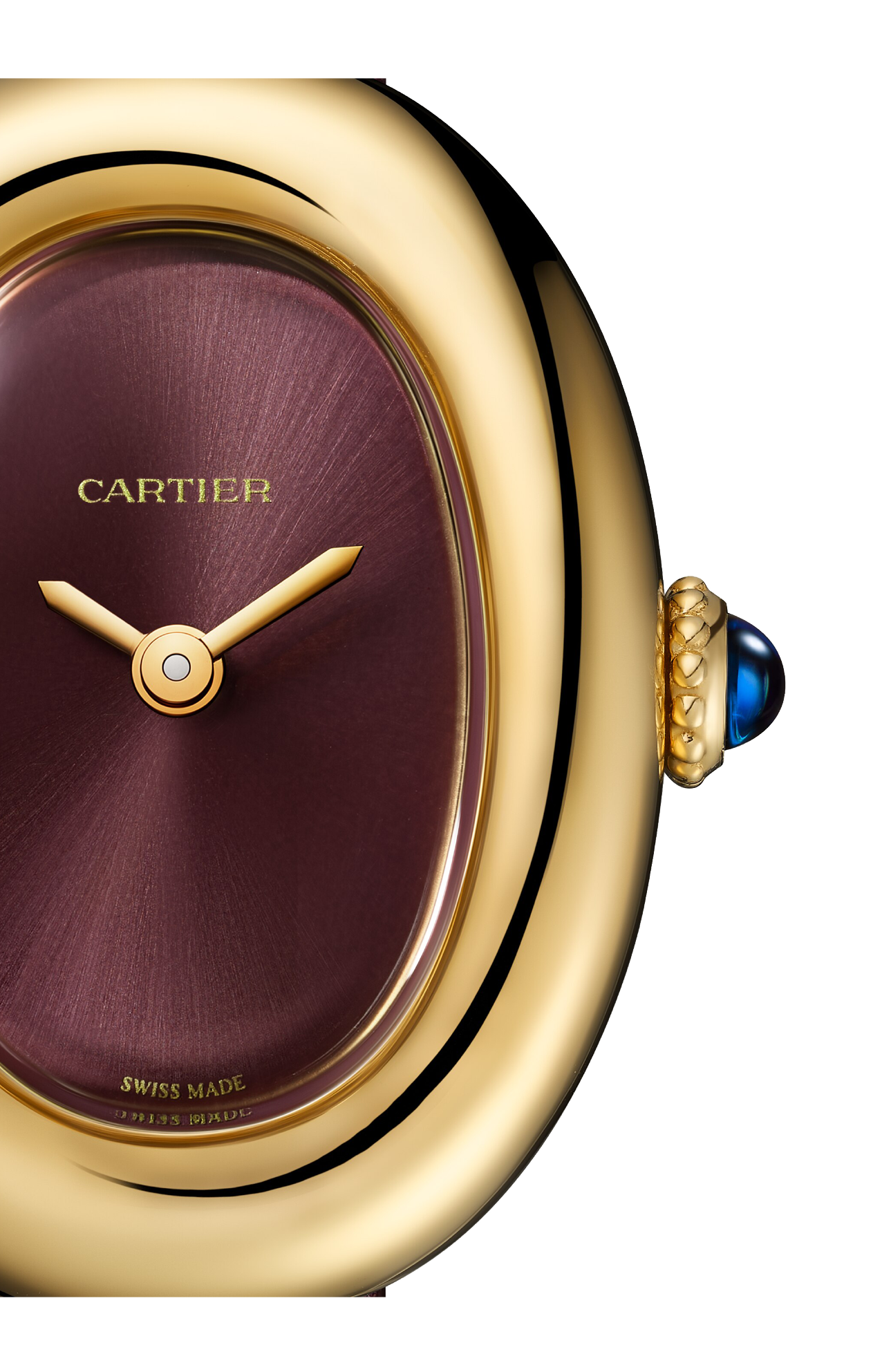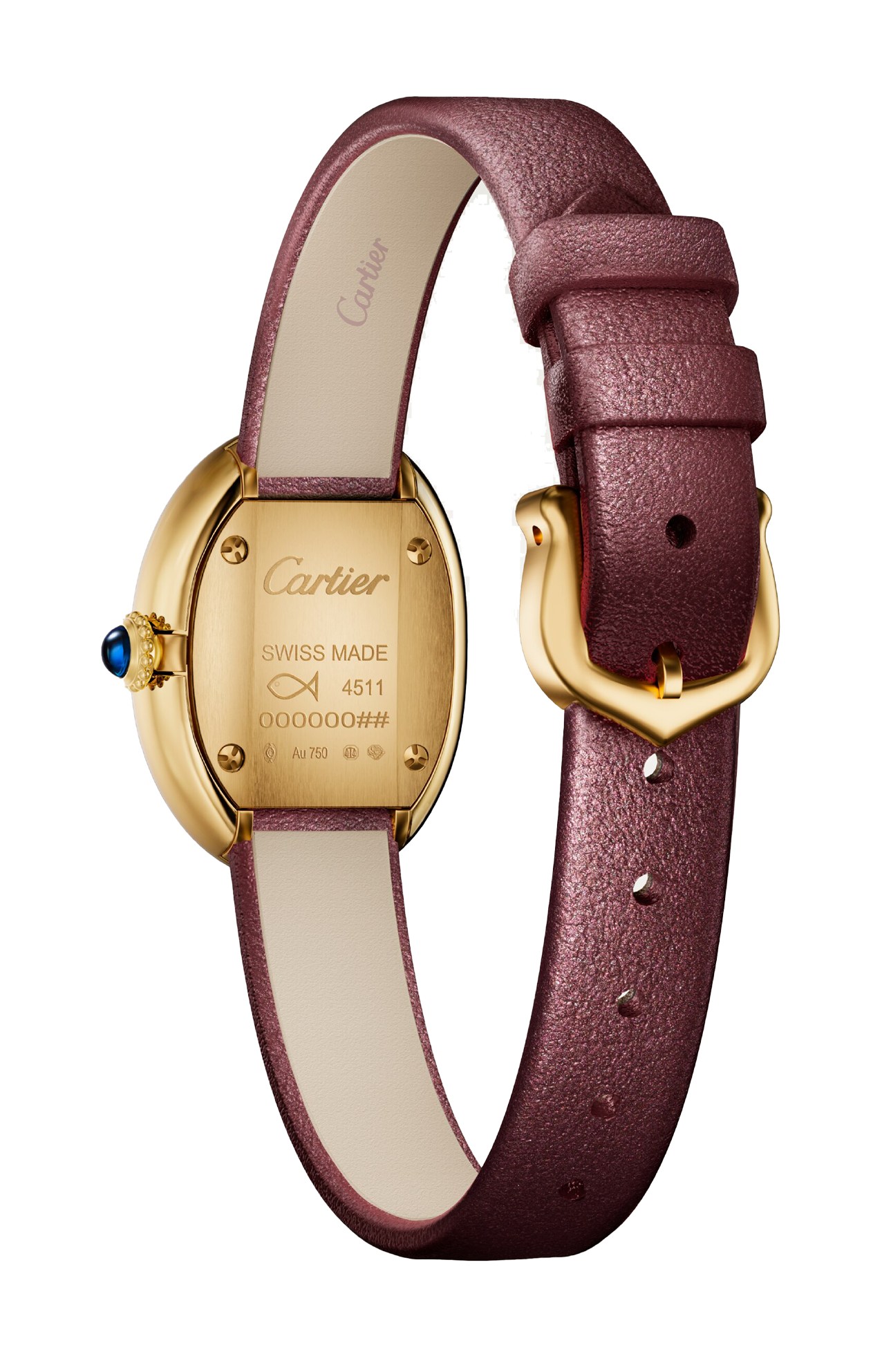 Orologio Baignoire de Cartier, modello mini, movimento al quarzo. Cassa in oro giallo 750/1000. Corona perlata in oro giallo 750/1000 ornata di uno zaffiro cabochon. Quadrante laccato coloro prugna, lancette a forma di gladio in acciaio finitura dorata, vetro zaffiro. Cinturino in pelle di vitello satinata color prugna, fibbia ad ardiglione in oro giallo 750/1000. Dimensioni della cassa 24,6 x 18,7 mm, spessore 7,2 mm. Impermeabile fino a 30 metri.