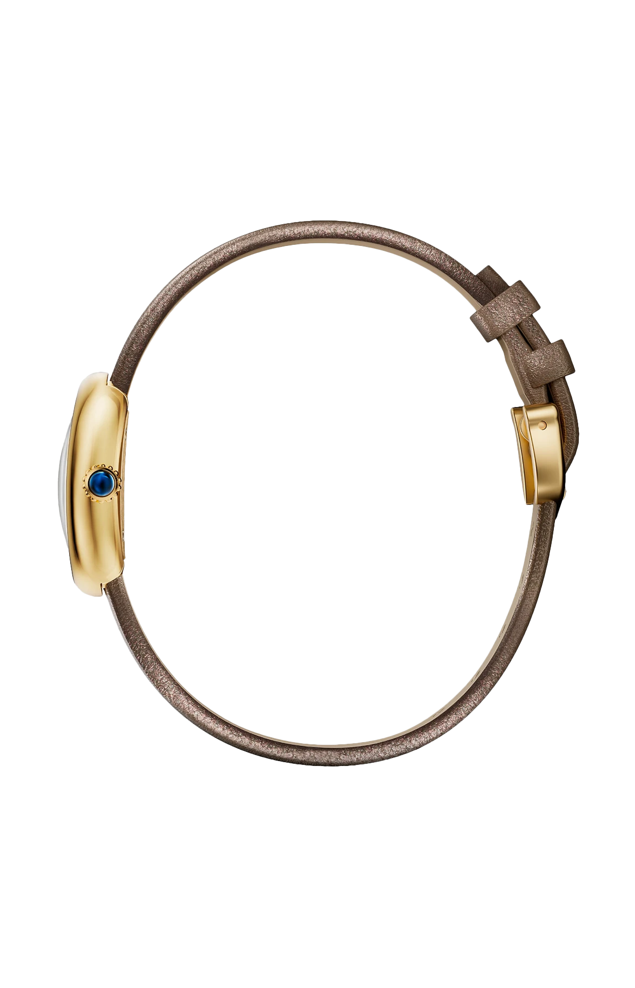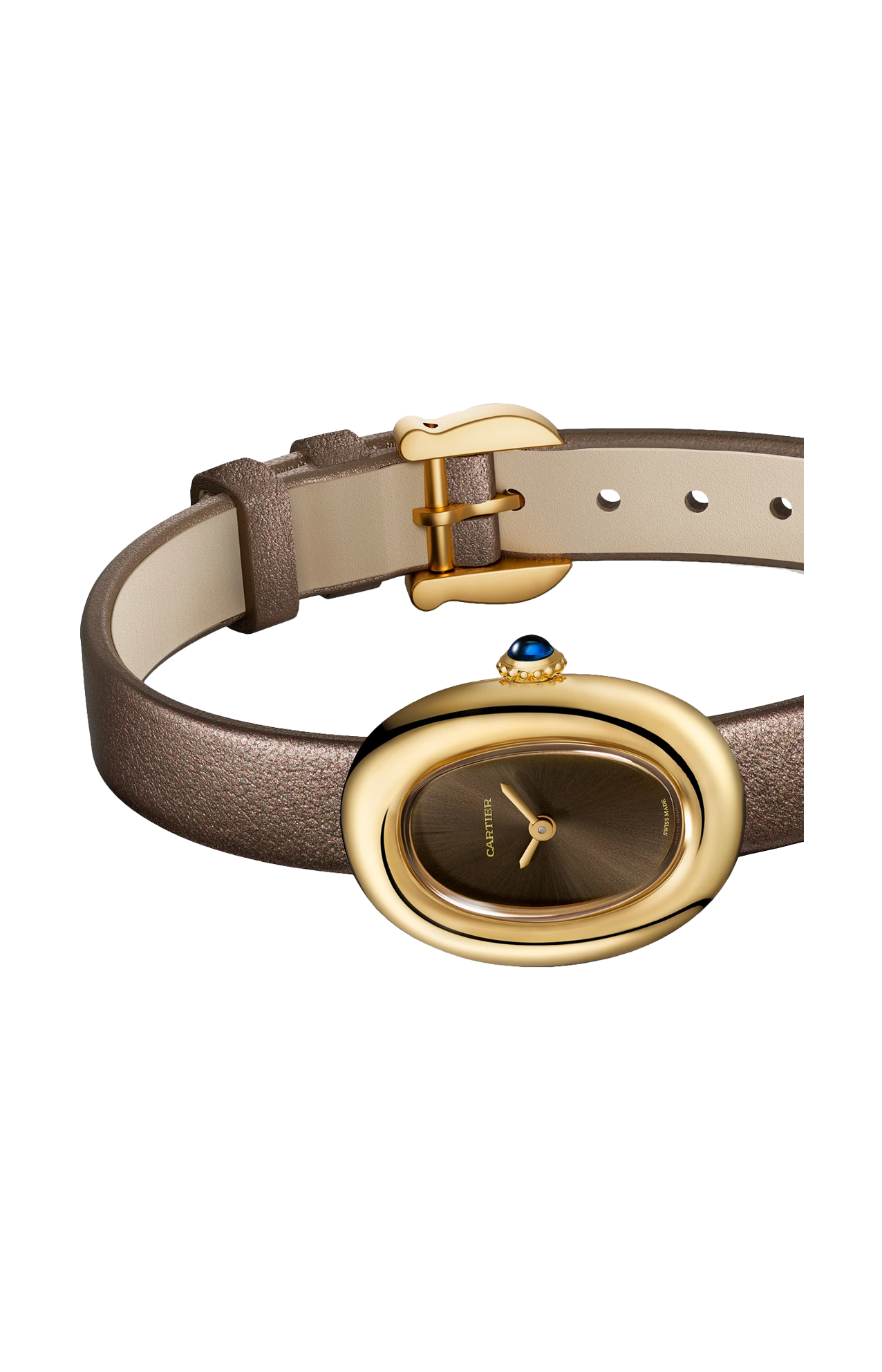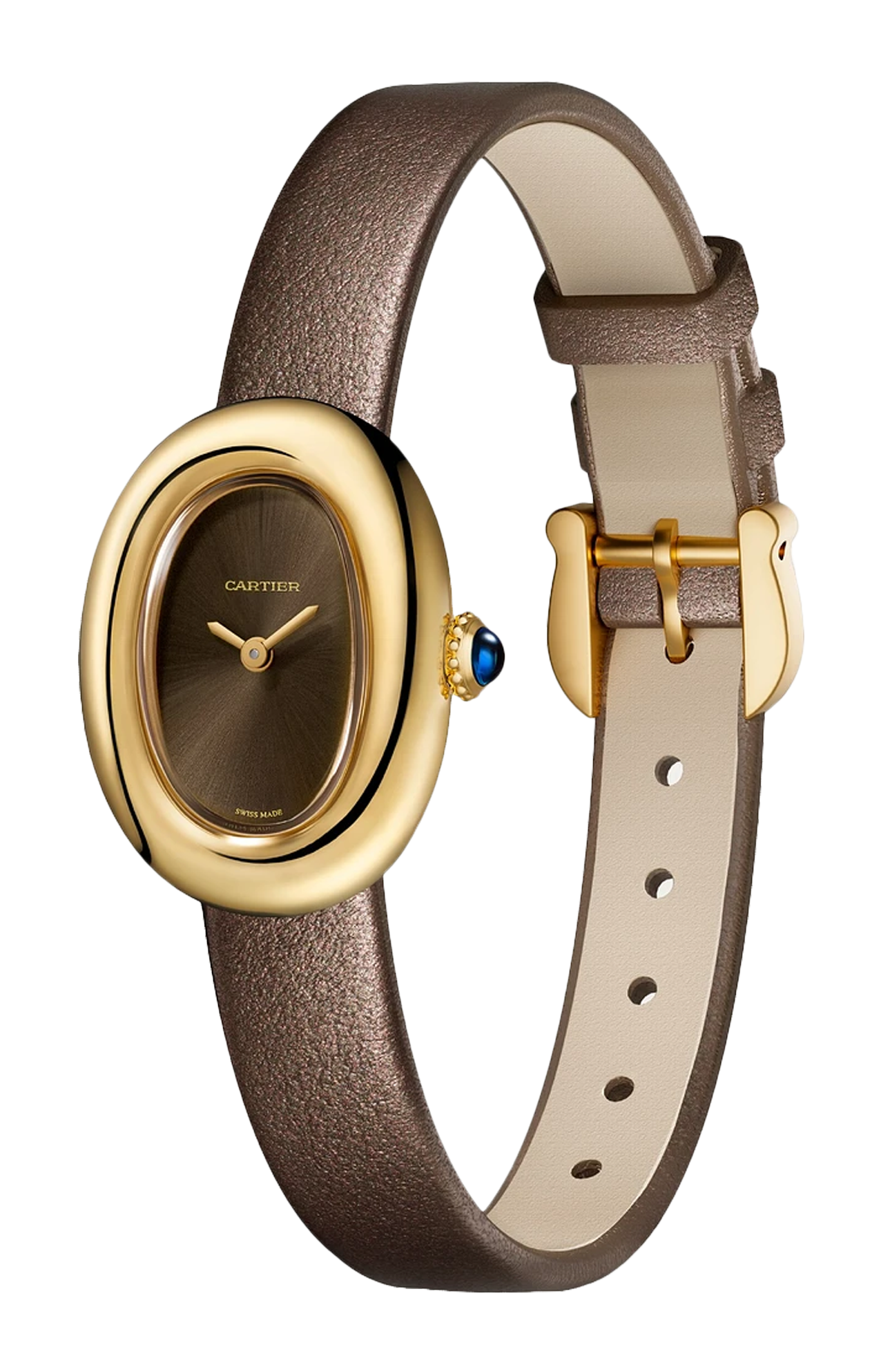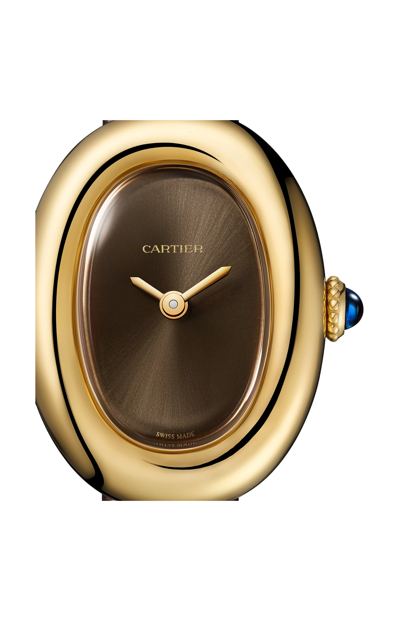 Orologio Baignoire de Cartier, modello mini, movimento al quarzo. Cassa in oro giallo 750/1000. Corona perlata in oro giallo 750/1000 ornata di uno zaffiro cabochon. Quadrante laccato color bronzo, lancette a forma di gladio in acciaio finitura dorata, vetro zaffiro. Cinturino in pelle di vitello satinata bronzo, fibbia ad ardiglione in oro giallo 750/1000. Dimensioni della cassa 24,6 x 18,7 mm, spessore 7,2 mm. Impermeabile fino a 30 metri.