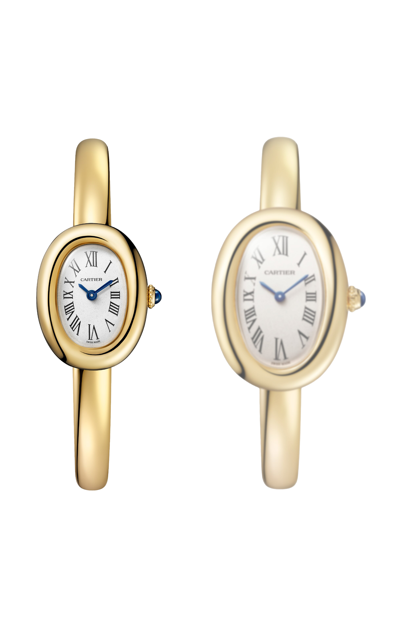 Orologio Baignoire, modello mini, misura 15, movimento al quarzo. Cassa in oro giallo 18 carati (750/1000). Corona perlata in oro giallo 18 carati (750/1000) con cabochon in zaffiro. Bracciale rigido in oro giallo 18 carati (750/1000). Quadrante argentato, lancette a forma di gladio in acciaio azzurrato, vetro zaffiro. Lunghezza: 24,6 mm. Larghezza: 18,7 mm. Spessore: 7,2 mm. Impermeabile fino a 3 bar (circa 30 metri/100 piedi).
