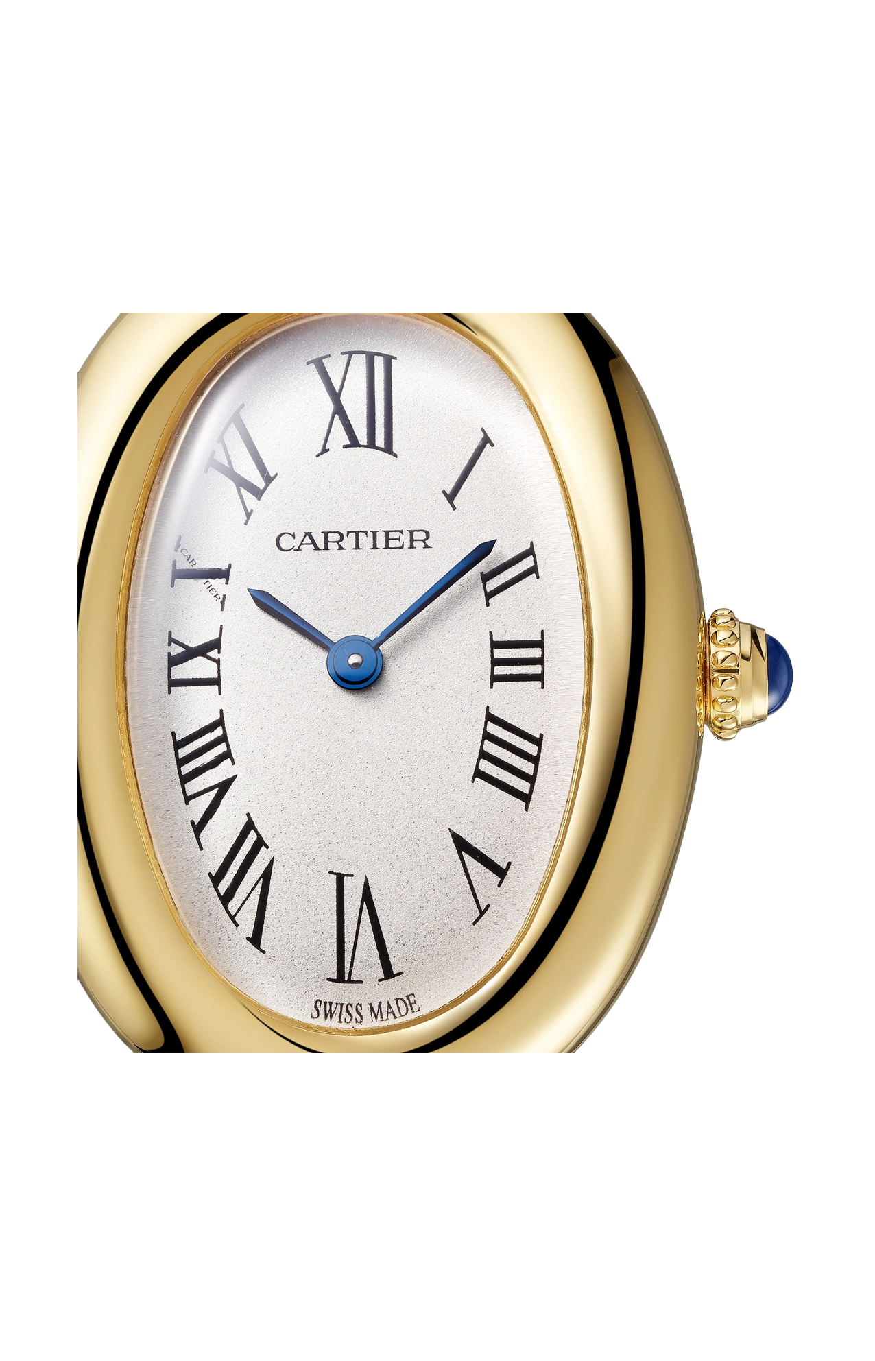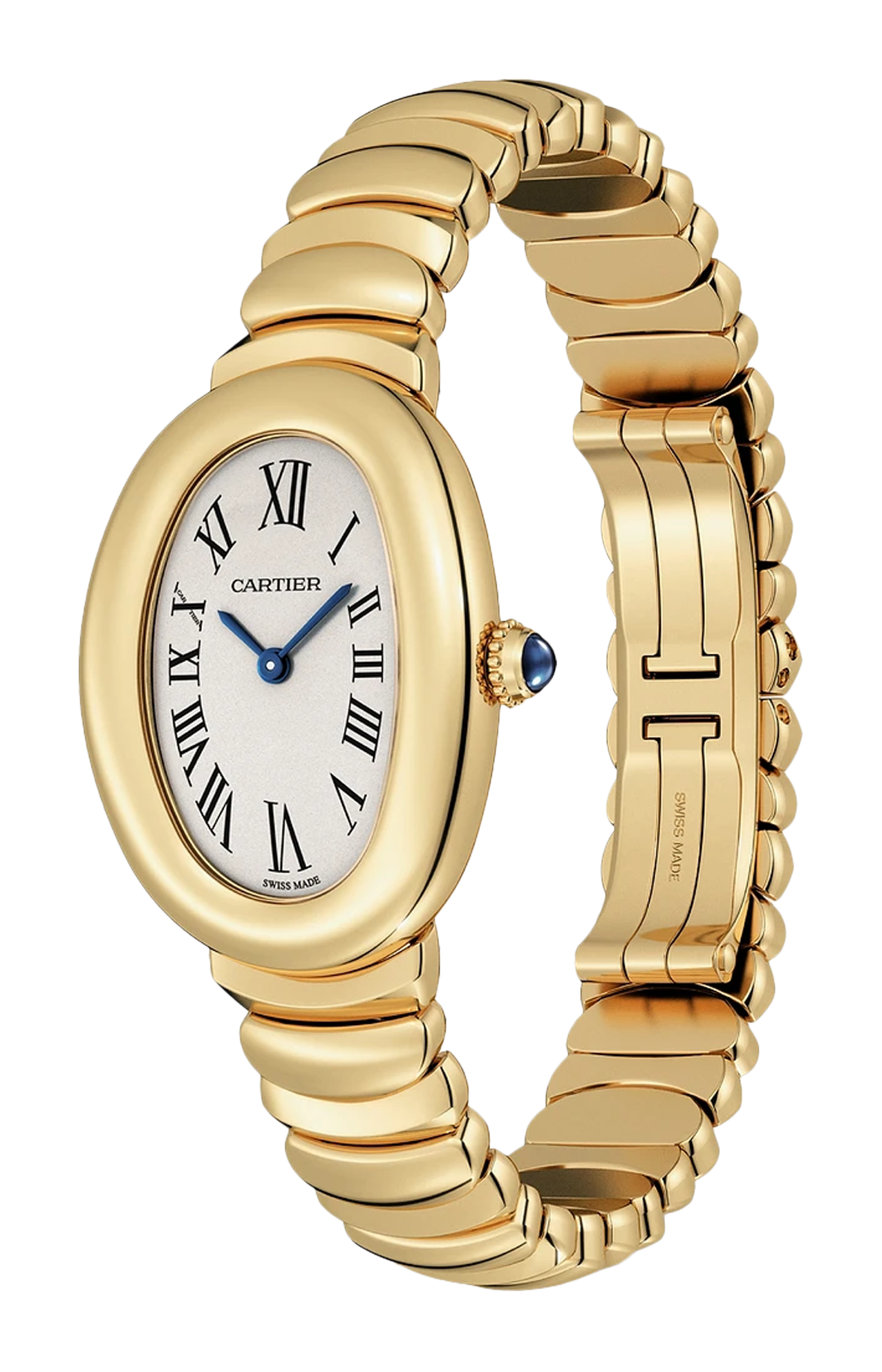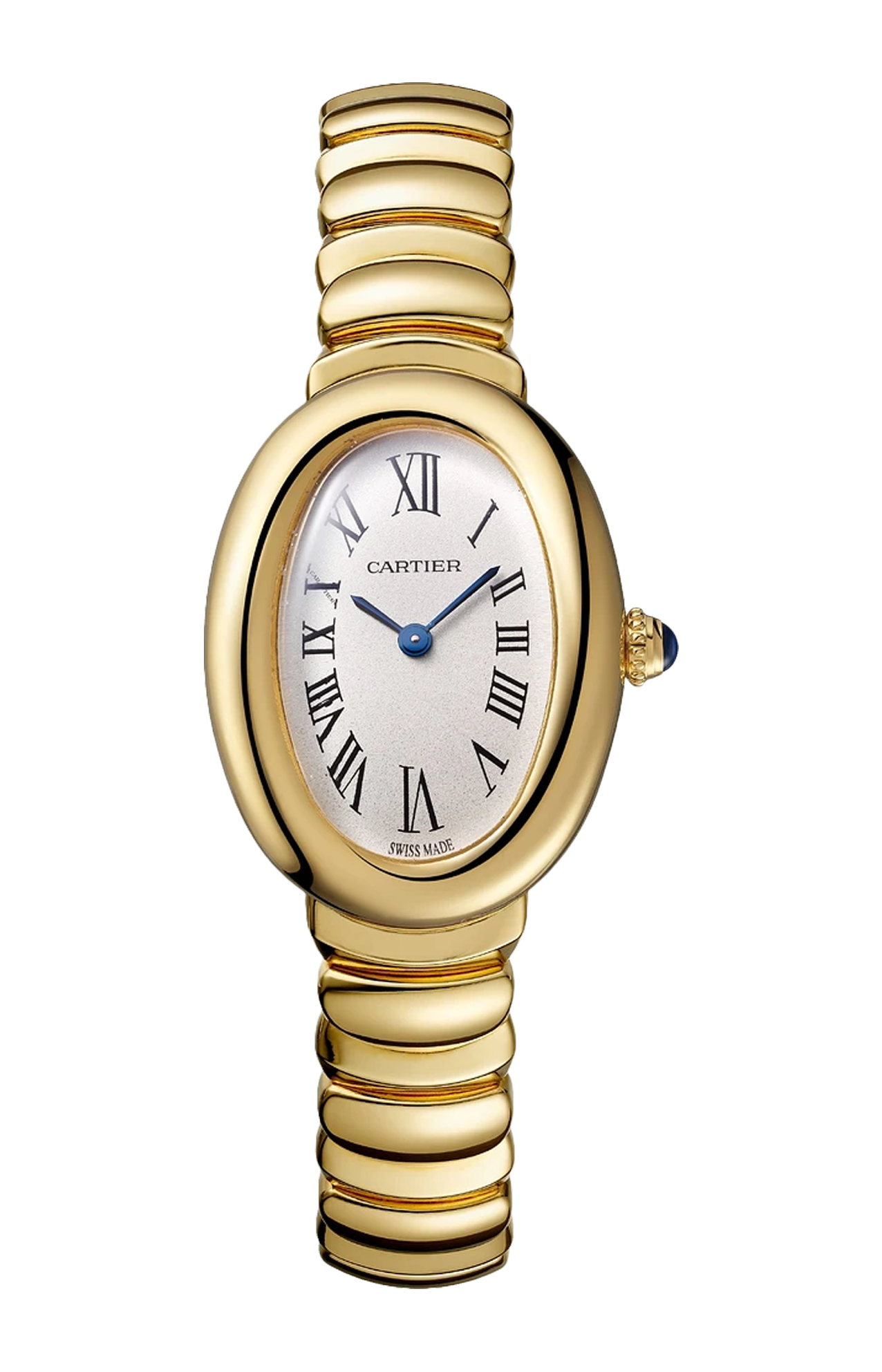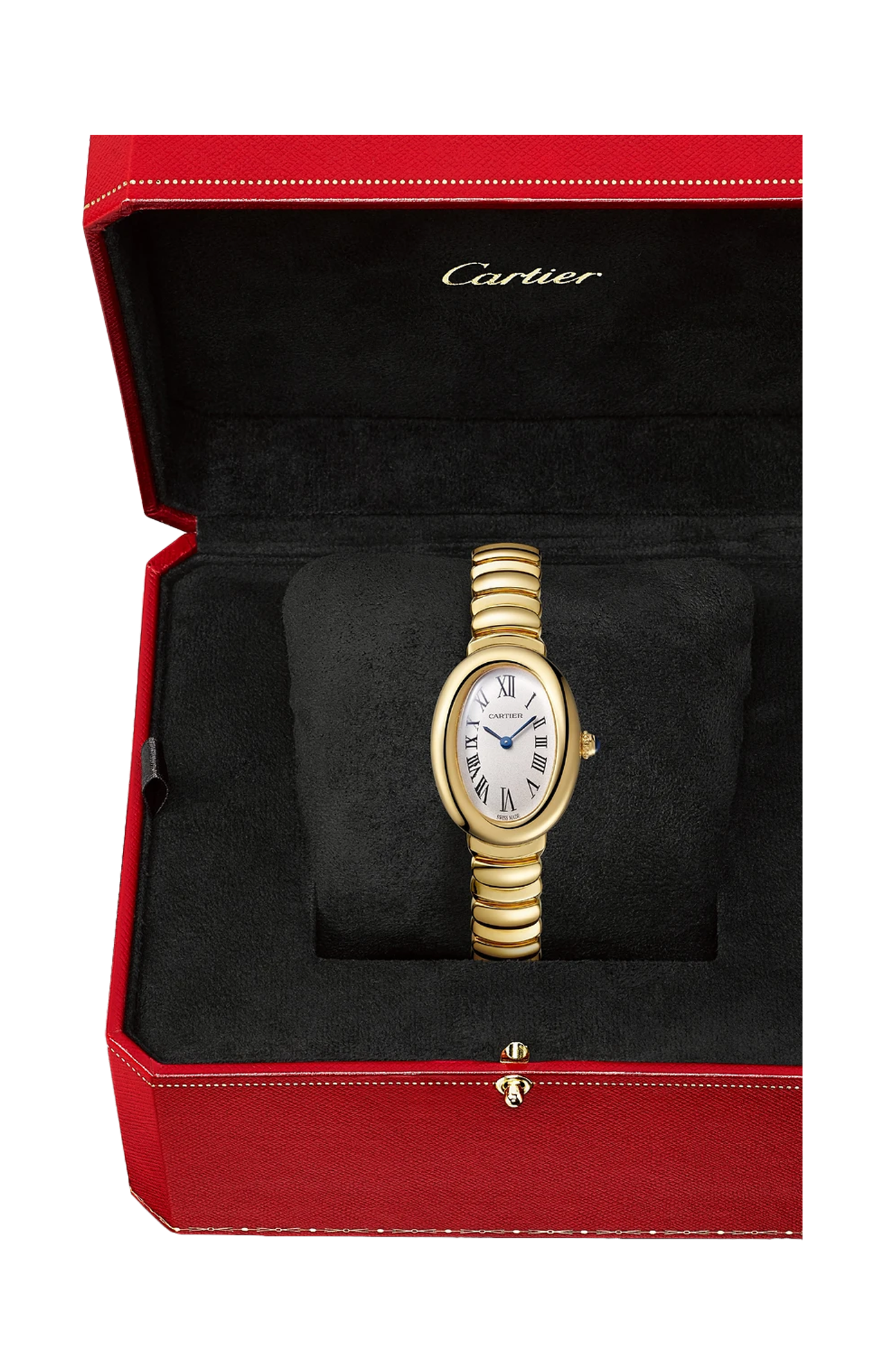 Orologio Baignoire de Cartier, modello piccolo, movimento al quarzo. Cassa e corona perlata in oro giallo 750/1000. Quadrante argentato, lancette a forma di gladio d’acciaio azzurrato, vetro zaffiro. Bracciale in oro giallo 750/1000. Dimensioni della cassa 31,4 x 23,09 mm, spessore 6,95 mm. Impermeabile fino a 30 metri.