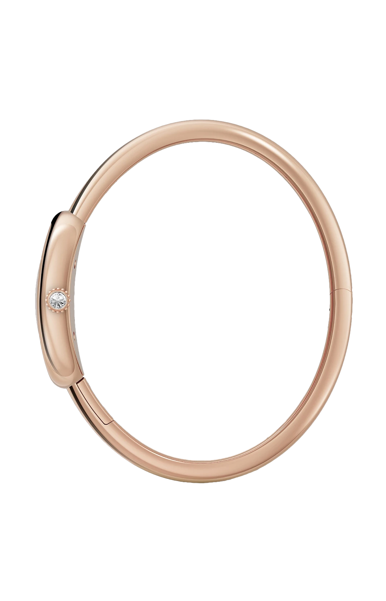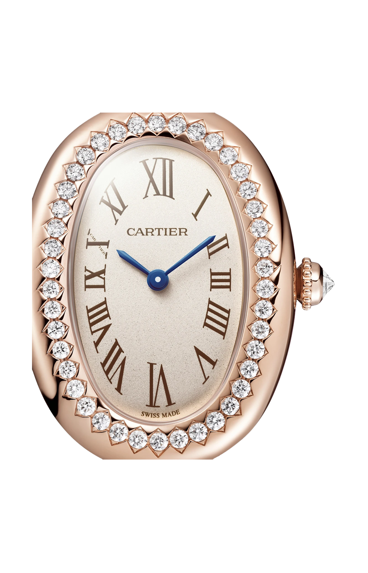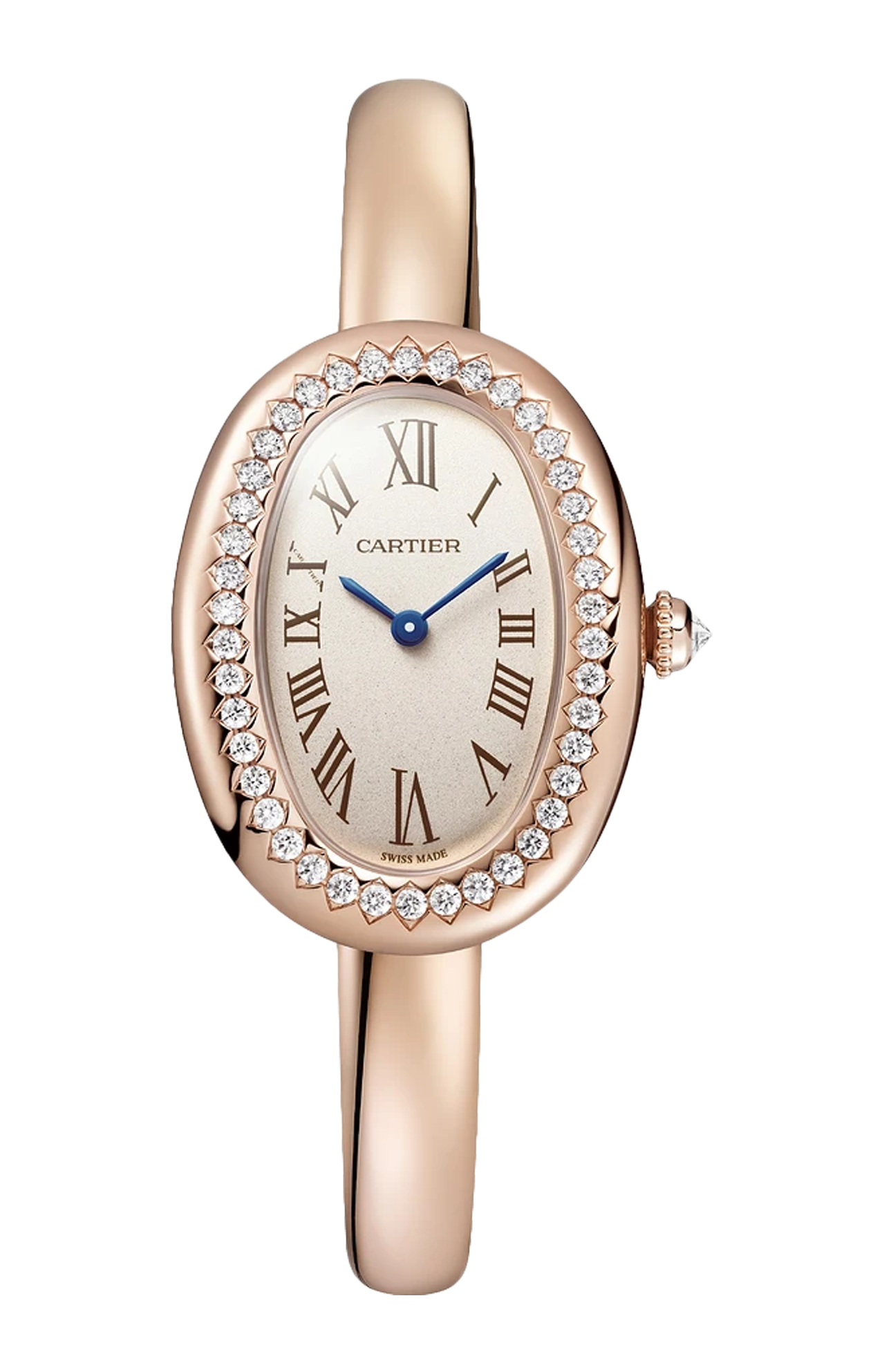 Orologio Baignoire de Cartier, modello piccolo, misura 15, movimento al quarzo. Cassa in oro rosa 750/1000 ornata di 42 diamanti taglio brillante (0,48 carati). Corona perlata in oro rosa 750/1000 ornata di un diamante (0,08 carati). Quadrante argentato, lancette a forma di gladio d’acciaio azzurrato, vetro zaffiro. Dimensioni della cassa 31,4 x 23,1 mm, spessore 6,9 mm. Impermeabile fino a 30 metri.