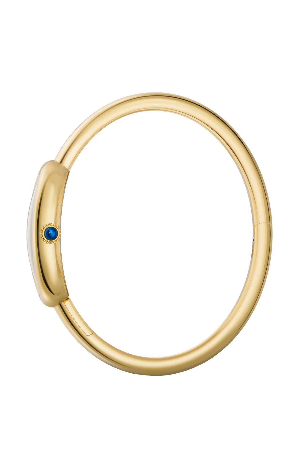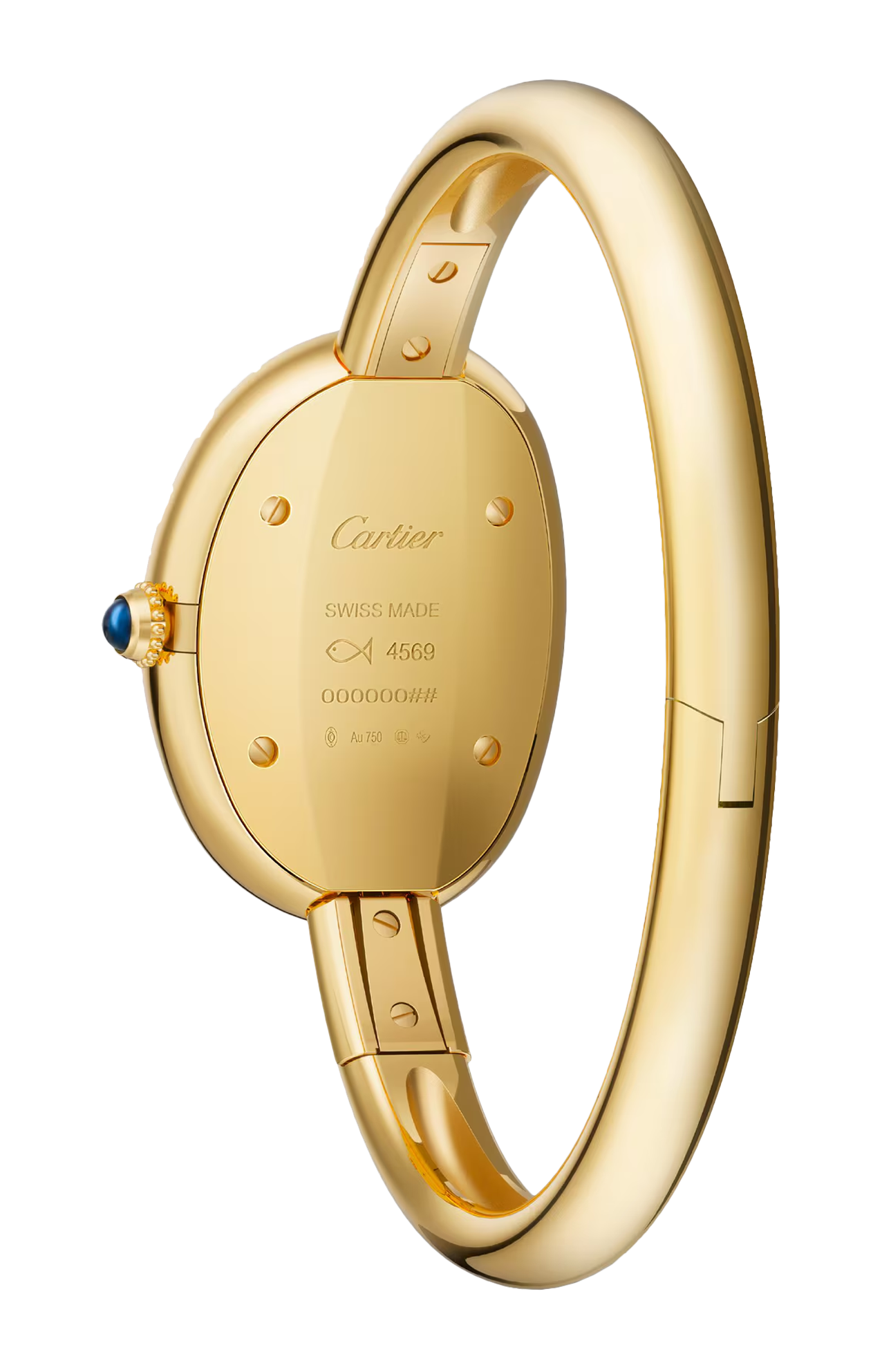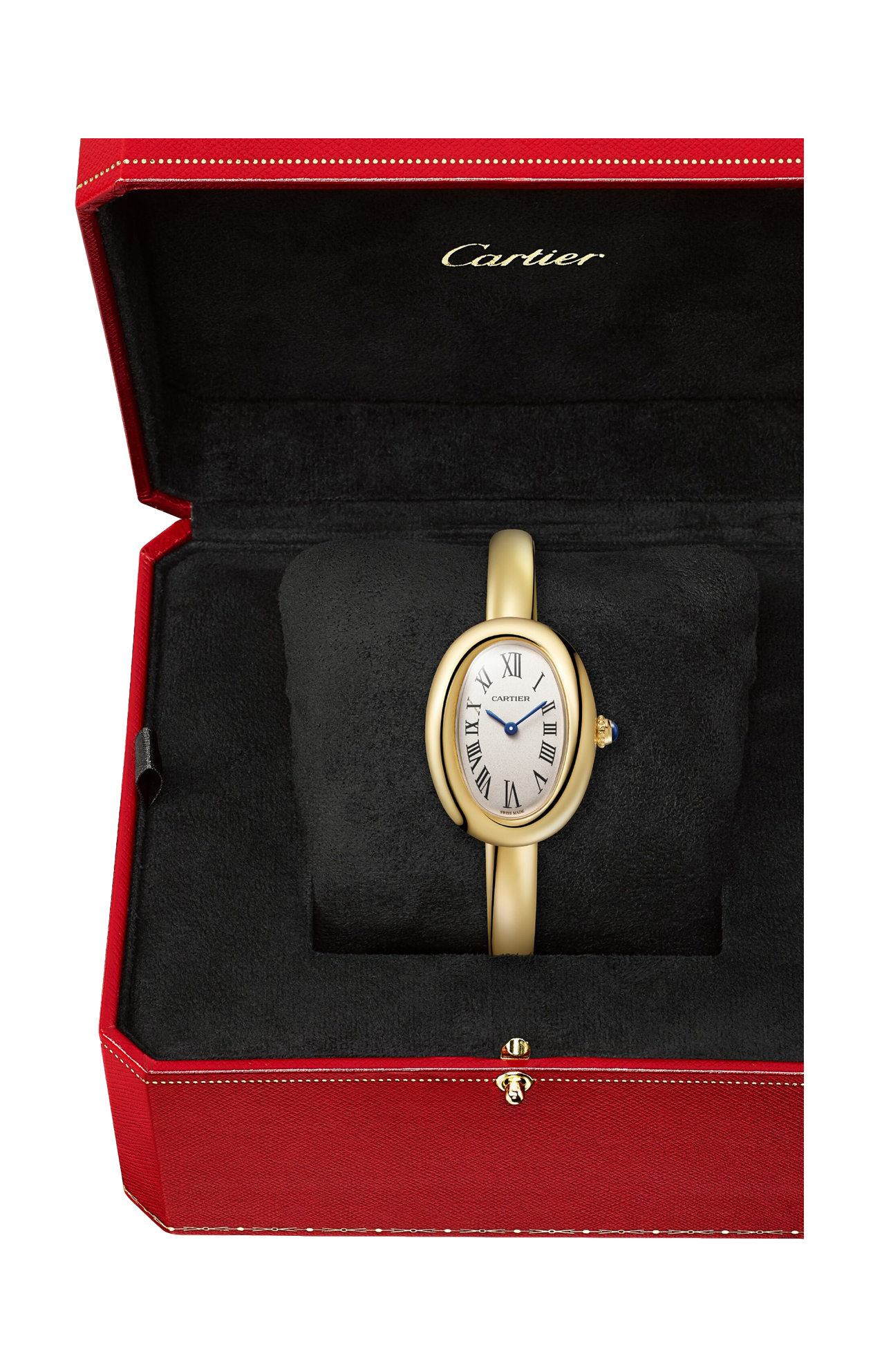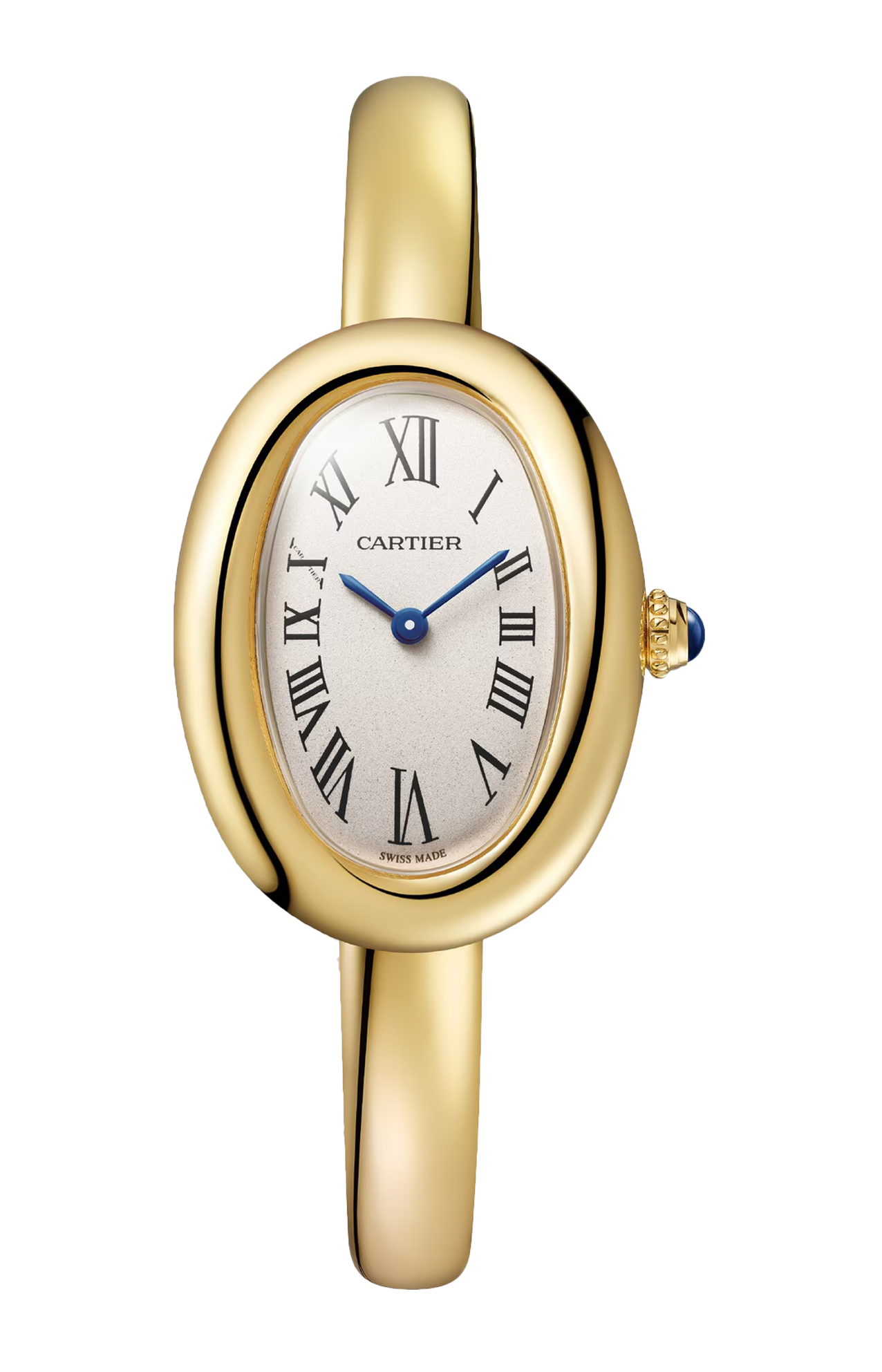 Orologio Baignoire de Cartier, modello piccolo, misura 16, movimento al quarzo. Cassa in oro giallo 18 carati (750/1000). Corona perlata in oro giallo 18 carati (750/1000) incastonata con un cabochon di zaffiro. Bracciale rigido in oro giallo 18 carati (750/1000). Quadrante argentato, lancette a forma di spada in acciaio azzurrato, vetro zaffiro. Lunghezza: 31,4 mm, larghezza: 23,1 mm, spessore: 6,9 mm. Impermeabile fino a 3 bar (circa 30 metri/100 piedi).
