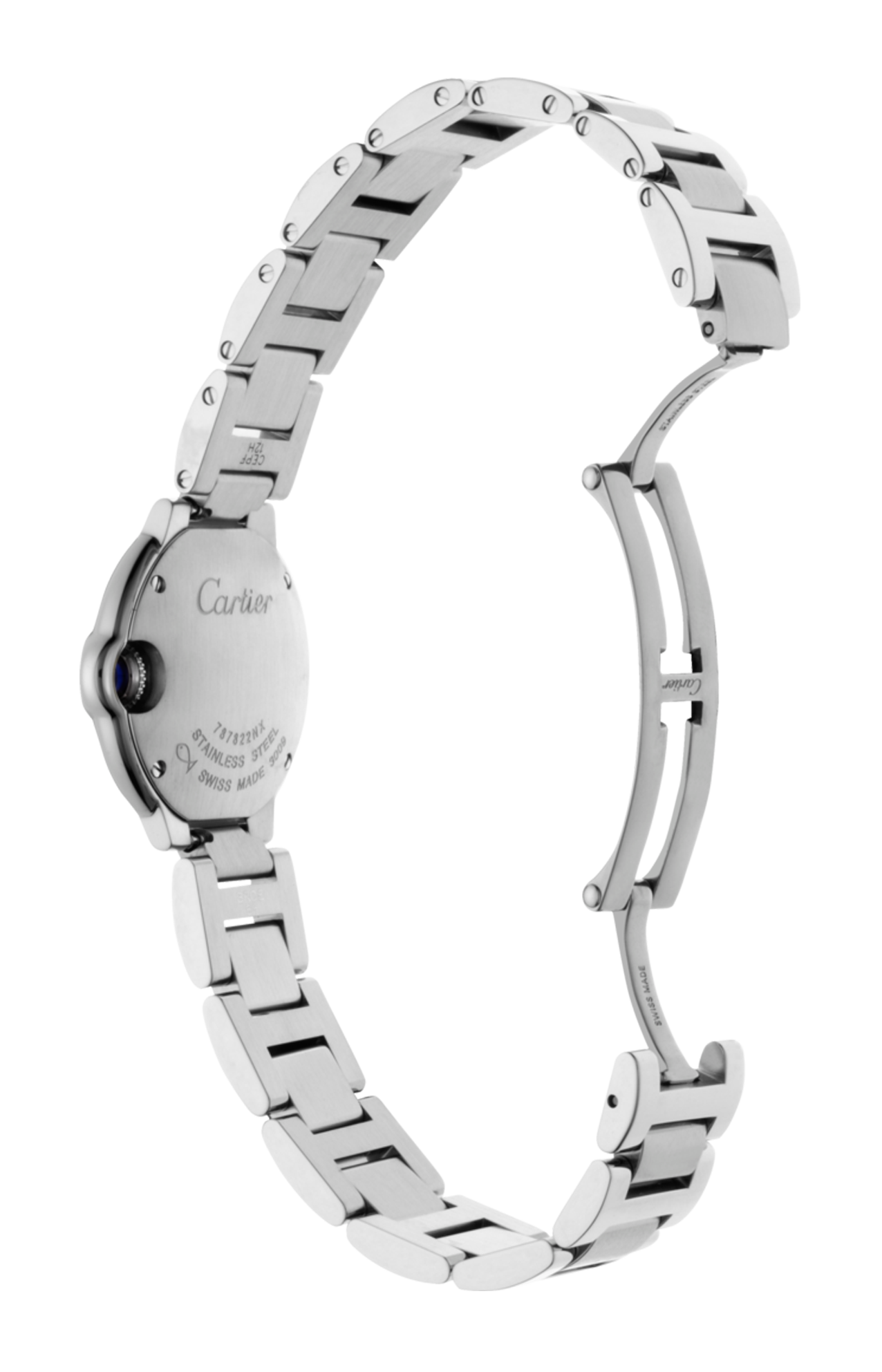 Orologio Ballon Bleu de Cartier, 28 mm, movimento al quarzo. Cassa in acciaio, corona scanalata ornata di uno spinello sintetico cabochon, quadrante opalino argentato, numeri romani, lancette a forma di gladio d’acciaio azzurrato, vetro zaffiro. Bracciale intercambiabile in acciaio. Dimensioni cassa: diametro 28,6 mm, spessore 9,35 mm. Impermeabile fino a 30 metri.
