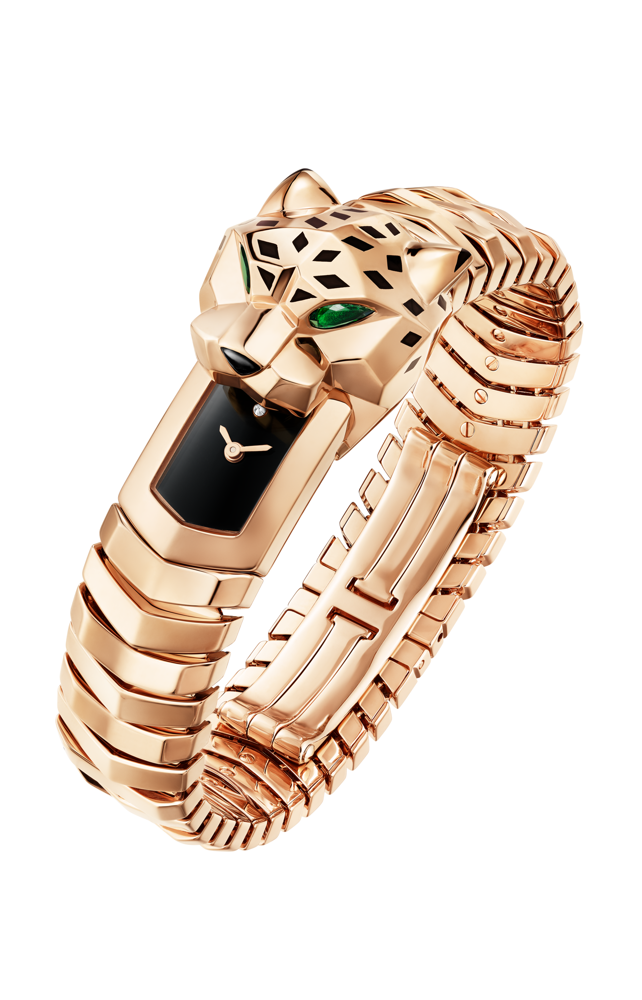Orologio La Panthère de Cartier, 38,2 mm, movimento al quarzo. Cassa e testa di pantera in oro rosa 750/1000, occhi di tsavorite forma poire, naso in onice suiффé, macchie in lacca nera, quadrante laccato nero, lancette a forma di gladio d’acciaio, vetro zaffiro, bracciale in oro rosa 750/1000. Spessore della cassa 7,53 mm. Impermeabile fino a 30 metri.