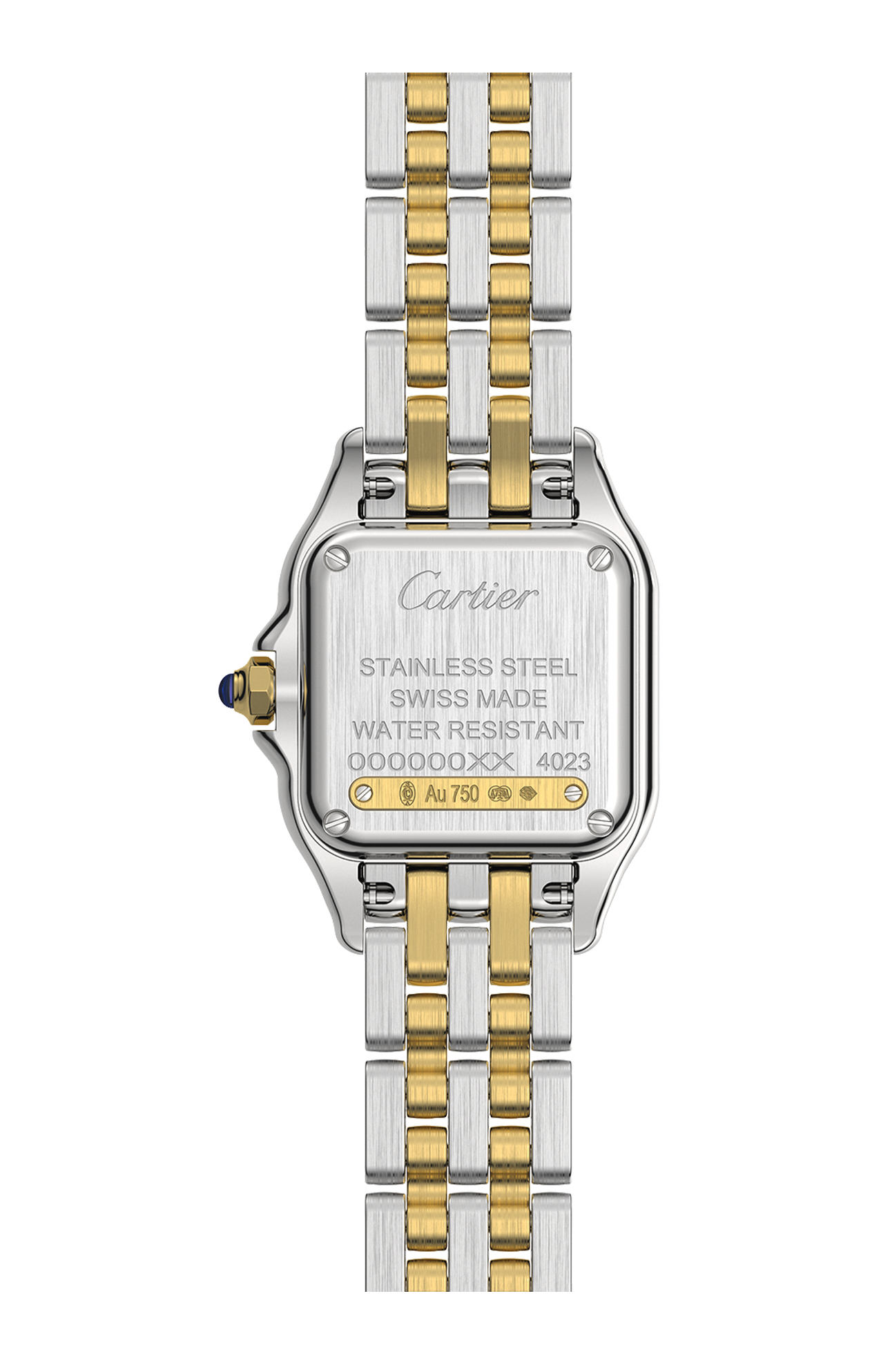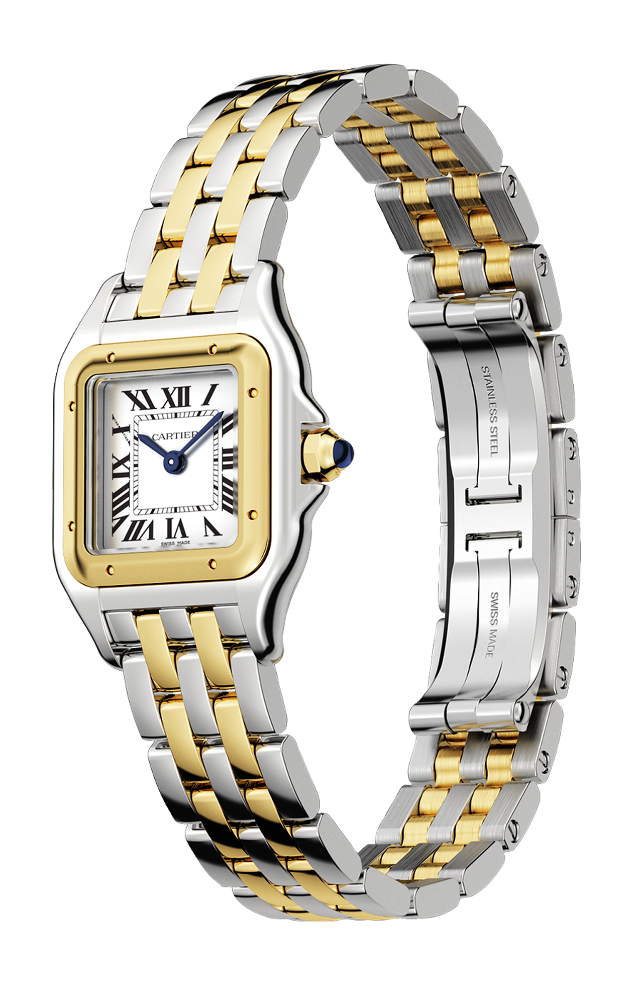Orologio Panthère de Cartier, modello piccolo, movimento a quarzo. Cassa in oro giallo 750/1000 e acciaio, dimensioni 23 x 30 mm, spessore 6 mm, corona ornata di uno spinello sintetico blu, quadrante argentato, lancette a forma di gladio d'acciaio azzurrato, bracciale in oro giallo 750/1000 e acciaio, impermeabile fino a 30 metri.