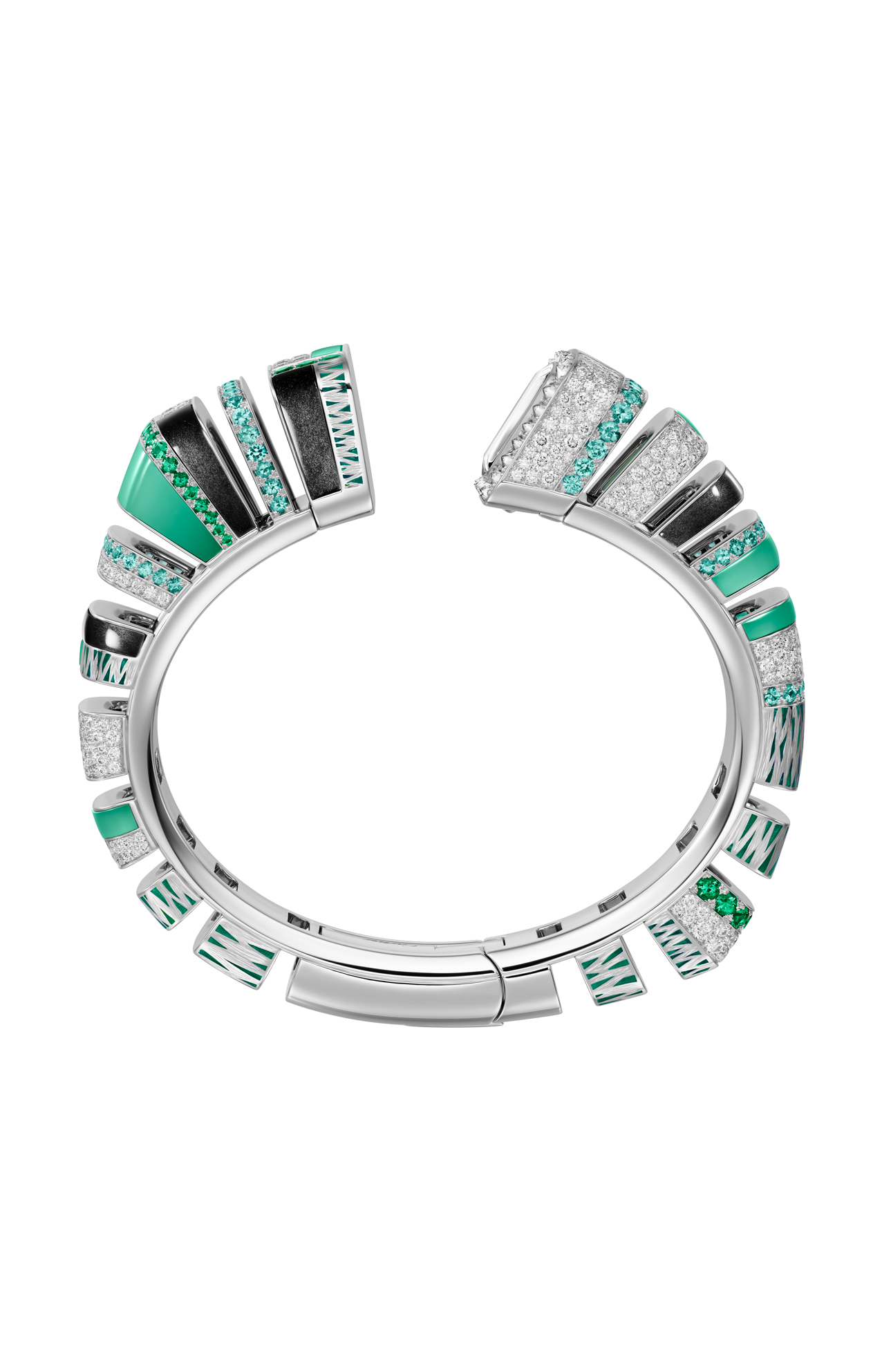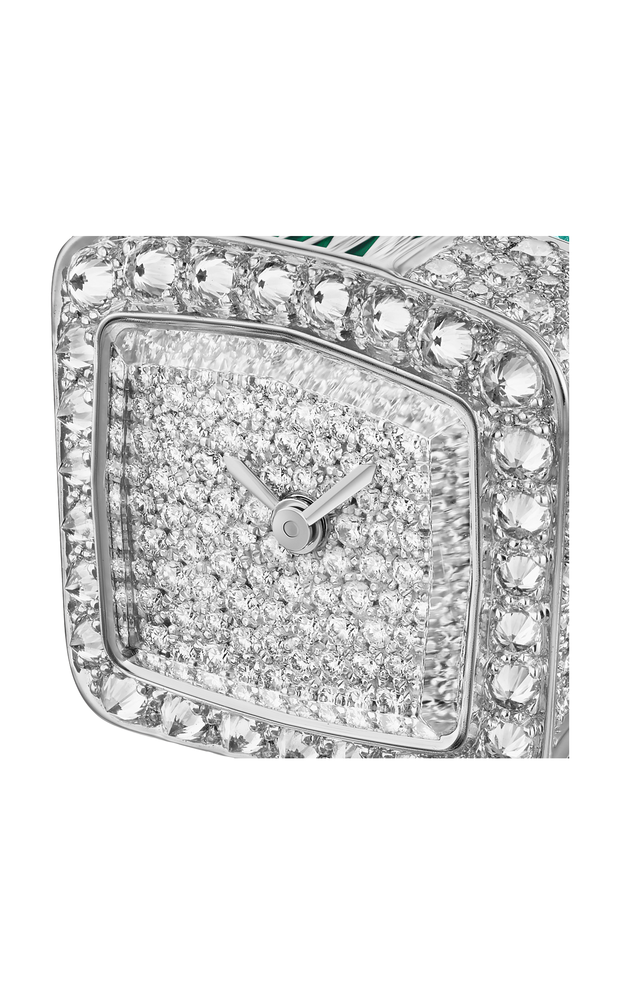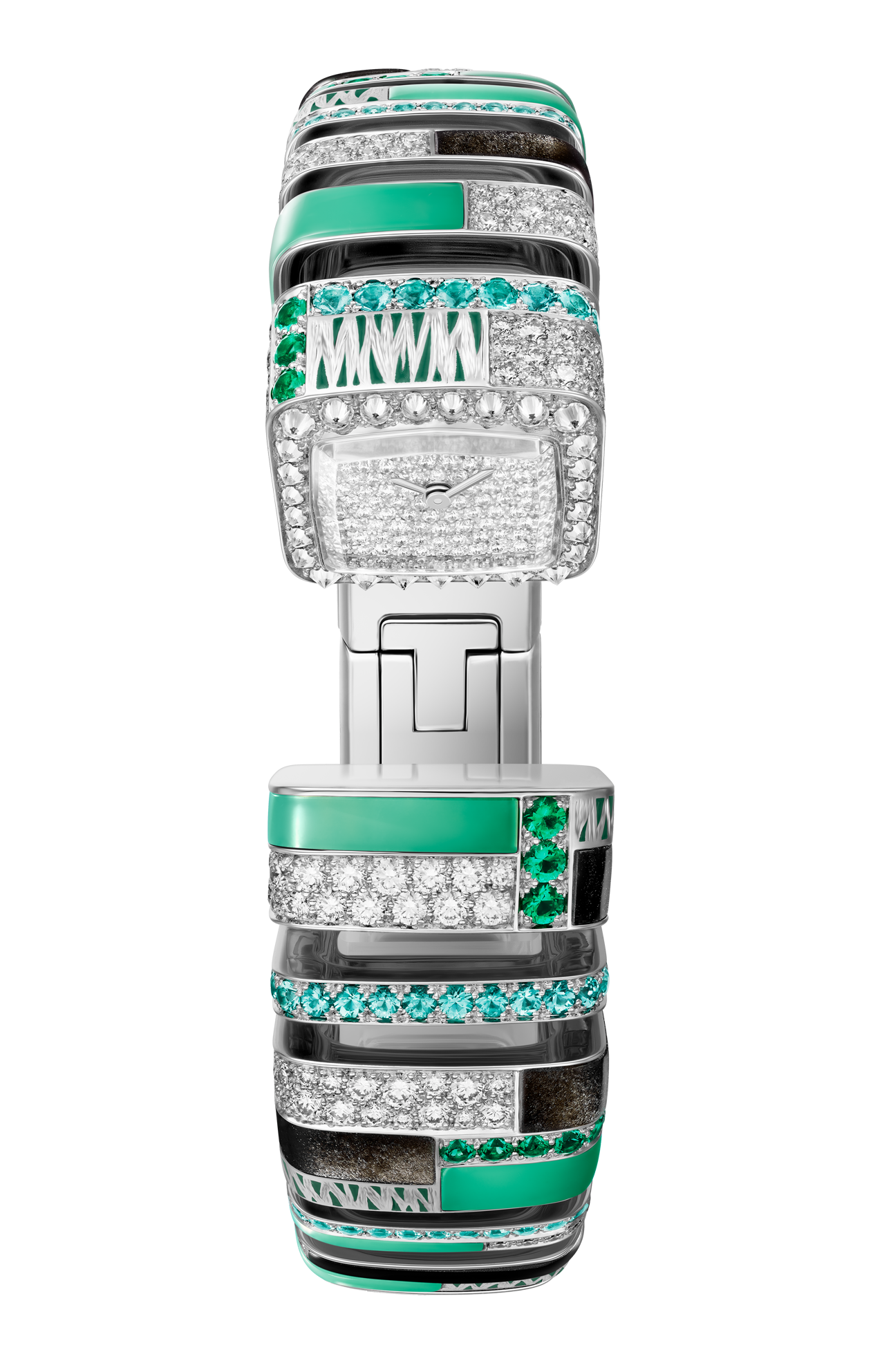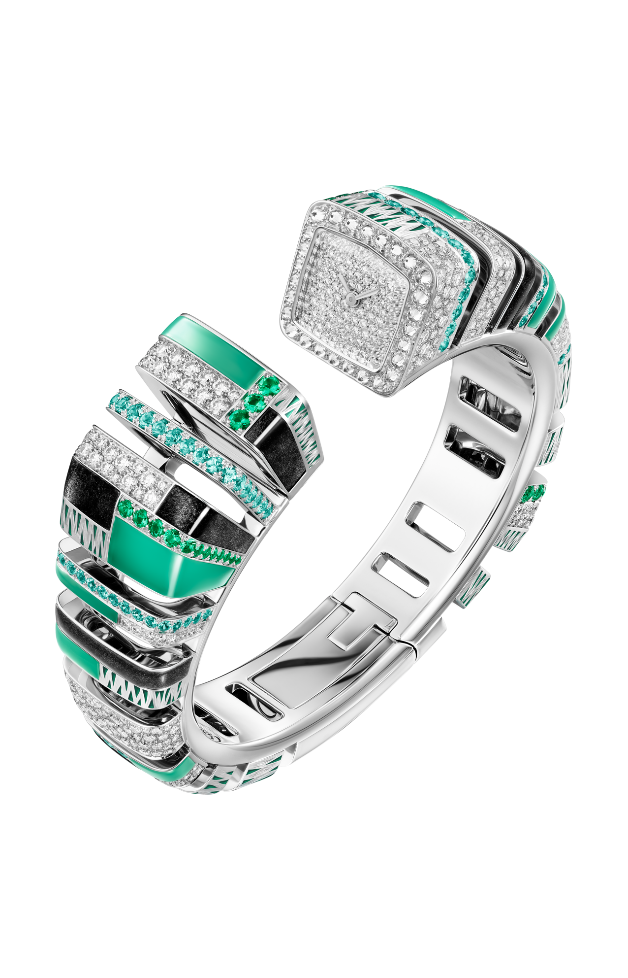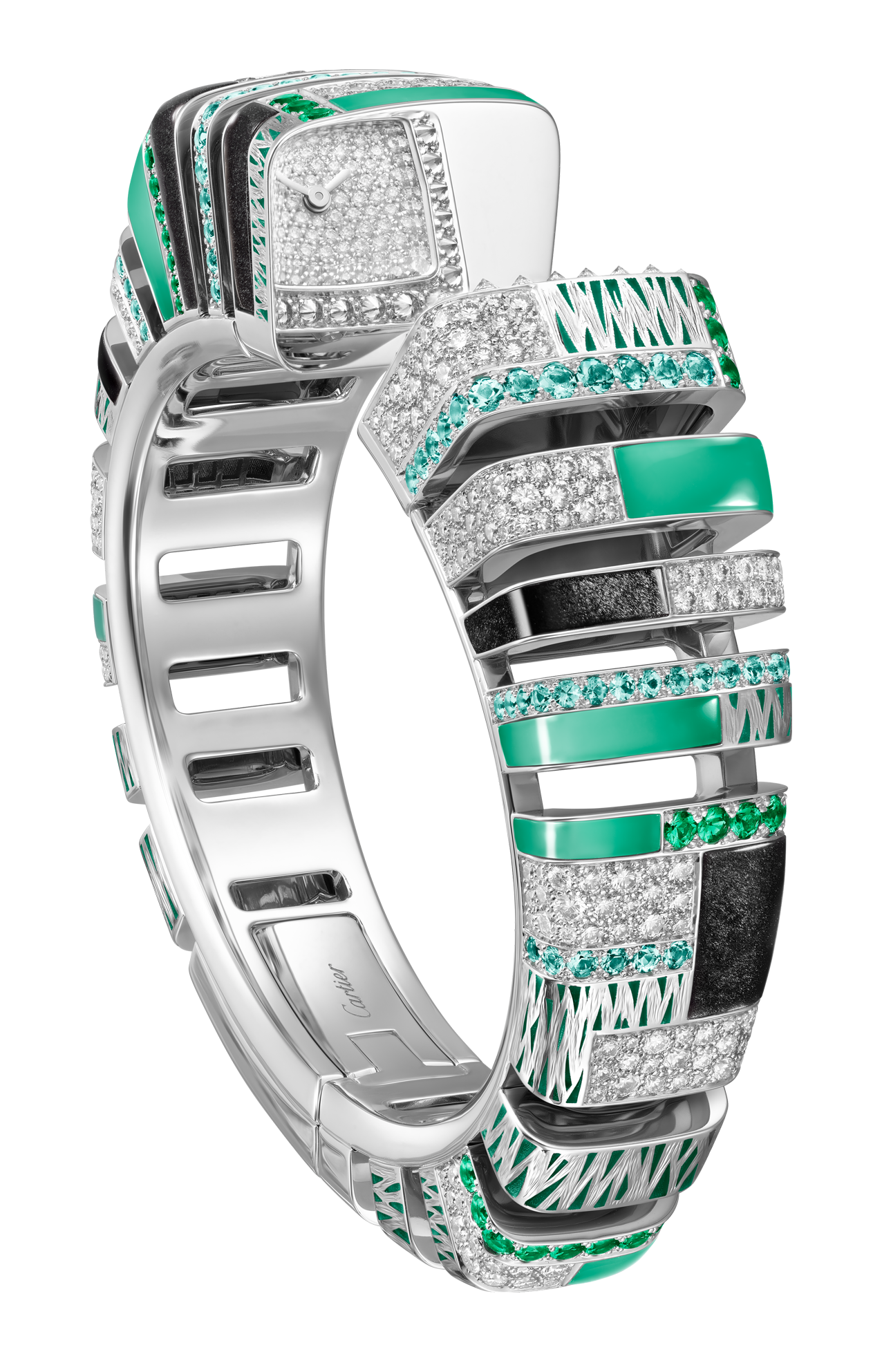 Orologio Reflection de Cartier, movimento al quarzo. Cassa in oro bianco rodiato 750/1000 ornata di 95 diamanti taglio brillante (1,19 carati), crisopazio, ossidiana, smeraldi, tormaline paraiba. Bracciale in oro bianco rodiato 750/1000 ornato di 264 diamanti taglio brillante (2,47 carati), crisopazio, ossidiana, smeraldi e tormaline paraiba. Quadrante in oro bianco rodiato 750/1000 ornato di 106 diamanti taglio brillante (0,41 carati). Lancette a forma di gladio d’acciaio finitura rodiata, vetro zaffiro. Dimensioni della cassa 18,4 x 17,5 mm, spessore 8,9 mm. Impermeabile fino a 30 metri.