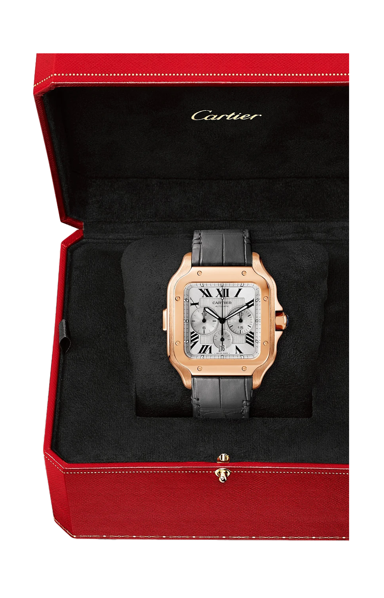 Orologio Santos, modello extra-large, movimento meccanico cronografo a carica automatica, calibro 1904 CH MC. Cassa in oro rosa 750/1000, corona ettagonale ornata di uno zaffiro sfaccettato, quadrante argentato satinato, lancette luminose a forma di gladio d’acciaio nero, vetro zaffiro. Primo cinturino d’alligatore semi-opaco grigio scuro, secondo cinturino in caucciù, fibbia pieghevole in oro rosa 750/1000. Entrambi sono dotati del sistema d’intercambiabilità QuickSwitch. Larghezza della cassa 43,3 mm, spessore 12,4 mm. Impermeabile fino a 100 metri.