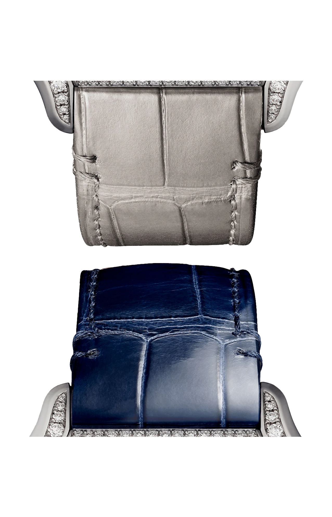 Orologio Santos, modello medio, movimento meccanico a carica automatica, calibro 1847 MC. Cassa in oro bianco rodiato 750/1000, lunetta e cassa ornate di diamanti taglio brillante. Corona ettagonale in oro bianco rodiato 750/1000 ornata di uno zaffiro sfaccettato, quadrante effetto soleil, lancette a forma di gladio d’acciaio azzurrato, vetro zaffiro. Due cinturini d’alligatore dotati del sistema d’intercambiabilità QuickSwitch, fibbia pieghevole intercambiabile in oro bianco rodiato 750/1000. Larghezza della cassa 35,1 mm, spessore 8,83 mm. Impermeabile fino a 100 metri.
