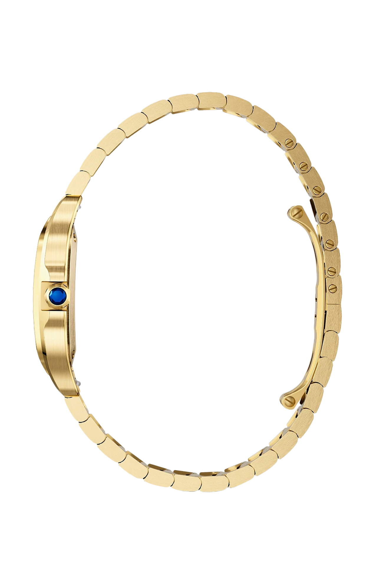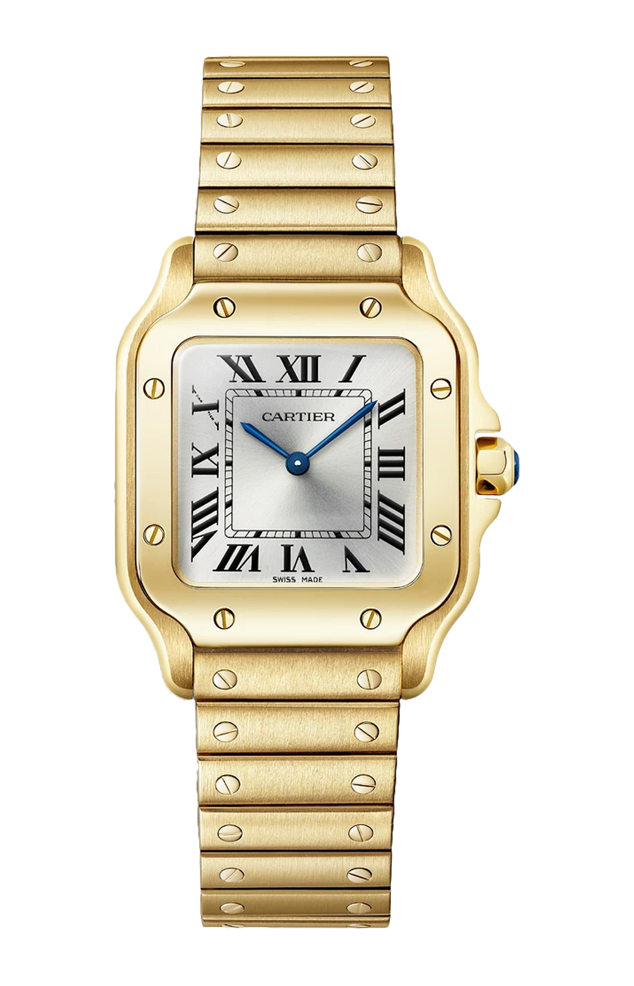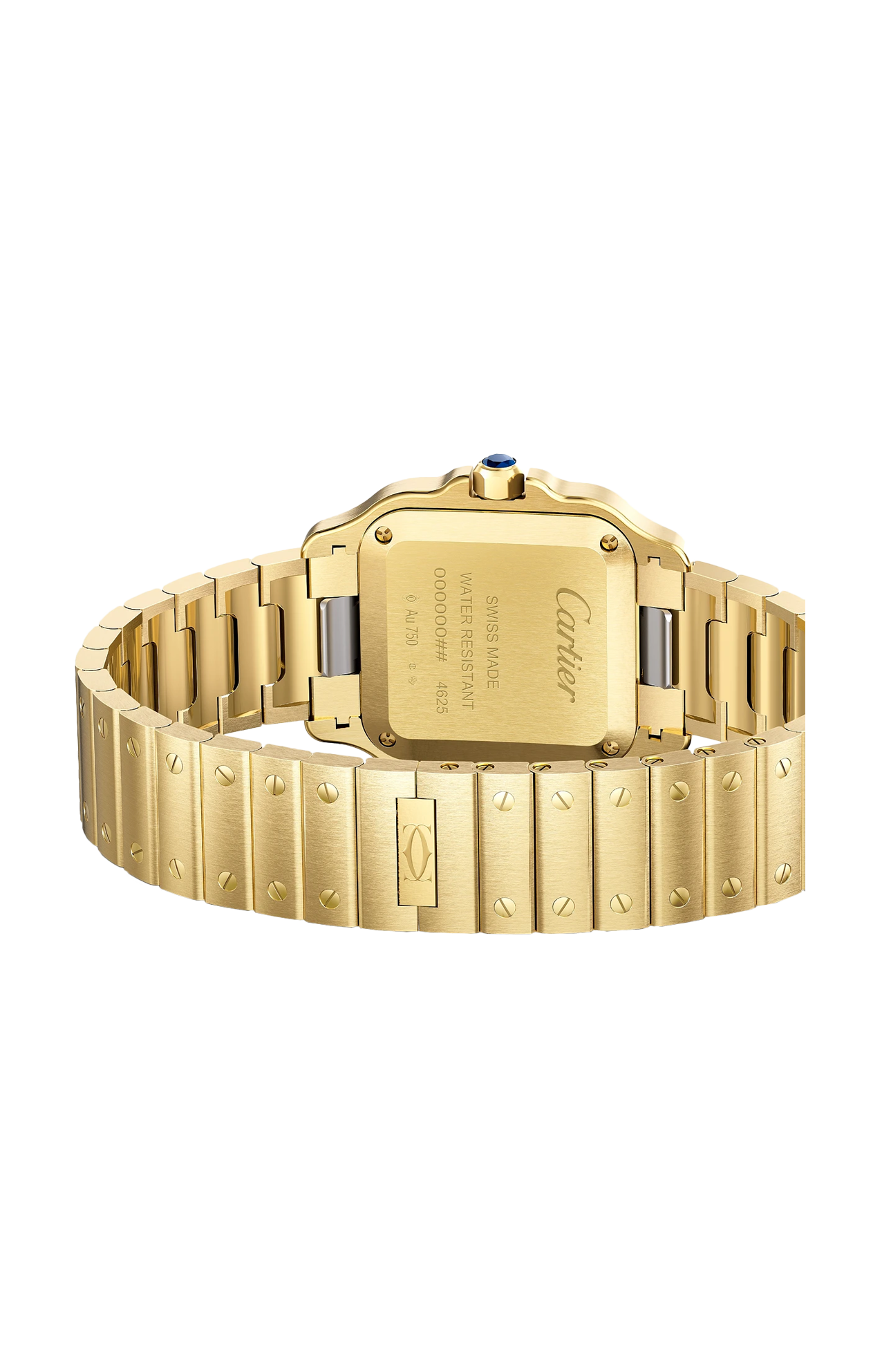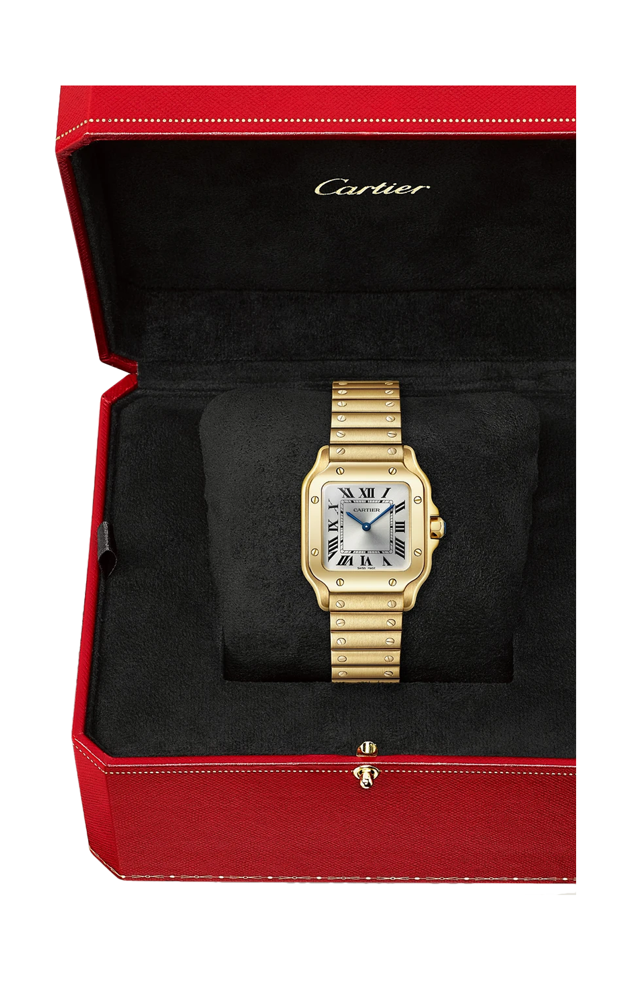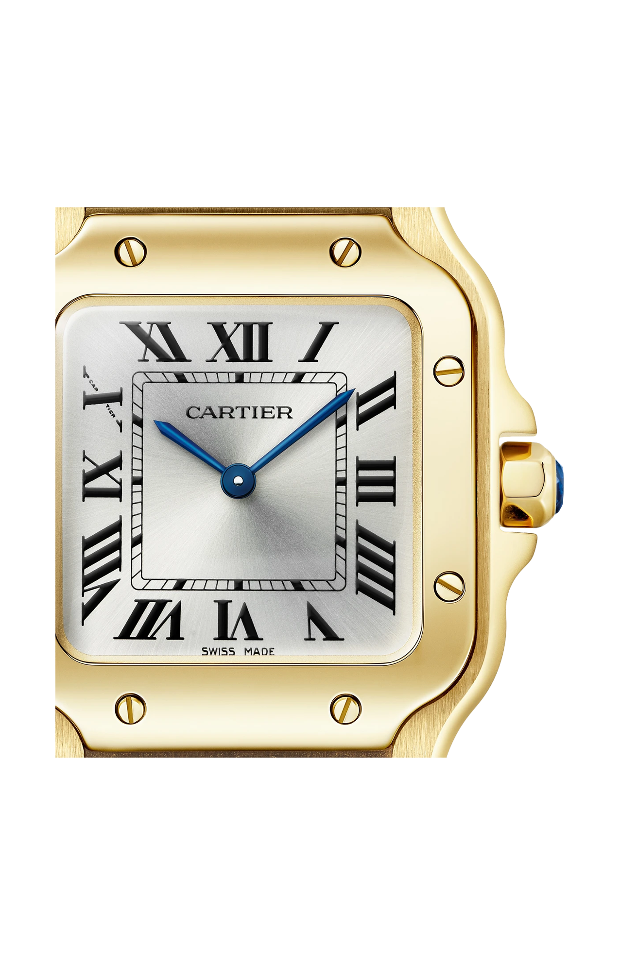 Orologio Santos de Cartier, modello piccolo, movimento al quarzo. Cassa e lunetta in oro giallo 750/1000, corona ettagonale ornata di uno zaffiro blu sfaccettato, lancette a forma di gladio d’acciaio azzurrato, vetro e fondocassa in vetro zaffiro. Bracciale in oro giallo 750/1000. Secondo cinturino in pelle di alligatore, fibbia pieghevole a doppia regolazione in oro rosa 750/1000. Ore, minuti con ponti scheletrati a forma di numeri romani. Dimensioni 27 x 34,5 mm, spessore 7,08 mm. Impermeabile fino a 30 metri.