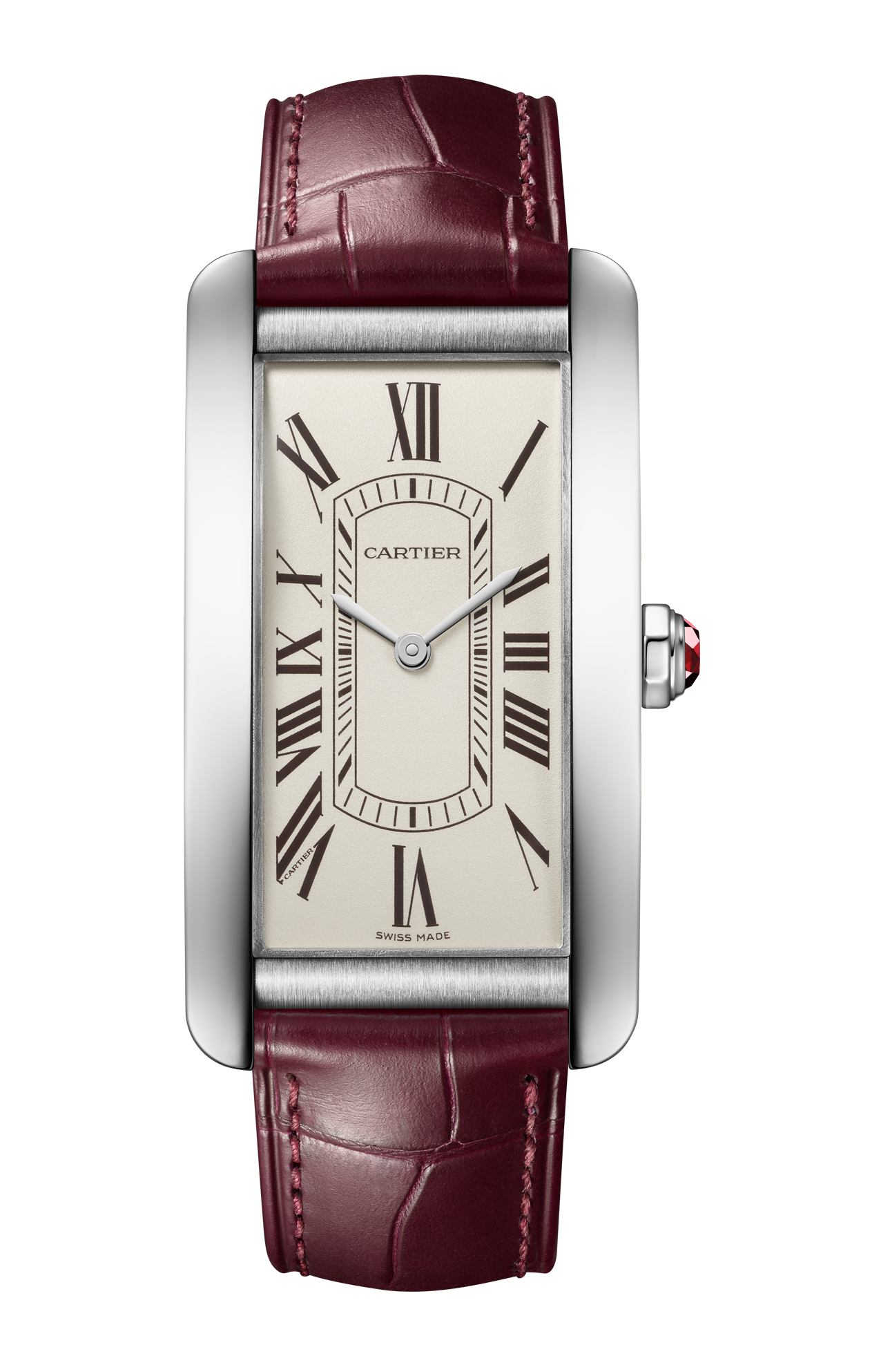 Orologio Tank Américain, modello grande, movimento meccanico a carica automatica. Cassa in platino 950/1000, corona poligonale ornata di un rubino sfaccettato. Quadrante grené con finitura guscio d’uovo, lancette a forma di gladio d’acciaio argentato, vetro zaffiro. Cinturino in alligatore bordeaux semi-opaco, fibbia pieghevole intercambiabile in oro bianco 750/1000. Dimensioni della cassa: 44,4 x 24,4 mm, spessore: 8,6 mm. Impermeabile fino a 30 metri.