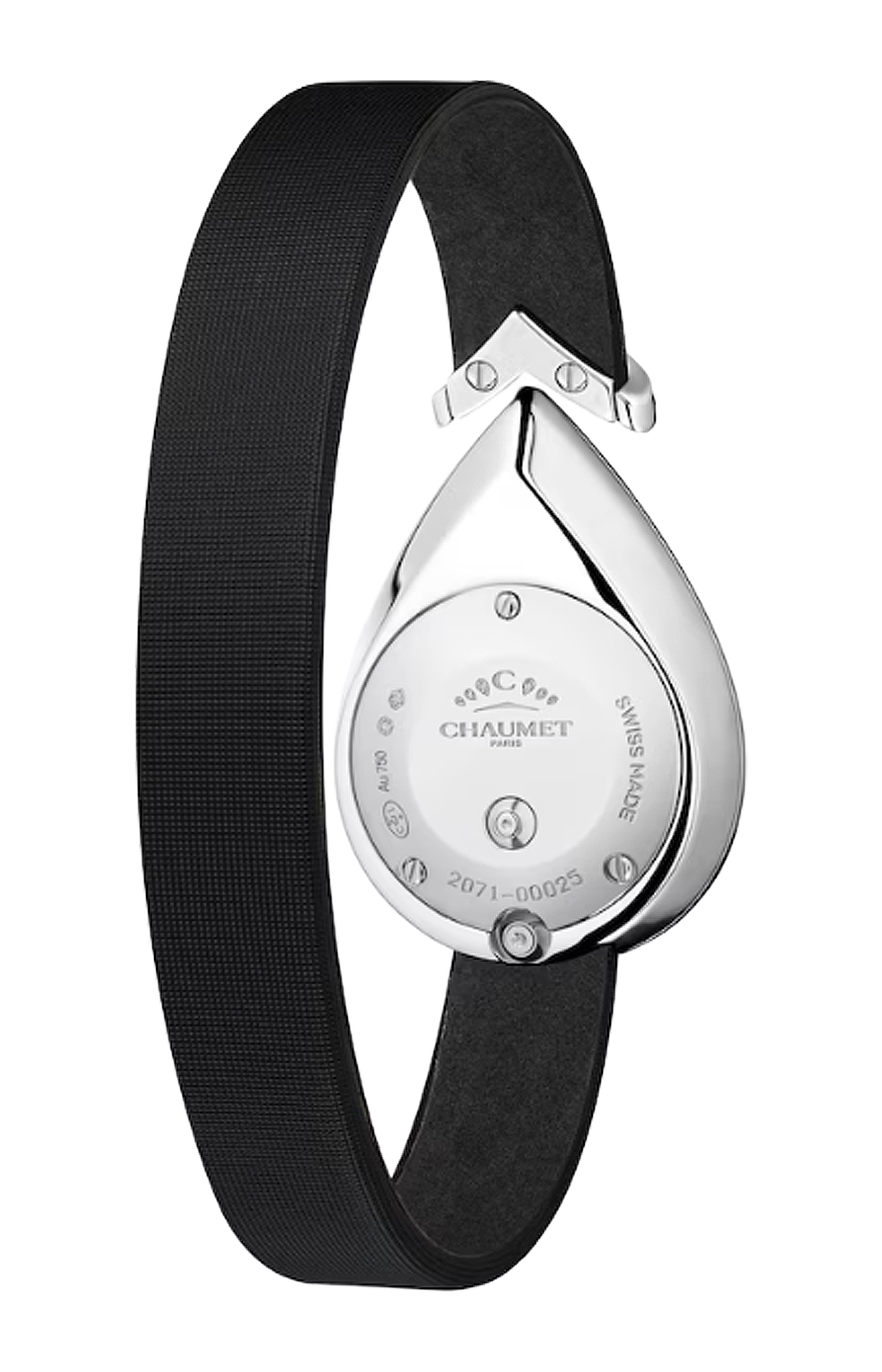 DISPONIBILE IN VARIE MISURE, IL CINTURINO IN RASO NERO AVVOLGE IL POLSO IN MODO UNICO, SENZA GIUNTURE NÉ FIBBIE. MOVIMENTO AL QUARZO.