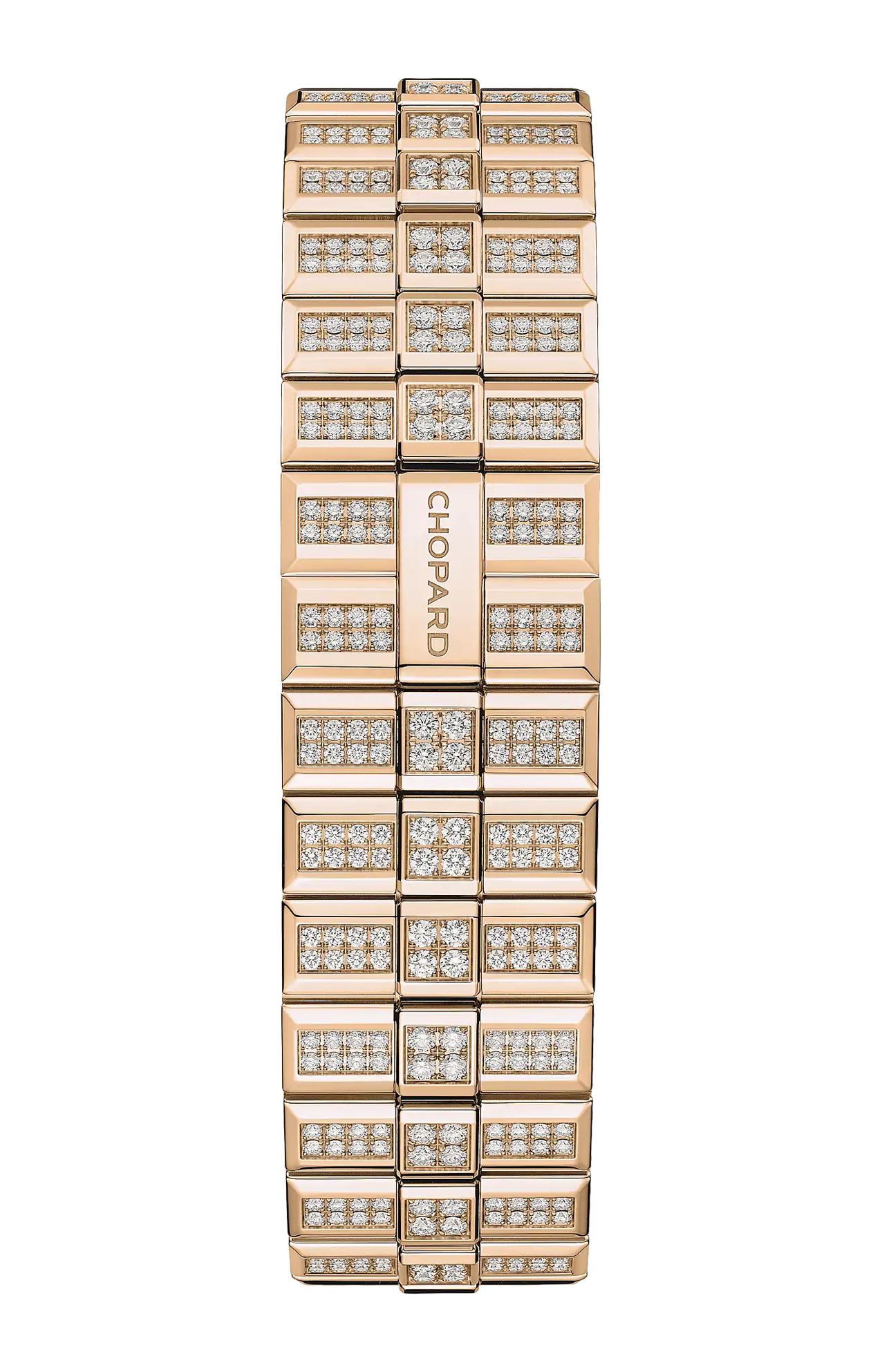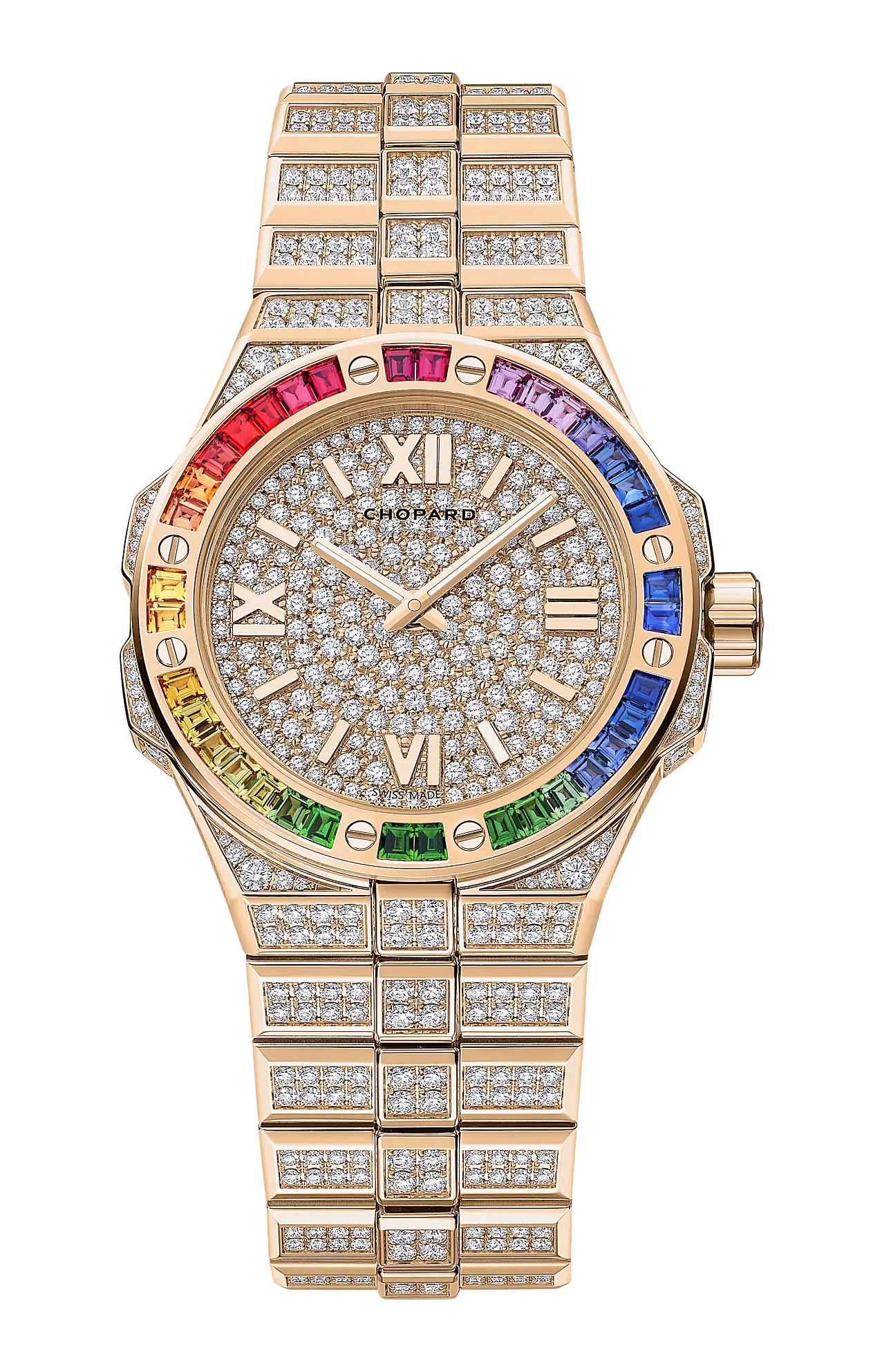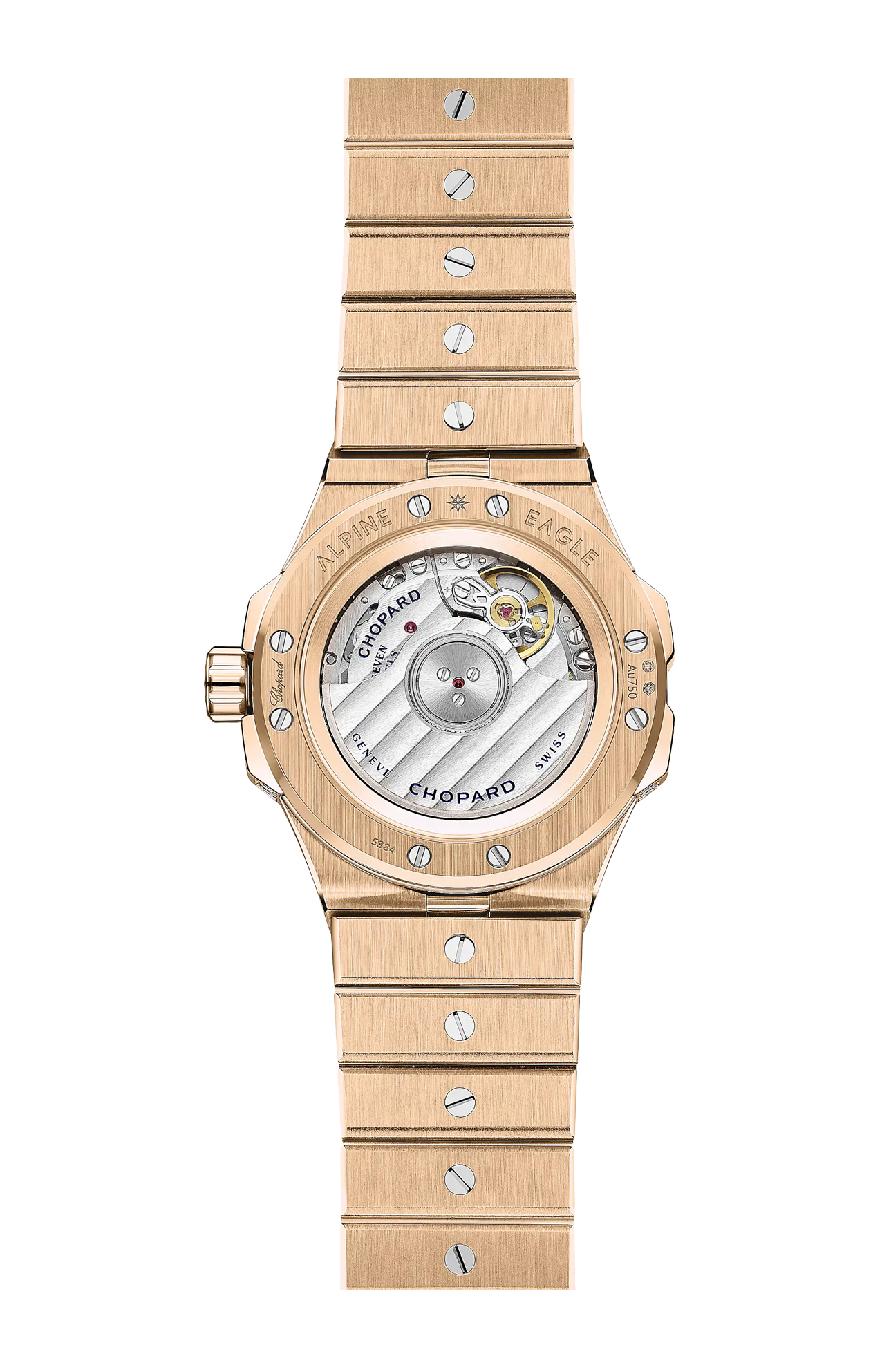 Ispirato alla grazia dell'aquila e alla maestosità delle Alpi, la collezione Alpine Eagle presenta il modello Alpine Eagle 33 Frozen. Realizzato in oro rosa etico 18 carati, la sua cassa, del diametro di 33 mm, e il bracciale integrato sono interamente tempestati di diamanti, mentre la lunetta è impreziosita da zaffiri con taglio a trapezio. Questa versione gioiello dell’orologio dedicato alle “aquile contemporanee”, la cui perizia tecnica è all’altezza della sua raffinatezza estetica, è equipaggiata dal movimento Chopard 09.01-C a carica automatica con 42 ore di riserva di carica. Grazie all'abbondanza di diamanti, simili a minuscoli fiocchi di neve luccicanti sulle vette delle Alpi, questo segnatempo risplende di un'aura etica e responsabile.