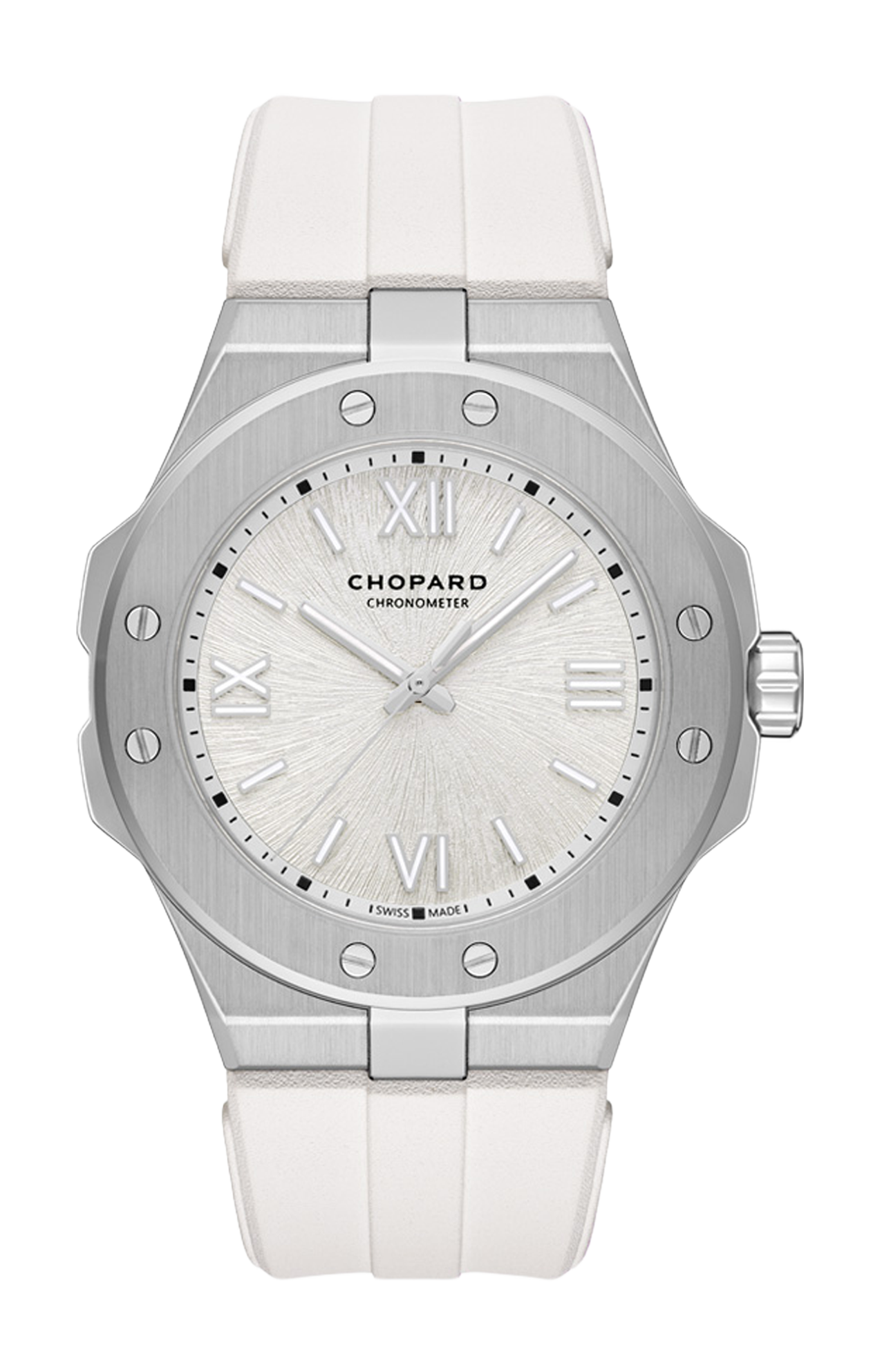 Orologio Alpine Eagle 12 3/4", Chopard, 01.15-C, movimento meccanico a carica automatica, quadrante: bianco, numeri romani 4/4, cronometro certificato (COSC), riserva di carica di circa 60 ore, trentuno (31) rubini, 4 Hz (28.800. vibrazioni orarie), ore, minuti e secondi centrali, vetro zaffiro antiriflesso, impermeabile fino a 100 metri. Fibbia in acciaio.