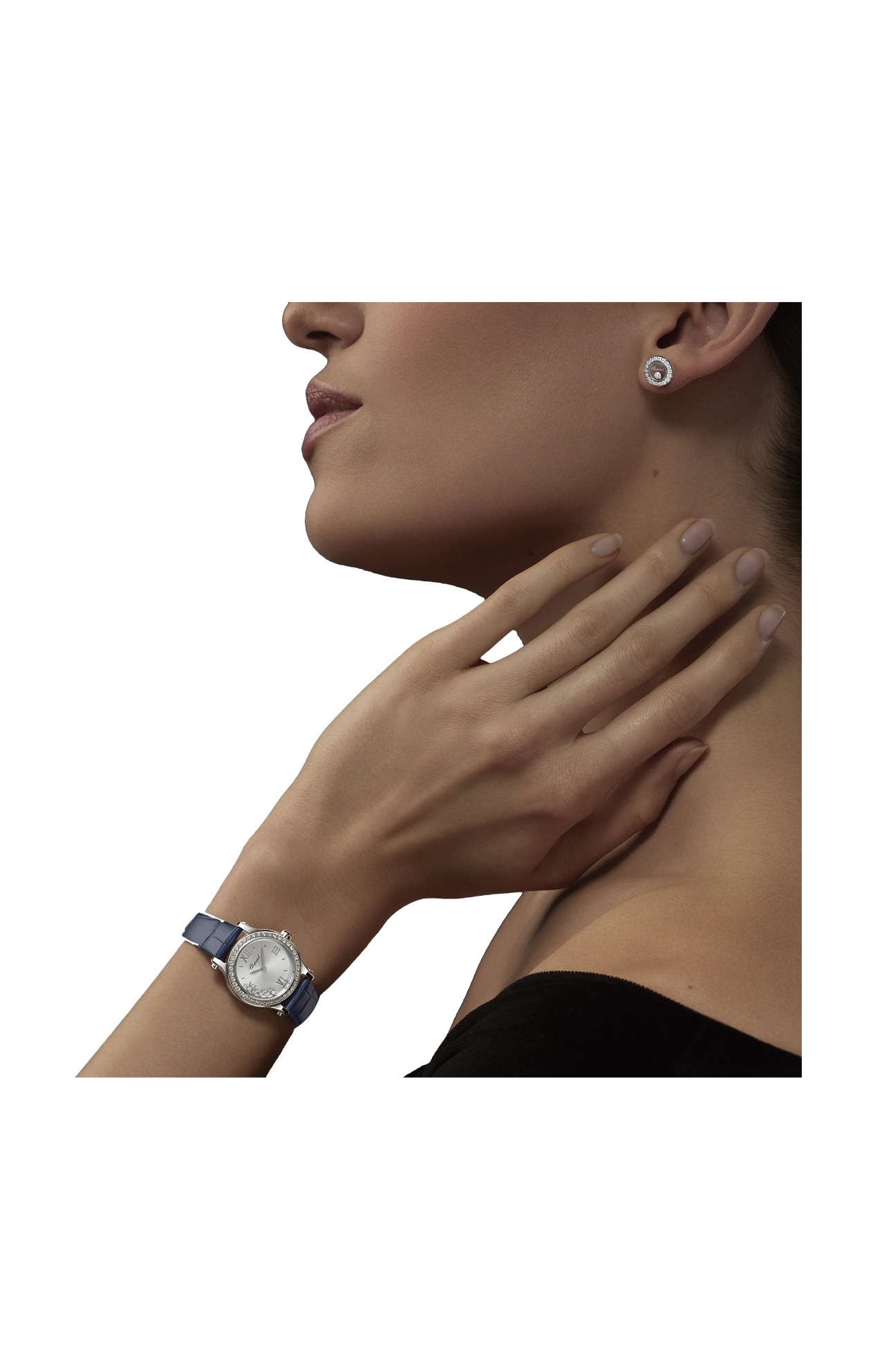 La collezione Happy Sport è l'emblema della creatività e dell'audacia di Chopard. Le sue gioiose pietre preziose, che danzano liberamente tra due vetri zaffiro, fanno sognare sin dal 1993, quando Chopard è diventata la prima maison a coniugare acciaio e diamanti. La grande competenza orologiera ha consentito a Chopard di dotare il modello Happy Sport da 33 mm di un movimento meccanico a carica automatica appositamente sviluppato per le casse dei modelli femminili. Little Diamonds Do Great Things.
