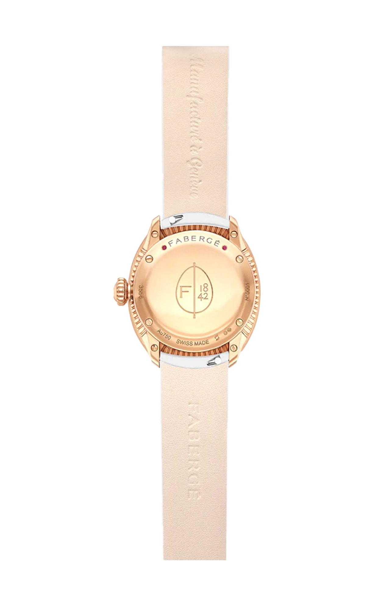 Il dettaglio a forma di uovo sulla lancetta delle ore e il datario ovale sono aggiunte originali a ciascun orologio, mentre i numeri in stile surrealista immediatamente riconoscibili offrono un look unico al quadrante. In vero stile Fabergé, ogni quadrante presenta un'incisione guilloché che, riflettendo la luce, crea un affascinante effetto perlato. Un ulteriore tocco divertente è dato dai cinturini intercambiabili, che possono essere facilmente rimossi e scambiati da chi li indossa. Ciò consente la possibilità di mescolare e abbinare per creare un look personalizzato. Mantieni un look chic con quadrante e cinturino abbinati, oppure osa osare con un look a contrasto. I cinturini sono realizzati in pelle di vitello e saranno disponibili in un'ampia gamma di opzioni di colore. Il tocco finale si trova sul fondello, con due rubini del Mozambico Gemfields estratti in modo responsabile, una sorpresa segreta che solo chi lo indossa conosce.