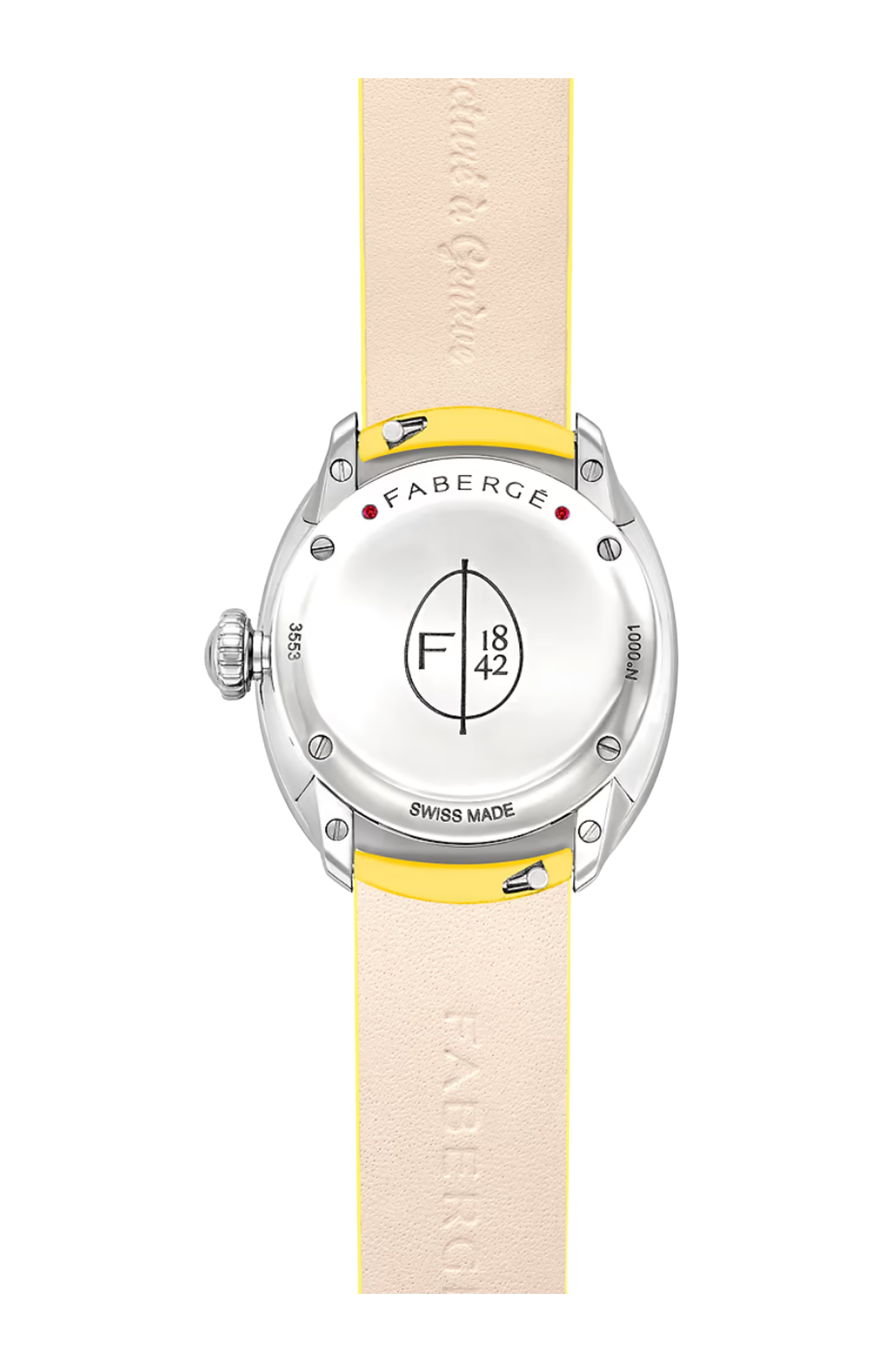 Fabergé ha introdotto gli orologi Eggsistence nella sua collezione Colours of Love , che celebra "Una vita a colori" attraverso l'uso di straordinarie pietre preziose colorate, colmando il divario tra gioielleria e orologi. Ispirata al simbolo più rappresentativo della Maison, l'uovo, questa nuova e giocosa collezione di orologi racchiude 180 anni di storia in un design contemporaneo, incarnando il fascino senza tempo di Fabergé . A carica automatica, questo stile presenta un'elegante cassa in acciaio inossidabile con zaffiri gialli sulla lunetta. La cassa presenta delicate scanalature sui lati, una caratteristica distintiva della nostra collezione Colours of Love , e numeri incastonati di diamanti, che consentono ai numeri di brillare e catturare la luce attraverso le diverse sfaccettature delle pietre preziose.