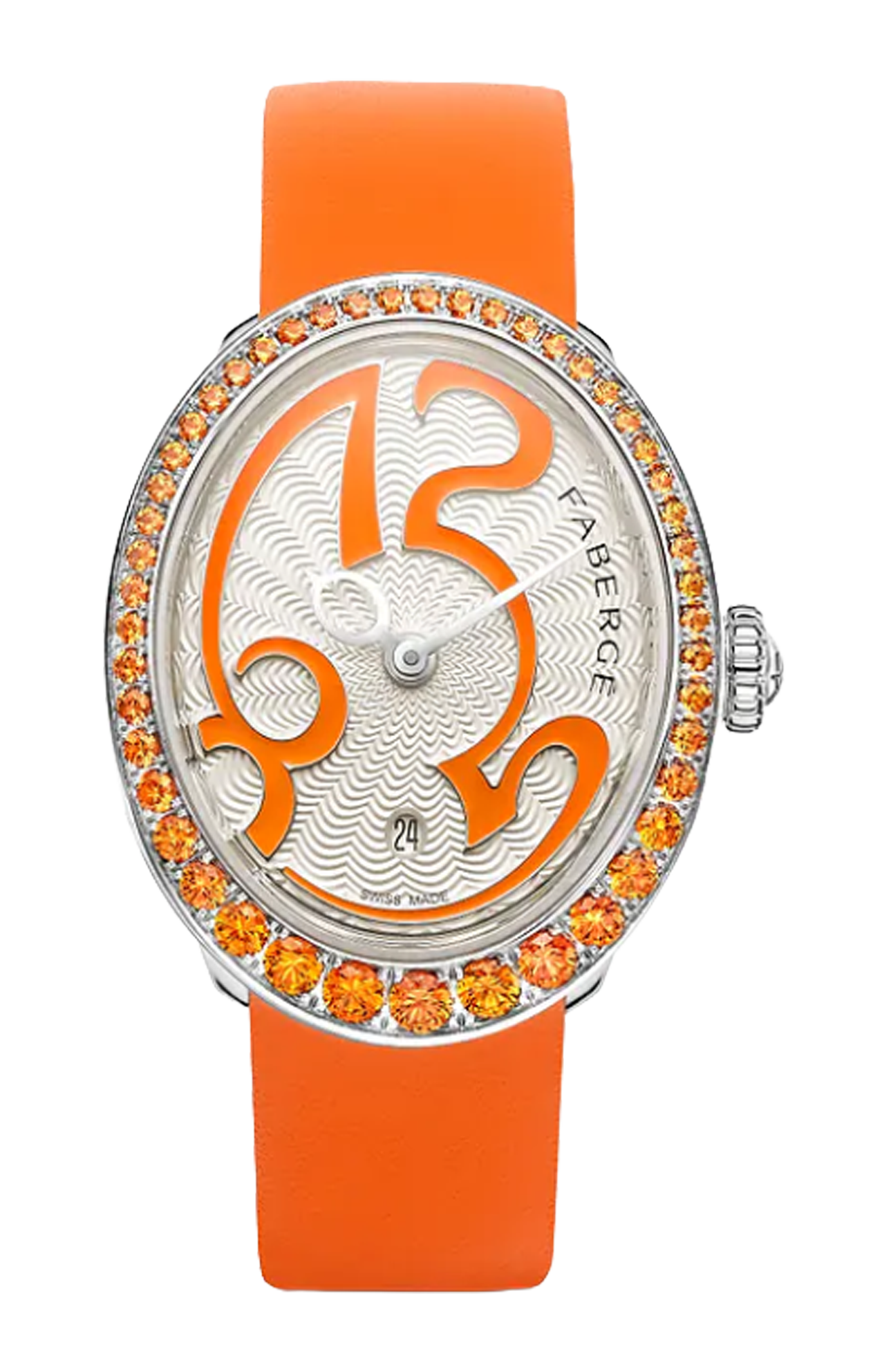 Fabergé ha introdotto gli orologi Eggsistence nella sua collezione Colours of Love , che celebra "Una vita a colori" attraverso l'uso di straordinarie pietre preziose colorate, colmando il divario tra gioielleria e orologi. Ispirata al simbolo più rappresentativo della Maison, l'uovo, questa nuova e giocosa collezione di orologi racchiude 180 anni di storia in un design contemporaneo, incarnando il fascino senza tempo di Fabergé . A carica automatica, questo stile presenta un'elegante cassa in acciaio inossidabile con zaffiri arancioni sulla lunetta. La cassa presenta delicate scanalature sui lati, una caratteristica distintiva della nostra collezione Colours of Love , e numeri incastonati di diamanti, che consentono ai numeri di brillare e catturare la luce attraverso le diverse sfaccettature delle pietre preziose.