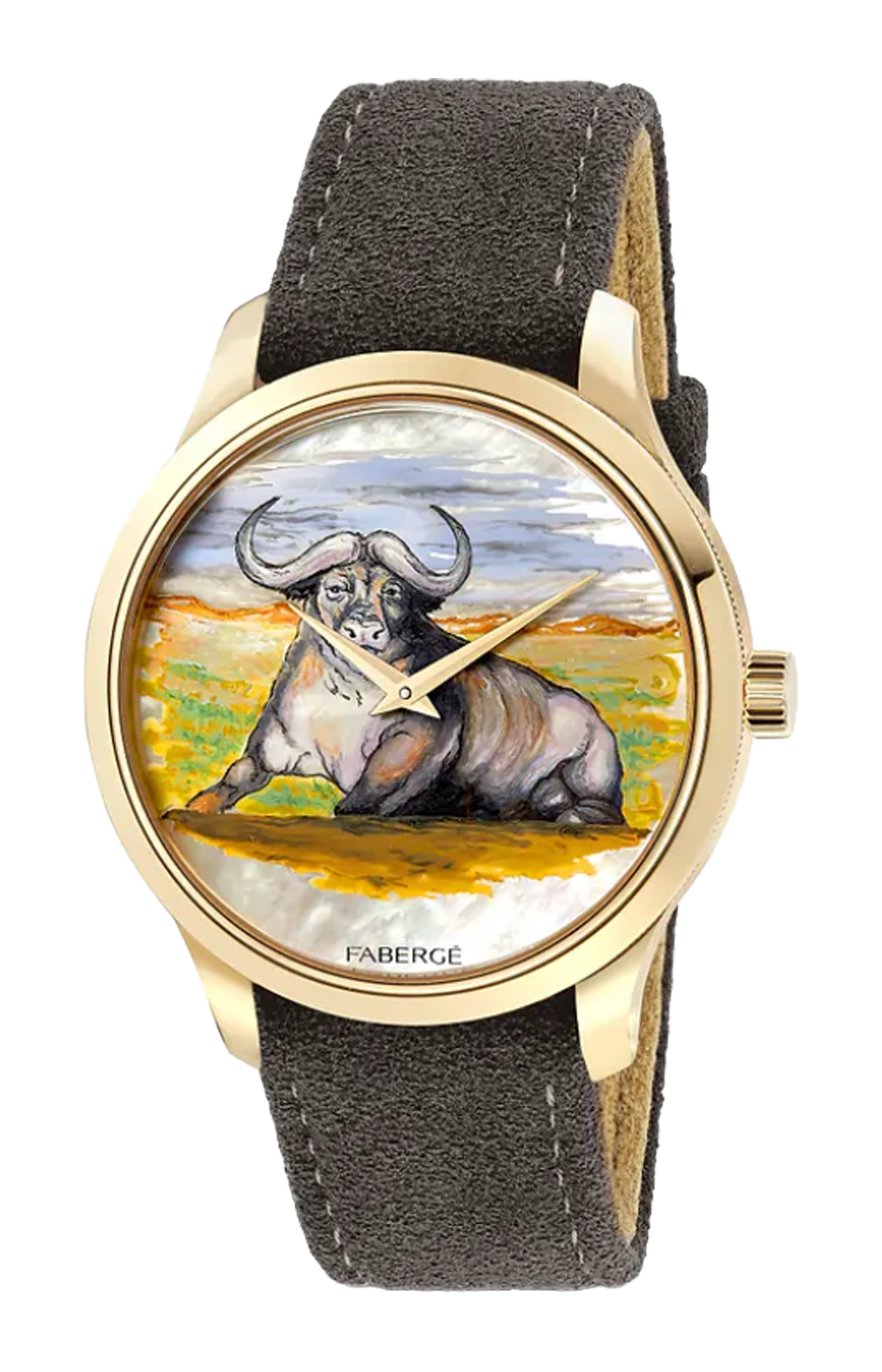 Parte della collezione Fabergé Altruist , opportunamente chiamata, a sostegno della Gemfields Foundation, questo orologio in edizione limitata rende omaggio a uno degli animali selvatici più iconici dell'Africa: il bufalo del Capo. Il maestro artigiano Fabergé André Martinez, specialista nella pittura artistica miniaturista sui quadranti degli orologi, ha dipinto a mano meticolosamente ogni quadrante per raffigurare questo meraviglioso animale. Questa creazione presenta una miniatura di un bufalo del Capo, applicata meticolosamente a mano su un quadrante in madreperla con lacche di qualità eccezionale.