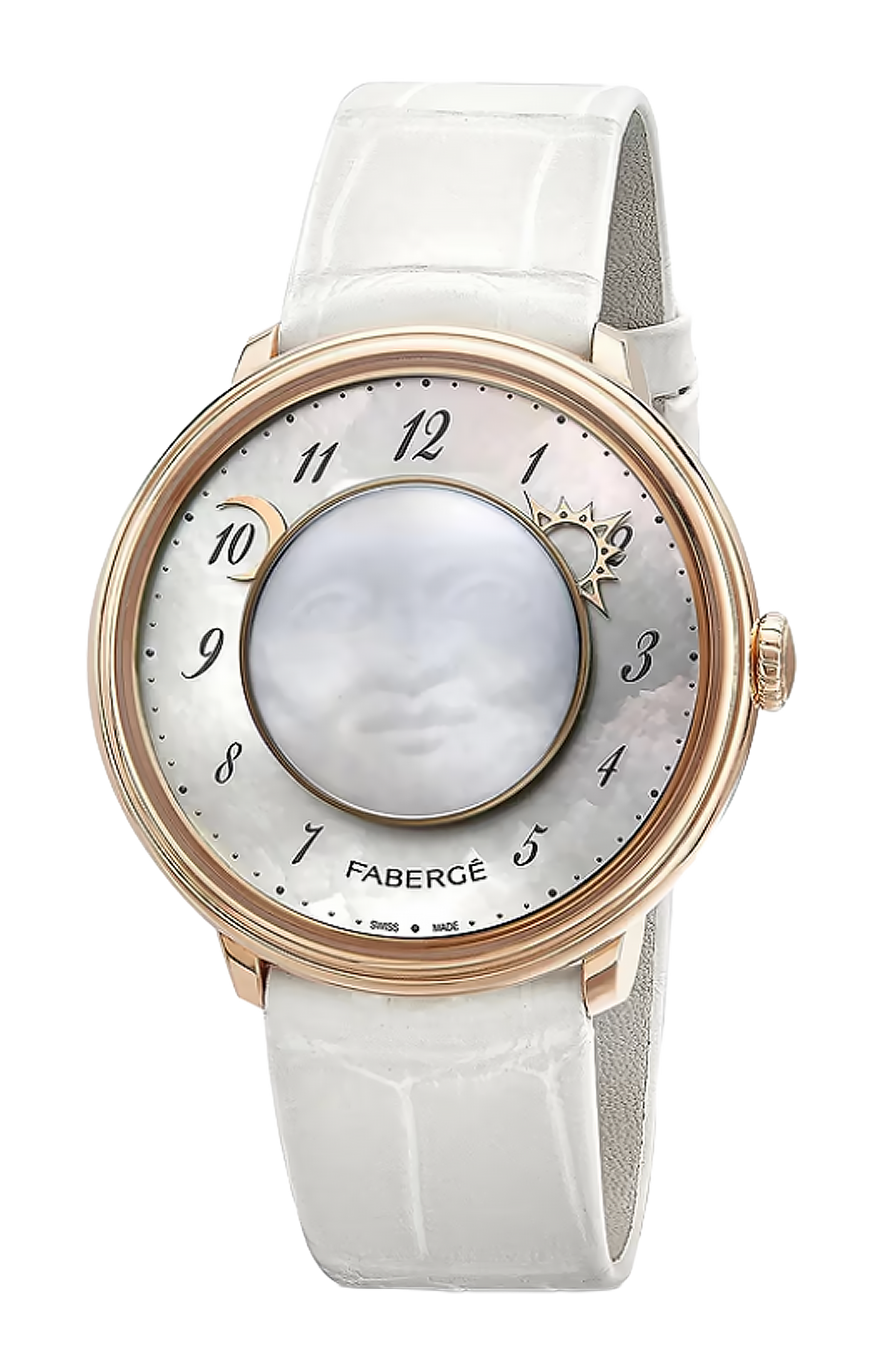 Fabergé Levity Timepiece presenta un quadrante esterno in madreperla bianca, una decorazione centrale in madreperla bianca sullo zaffiro bombato e un movimento a carica manuale, racchiuso in una cassa in oro rosa 18 carati da 36 mm, con cinturino in alligatore. La decorazione centrale presenta una decorazione a forma di uomo sulla luna, ispirata a un orologio da tavolo in argento dorato, smalto e cristallo di rocca creato da Peter Carl Fabergé.