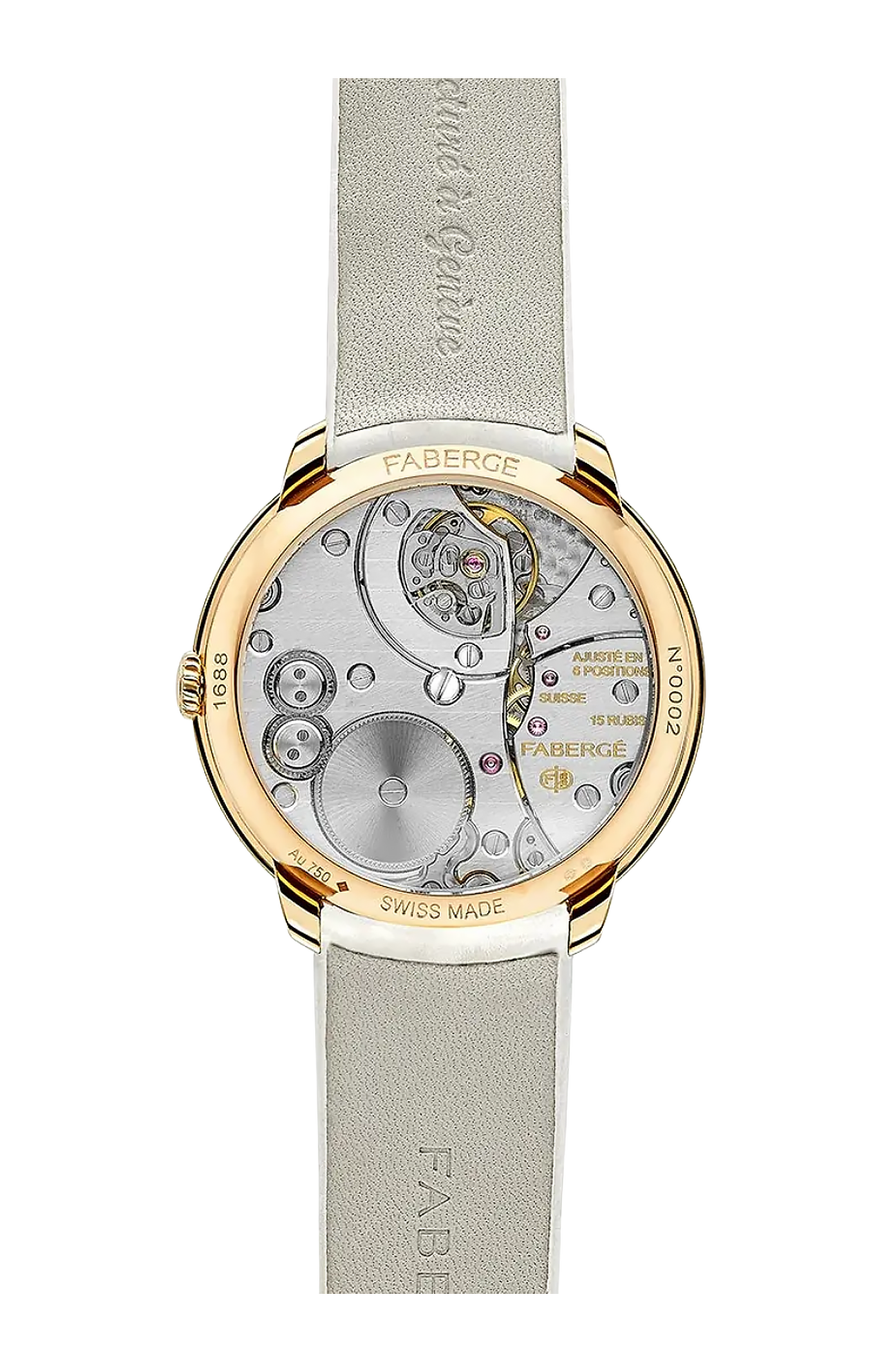 La collezione Fabergé Dalliance illustra perfettamente la squisita maestria artigianale di Fabergé; la collezione presenta un movimento a carica manuale sviluppato esclusivamente per Fabergé da Agenhor Manufacture. Le possibilità uniche dell'architettura di questa collezione consentono di personalizzare la decorazione centrale per il proprietario tramite una personalizzazione su misura. La decorazione centrale è una caratteristica segreta, personale per chi la indossa; il motivo scelto è stampato in platino su un vetro zaffiro bombato e rifinito con madreperla bianca, creando un effetto tenue e sottile. Il design è visibile solo a chi la indossa sotto una certa luce e ad angolazioni particolari, illustrando l'elemento sorpresa caratteristico di Fabergé. Il Fabergé Levity Watch può essere personalizzato con la tua immagine speciale. Per ulteriori informazioni, contatta sales@faberge.com.