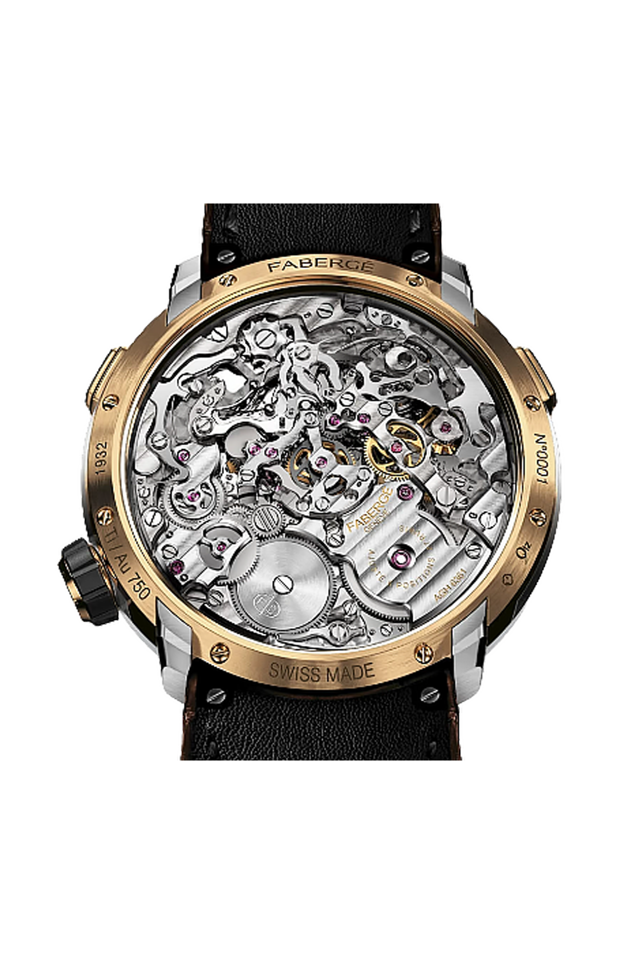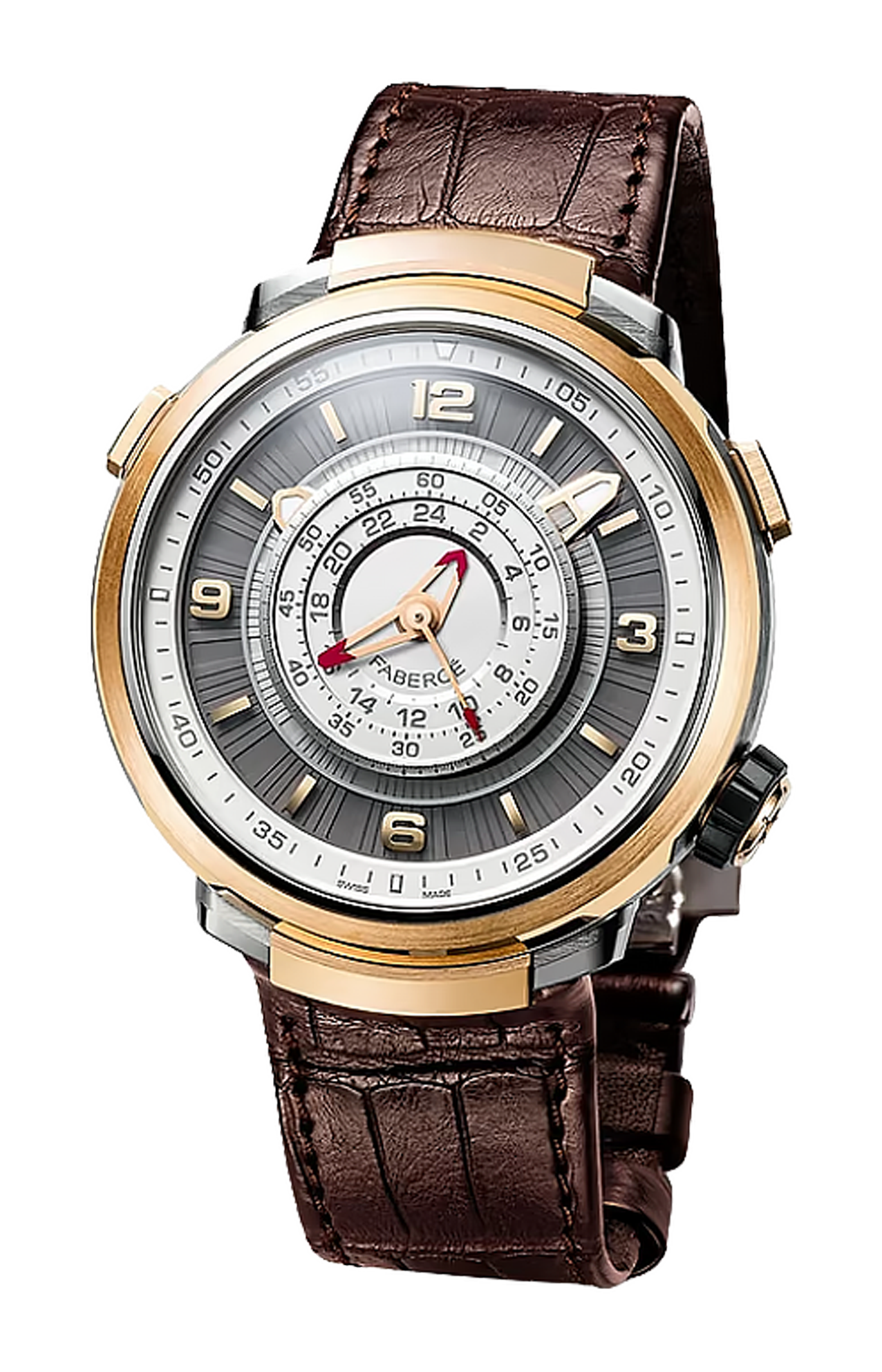 L'orologio Fabergé Visionnaire Chronograph Rose Gold è dotato di quadrante opalino con rivestimento luminescente TCI, indicatori dei 15 minuti, zaffiro con trattamento metallico e numeri applicati e indicatori delle ore e un movimento cronografico automatico di portata rivoluzionaria, sviluppato da Agenhor, racchiuso in una cassa da 43 mm in oro rosa 18 carati e titanio, con cinturino in alligatore.