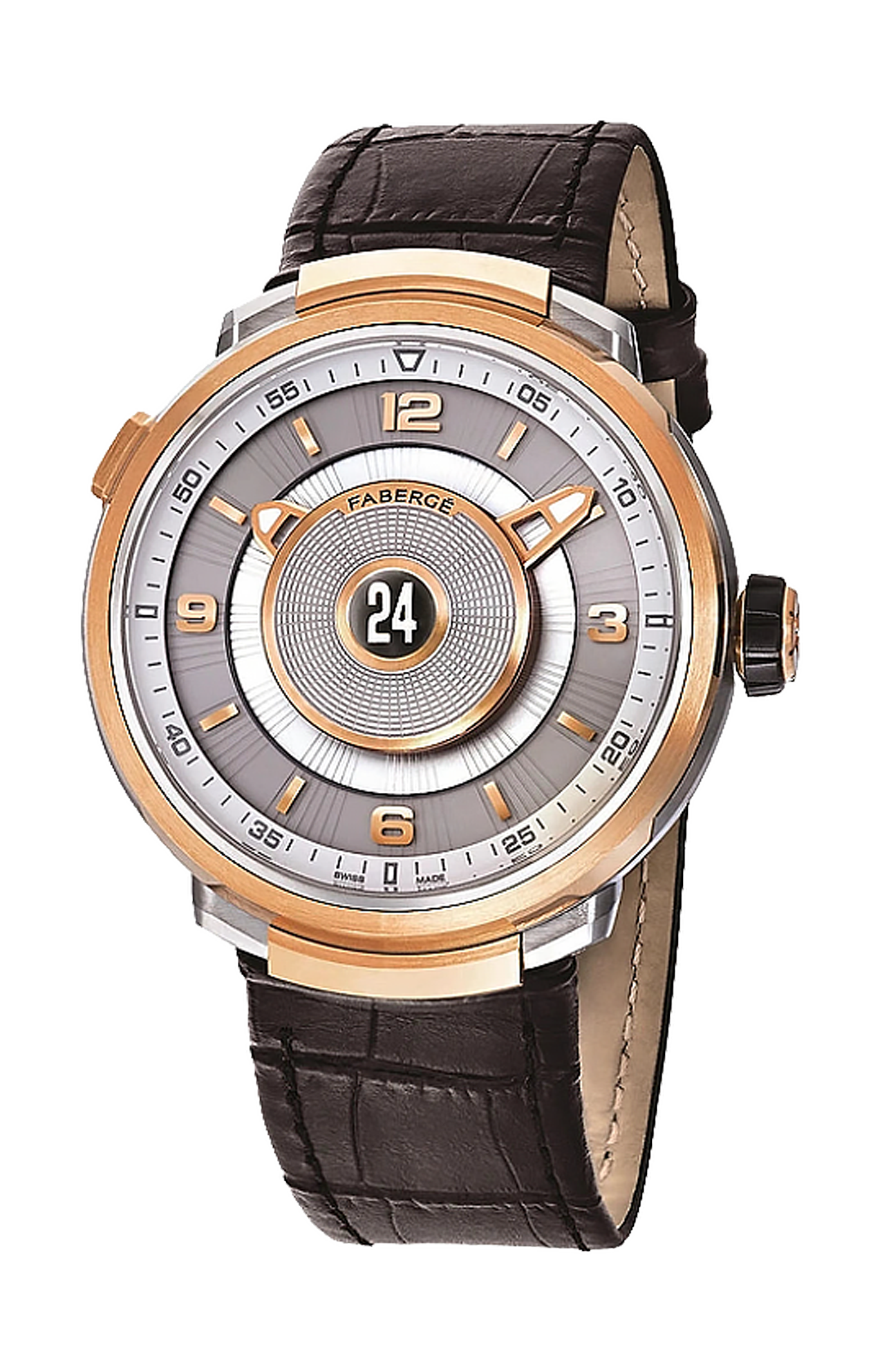L'orologio Fabergé Visionnaire DTZ in oro rosa 18 carati presenta un quadrante opalino con rivestimento luminescente TCI, indicatori dei 15 minuti, zaffiro con trattamento metallico e numeri applicati e indicatori delle ore e un movimento automatico con complicazione GMT, racchiuso in una cassa da 43 mm in oro rosa 18 carati e titanio, con cinturino in alligatore.