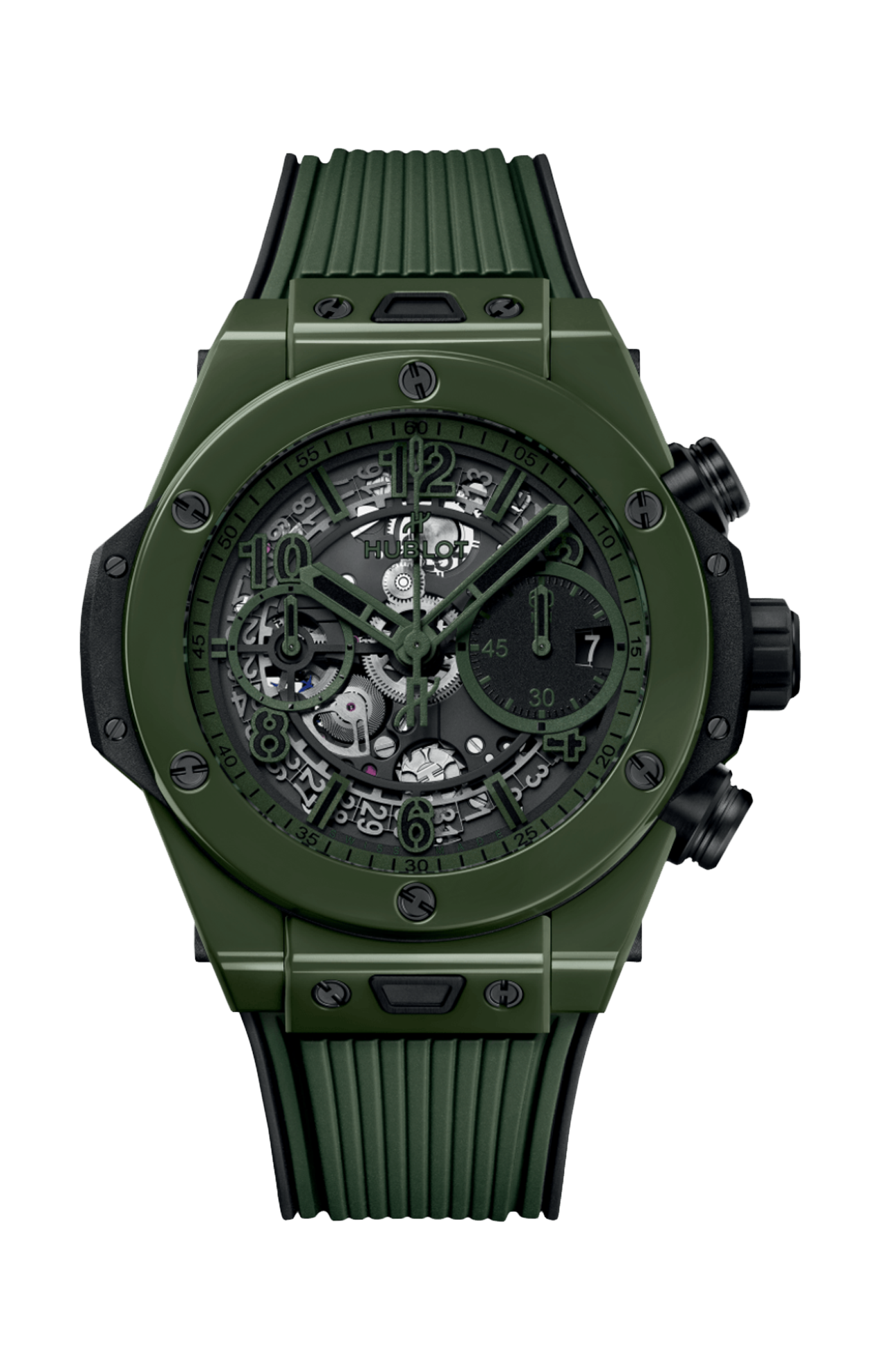 Per Hublot, i materiali sono parte integrante del design dei propri orologi. Devono completarene il design, proteggendone al contempo il meccanismo e resistendo alla prova del tempo. Per questo motivo, la manifattura ha scelto di utilizzare la ceramica high-tech per alcune lunette e casse; si tratta di un materiale ultraresistente e quasi completamente antigraffio (a parte il diamante), con una base di zirconio sinterizzato ad altissime temperature. Secondo cinturino incluso caucciù nero. Edizione limitata a 250 esemplari.