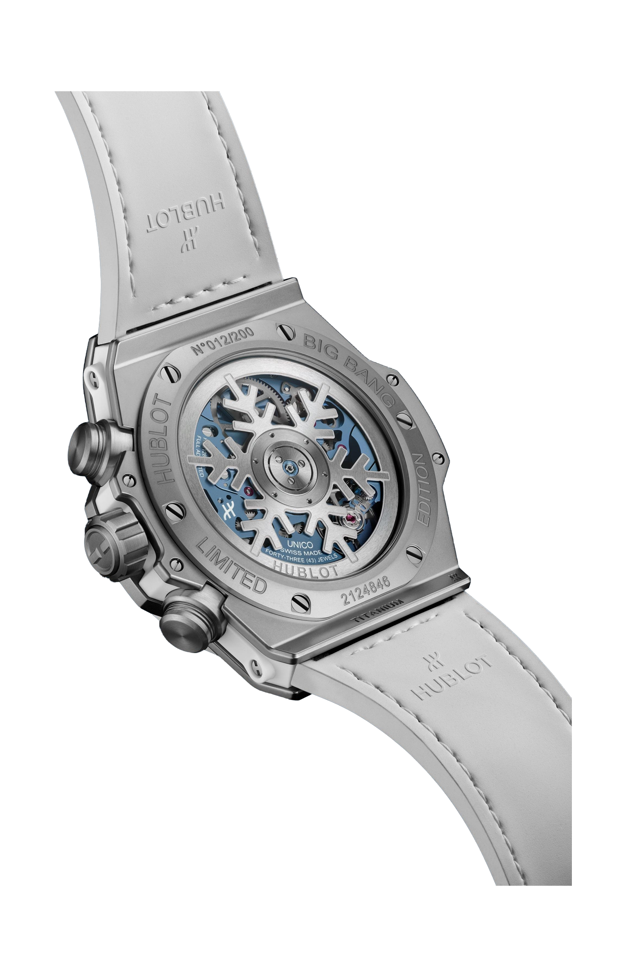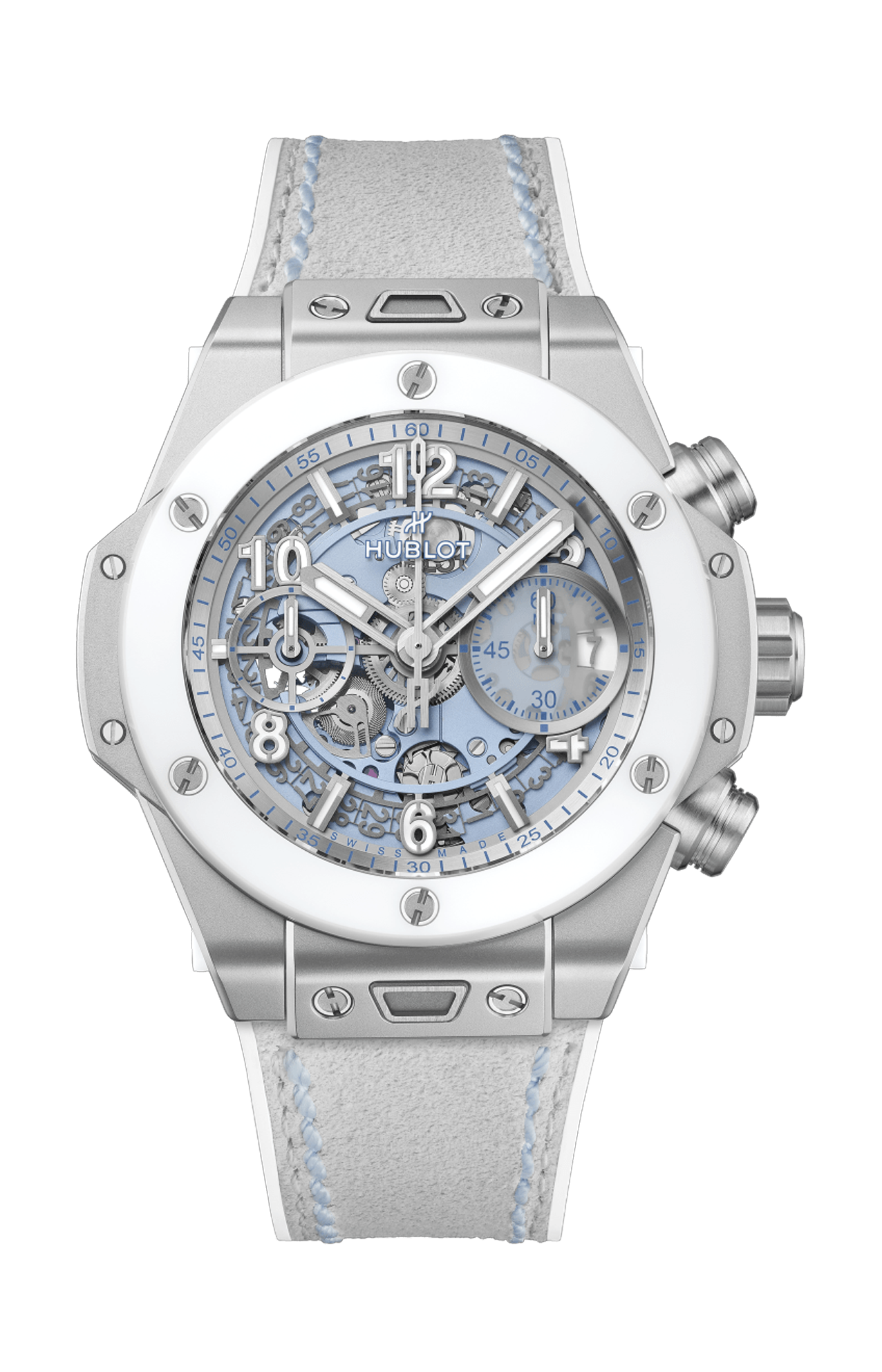 Per Hublot, i materiali sono parte integrante del design dei propri orologi. Devono completarli il design, proteggendone al contempo il meccanismo e resistendo alla prova del tempo. Per questo motivo, la manifattura ha scelto di utilizzare la ceramica high-tech per alcune lunette e casse; si tratta di un materiale ultraresistente e quasi completamente antigraffio (a parte il diamante), con una base di zirconio sinterizzato ad altissime temperature. Edizione limitata a 200 esemplari. Secondo cinturino incluso in caucciù bianco con inserti in pelle di vitello blu.
