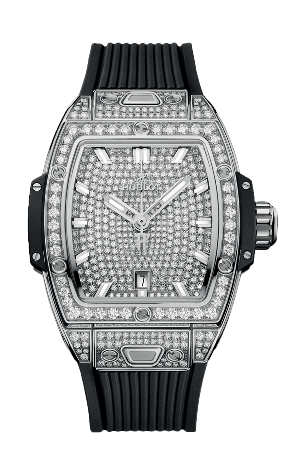 L’Hublot Spirit of Big Bang Steel Full Pavé da 32 mm è un segnatempo femminile di alta gioielleria che interpreta con modernità e luminosità lo spirito audace della celebre collezione Spirit of Big Bang. La cassa tonneau da 32 mm, realizzata in acciaio lucidato, è completamente incastonata con diamanti taglio brillante di qualità eccellente lungo lunetta, profili e superfici visibili, creando un effetto di brillantezza continua e raffinata. Il quadrante bianco tempestato di diamanti cattura la luce con eleganza e profondità, mentre lancette e indici rodiati offrono leggibilità bilanciata e uno stile armonico. Il vetro zaffiro antigraffio con trattamento antiriflesso protegge il quadrante e ne esalta i dettagli, conferendo chiarezza visiva ad ogni angolo di visione. All’interno pulsa un movimento automatico di precisione, che garantisce affidabilità quotidiana e performance tecniche elevate, rendendo l’orologio adatto all’uso di tutti i giorni pur mantenendo una forte personalità. Il cinturino in caucciù bianco, abbinato alla fibbia deployante in acciaio, combina comfort, dinamismo e stile contemporaneo, assicurando una perfetta aderenza al polso. Questo segnatempo rappresenta l’incontro perfetto tra lusso prezioso, design innovativo e funzionalità, ideale per chi desidera un accessorio distintivo che sappia brillare con classe in ogni occasione, dal quotidiano agli eventi più esclusivi.