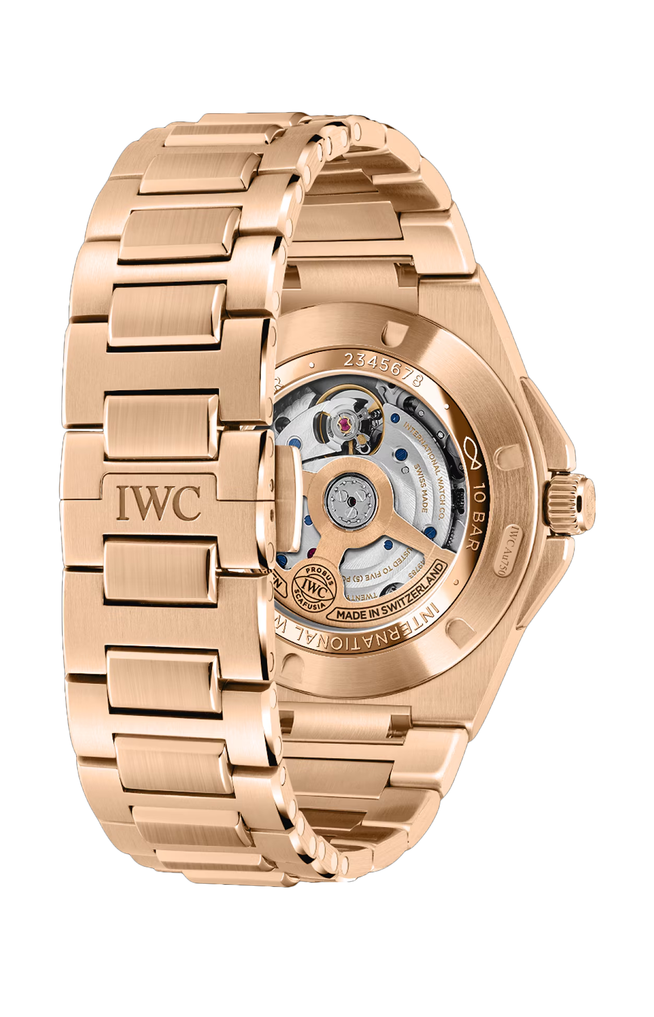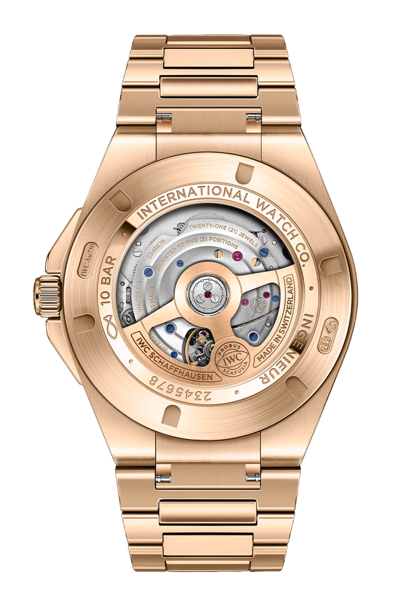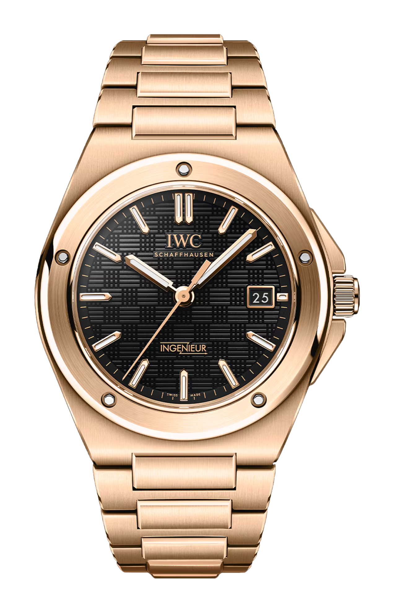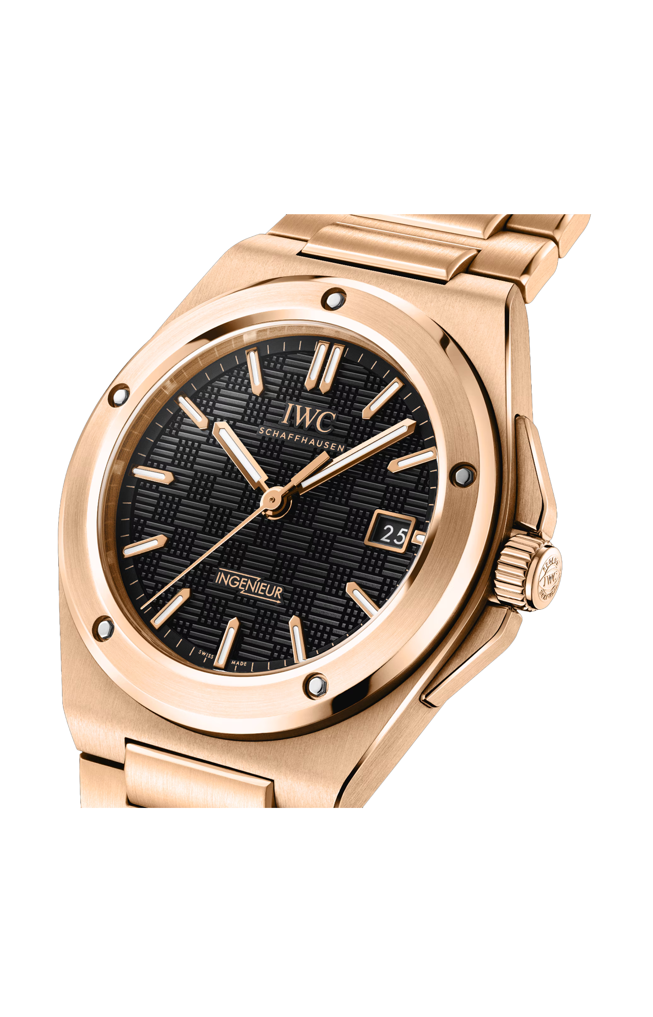 L’ingenieur automatic 40 è il primo modello della collezione a essere realizzato interamente in oro rosso 18 carati. La cassa, l’anello del fondello, la lunetta, la protezione della corona, la corona e le maglie del bracciale sono tutti in oro. Con la sua cassa da 40 millimetri, l’orologio garantisce una perfetta ergonomia e vestibilità. Inoltre, colpisce per le sue raffinate finiture, con una combinazione di superfici satinate e lucide. Fissata alla ghiera con cinque viti funzionali, la lunetta è satinata con un bordo esterno lucido, mentre l’anello del fondello è lucido. Sia le maglie ad H che le maglie centrali del bracciale integrato sono satinate. Una caratteristica distintiva del design dell’ingenieur è il quadrante nero con motivo “a griglia”: costituito da piccole linee e quadrati, aggiunge texture e profondità. Gli indici applicati sono realizzati in oro massiccio e montati singolarmente a mano. Sia gli indici che le lancette sono riempiti con super-luminova® per garantire una leggibilità eccellente. Il fondello aperto mostra il calibro di manifattura IWC 32111 con sistema di carica a doppio cricchetto e una riserva di carica di 120 ore. Il movimento è rifinito con côtes de Genève e perlage, viti azzurrate e una massa oscillante placcata oro.