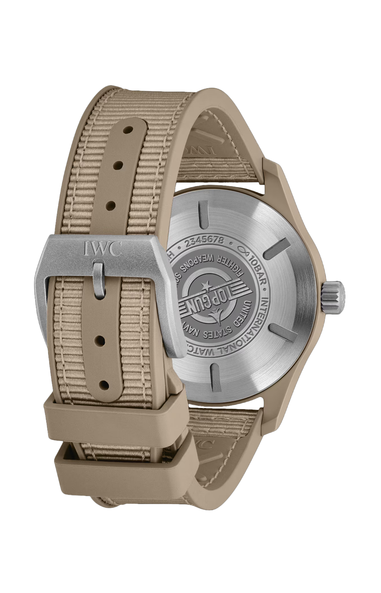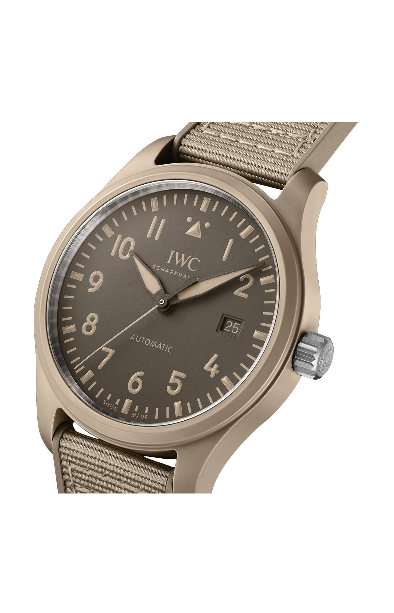 Il Pilot’s Watch Automatic 41 Top Gun Mojave Desert presenta una cassa in ceramica color sabbia e un quadrante marrone chiaro. Vetro zaffiro, bombato, antiriflesso su entrambi i lati, secondi centrali con dispositivo di arresto, datario, vetro zaffiro antidicompressione, cassa interna in ferro dolce per la schermatura dall’irradiazione di campi magnetici.