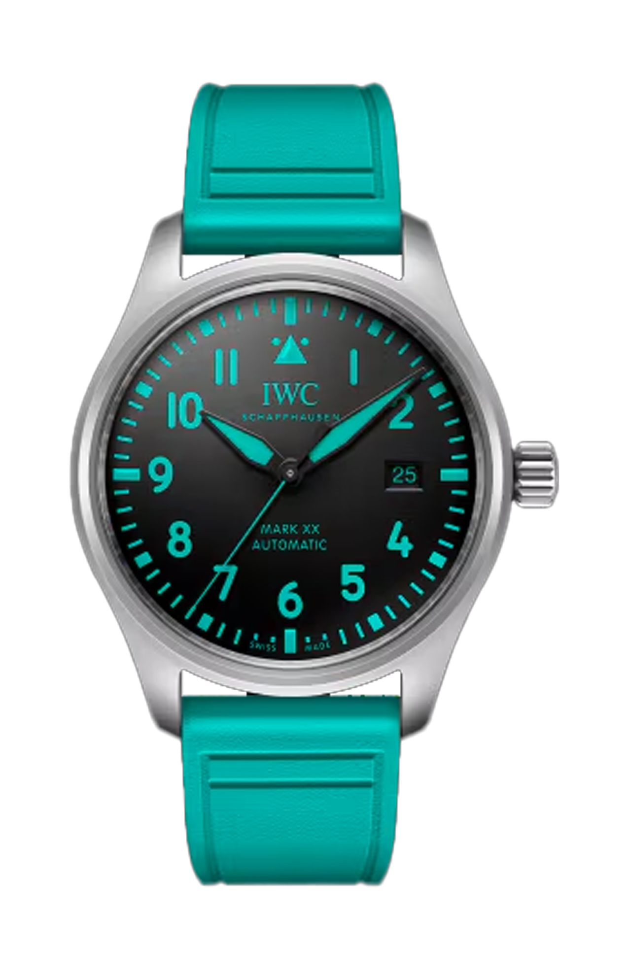 Nel 2013, IWC Schaffhausen è diventata “Official Engineering Partner” del Mercedes-AMG Petronas Formula One™ Team. Il Pilot’s Watch Mark XX Mercedes-AMG Petronas Formula One™ Team è il secondo orologio ufficiale del team creato da IWC per il suo storico partner nel mondo degli sport motoristici. La cassa da 40 millimetri è realizzata in titanio grado 5, leggero e straordinariamente rigido. Offrendo il più alto rapporto resistenza/densità tra tutti i metalli, il titanio è largamente utilizzato anche nel campo dell’ingegneria automobilistica per produrre parti di automobili sottoposte a stress immensi, come le valvole del motore. Dopo la lavorazione e la sabbiatura, la superficie acquista un’accattivante luminosità grigiastra. I numeri e gli indici nel caratteristico verde della squadra creano un contrasto con il quadrante nero. Le lancette delle ore, dei minuti e dei secondi sono rivestite con Super-Luminova® dello stesso colore verde. All’interno della cassa è presente il calibro 32111 di manifattura IWC, un movimento automatico con una riserva di carica di 120 ore. Questo orologio è resistente all’acqua fino a 10 bar ed è dotato di un cinturino in caucciù verde Petronas con sistema di cambio cinturino EASX-CHANGE®.
