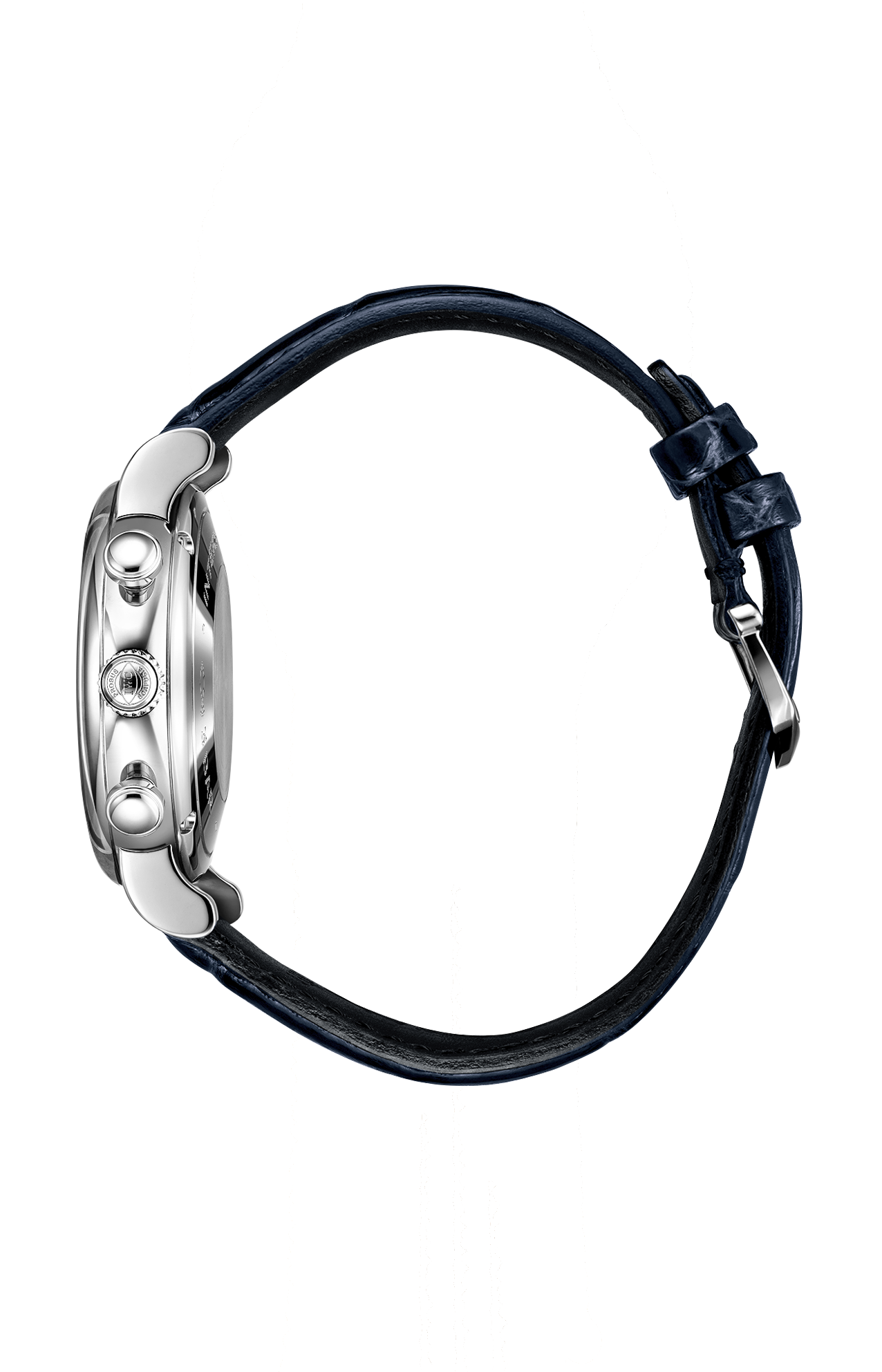Fin dal suo debutto nel 1984, la linea Portofino si è affermata come una delle collezioni più amate di IWC Schaffhausen. Il segreto del suo continuo successo risiede nel design essenziale dall’eleganza classica. È contraddistinto dalla cassa rotonda minimalista con anse dritte, dagli indici e dai numeri romani applicati e dalle eleganti lancette a foglia. Per molti anni, i cronografi sono stati parte integrante della collezione, conferendole un tocco sportivo. Il Portofino Chronograph 39 sfoggia una cassa leggermente più compatta, con un diametro di 39 millimetri, e i suoi caratteristici pulsanti. Questo nuovo modello presenta una cassa in acciaio e un quadrante argenteo. Le lancette e gli indici applicati blu trovano perfetta armonia con il blu del cinturino, realizzato in raffinata pelle di alligatore. Il contatore dei minuti a ore 12 e i piccoli secondi a ore 6 offrono una struttura del quadrante particolarmente equilibrata.