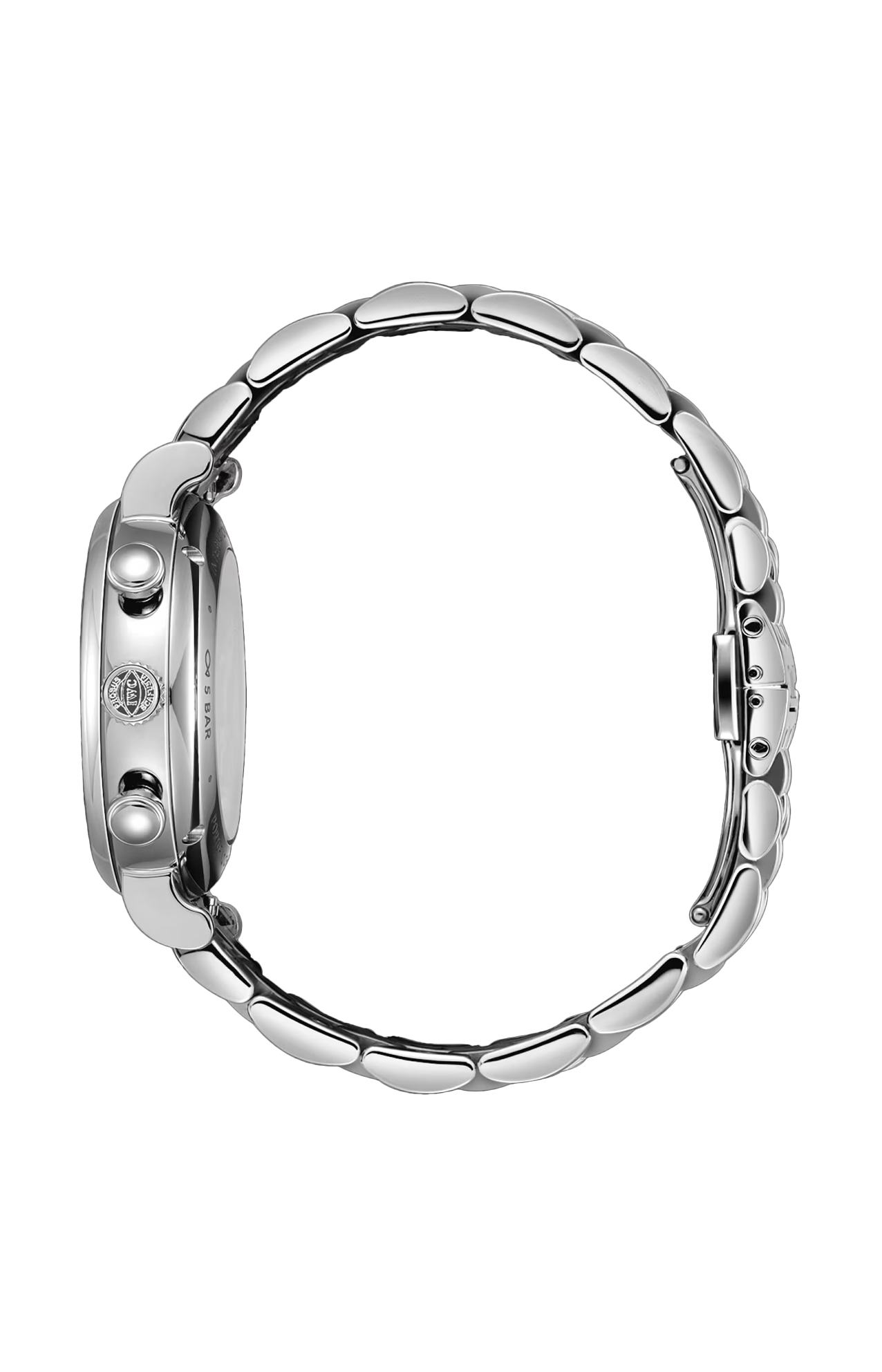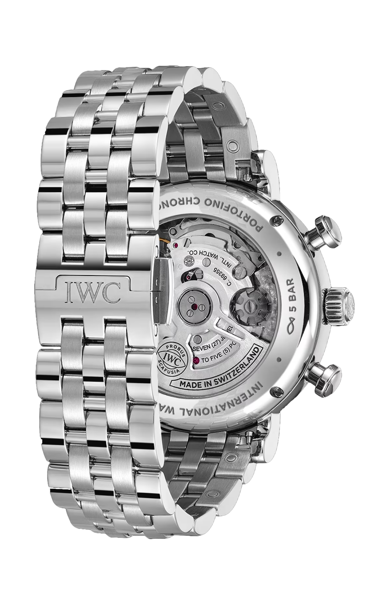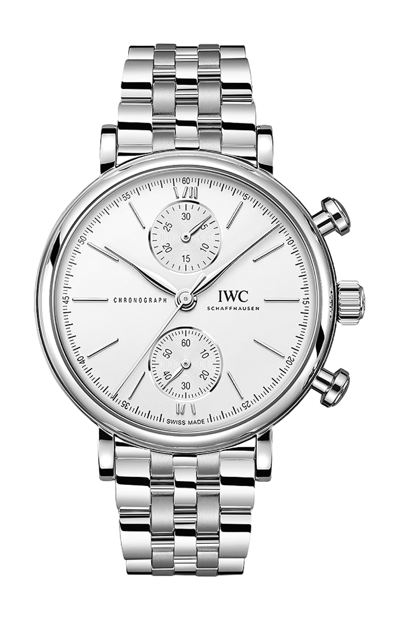 Il Portofino Chronograph 39 combina il classico ed elegante design Portofino con una complicazione cronografica sportiva. Il diametro della cassa leggermente ridotto, pari a 39 millimetri, garantisce un’eccellente indossabilità anche sui polsi più sottili. Questa versione presenta una cassa e un bracciale in acciaio a 5 maglie molto robusto e confortevole; l’alternarsi di superfici spazzolate e satinate dona all’orologio un look contemporaneo e raffinato. Grazie al sistema di sostituzione rapida integrato, il bracciale può essere cambiato rapidamente. Le lancette e gli indici rodiati si armonizzano alla perfezione con il quadrante argentato. All’interno della cassa troviamo il movimento cronografico di manifattura IWC calibro 69355, che consente la misurazione di intervalli fino a 30 minuti. Il cronografo dal classico design con ruota a colonne è visibile attraverso il fondello in vetro zaffiro.