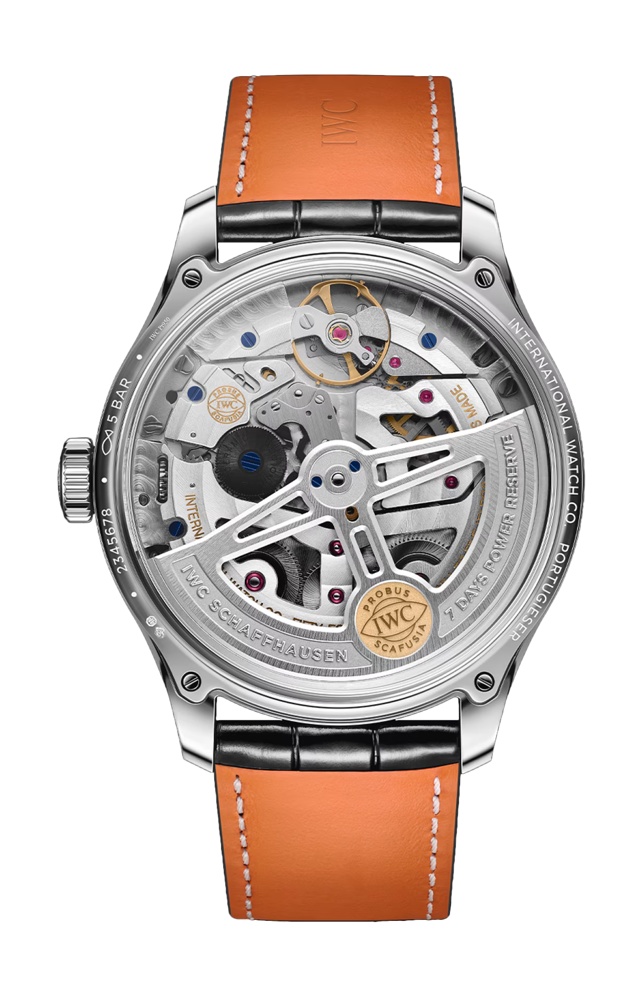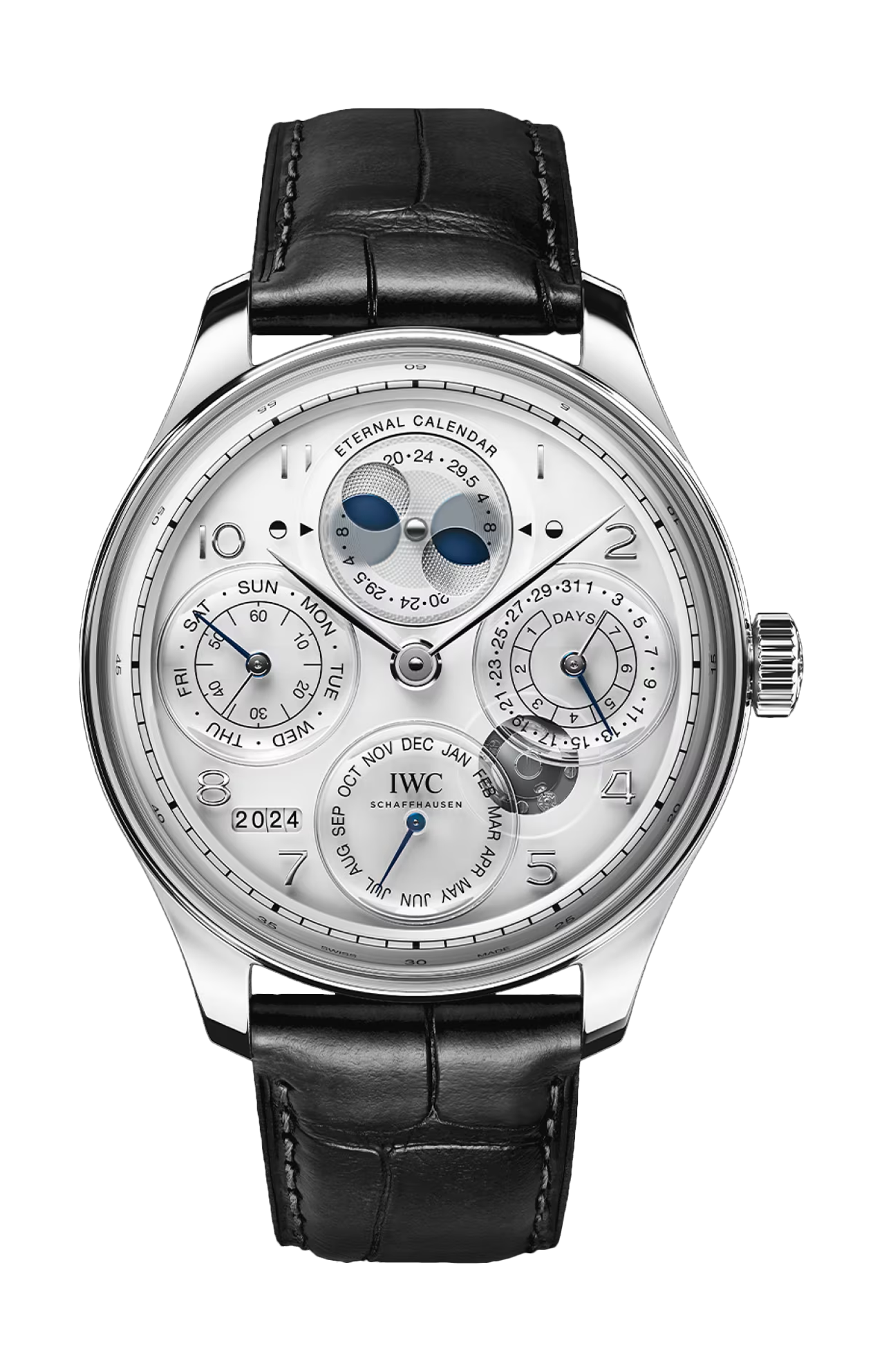 Il lancio del leggendario calendario perpetuo di Kurt Klaus nel 1985 ha segnato l’inizio del savoir-faire unico di IWC Schaffhausen nella realizzazione dei calendari meccanici. Riconoscendo automaticamente le diverse lunghezze dei mesi e aggiungendo un giorno bisestile ogni quattro anni, l’ingegnoso meccanismo continua a essere il punto di riferimento per efficienza e facilità d’uso. Con il Portugieser Eternal Calendar, IWC Schaffhausen si spinge ancora una volta oltre i confini dell’alta orologeria. Il primo calendario perpetuo secolare della manifattura si basa sullo stesso design sincronizzato del calendario perpetuo regolare. Tutte le sue indicazioni possono quindi essere regolate mediante un’unica corona. Mentre il calendario perpetuo necessita di una regolazione negli anni secolari non bisestili, il calendario perpetuo secolare è programmato meccanicamente per tenere conto di queste eccezioni. Grazie a un nuovo ruotismo di 400 anni, che compie un solo giro ogni quattro secoli, il calendario salterà tre anni bisestili in 400 anni, evento che si verificherà per la prima volta nell’anno 2100. Il calendario eterno calcolerà correttamente l’anno bisestile almeno fino al 3999, poiché non è ancora stato deciso ufficialmente se il 4000 sarà un anno bisestile. Un’altra caratteristica di questo orologio è l’indicazione eterna delle fasi lunari. Gli ingegneri di IWC hanno sviluppato un’indicazione delle fasi lunari con una precisione senza precedenti. Dopo aver calcolato molte delle oltre 22 trilioni di possibili combinazioni, hanno ideato un ruotismo di riduzione composto da tre ruote intermedie. L’indicazione delle fasi lunari Double Moon™, caratterizzata da un disco di base in titanio con due punti blu e da un disco di vetro che ruota sopra di esso, avrà bisogno, teoricamente, di una regolazione solo dopo 45 milioni di anni. La presenza di molti elementi in vetro, come il quadrante in vetro e il doppio vetro zaffiro, consente di ammirare l’ingegnoso meccanismo. Il quadrante in vetro è realizzato mediante un processo molto elaborato. Nella prima fase, la parte inferiore del vetro viene smerigliata e poi laccata di bianco. I contatori sono lavorati e lucidati separatamente e poi collocati sulla piastra di base. Infine, il quadrante è stampato e gli indici applicati sono montati a mano. All’interno della cassa in platino lucidato, spazzolato e rifinita in modo elaborato, batte il calibro 52640 di manifattura IWC. È il primo movimento di IWC Schaffhausen a presentare componenti in vetro, come il ponte del bariletto in vetro. Il sistema di ricarica automatica Pellaton sfrutta le rotazioni del rotore bidirezionale per accumulare una riserva di carica di 7 giorni (168 ore) nei due bariletti. Questo straordinario orologio con calendario è corredato da un cinturino in alligatore nero di Santoni con fibbia déployante in platino.