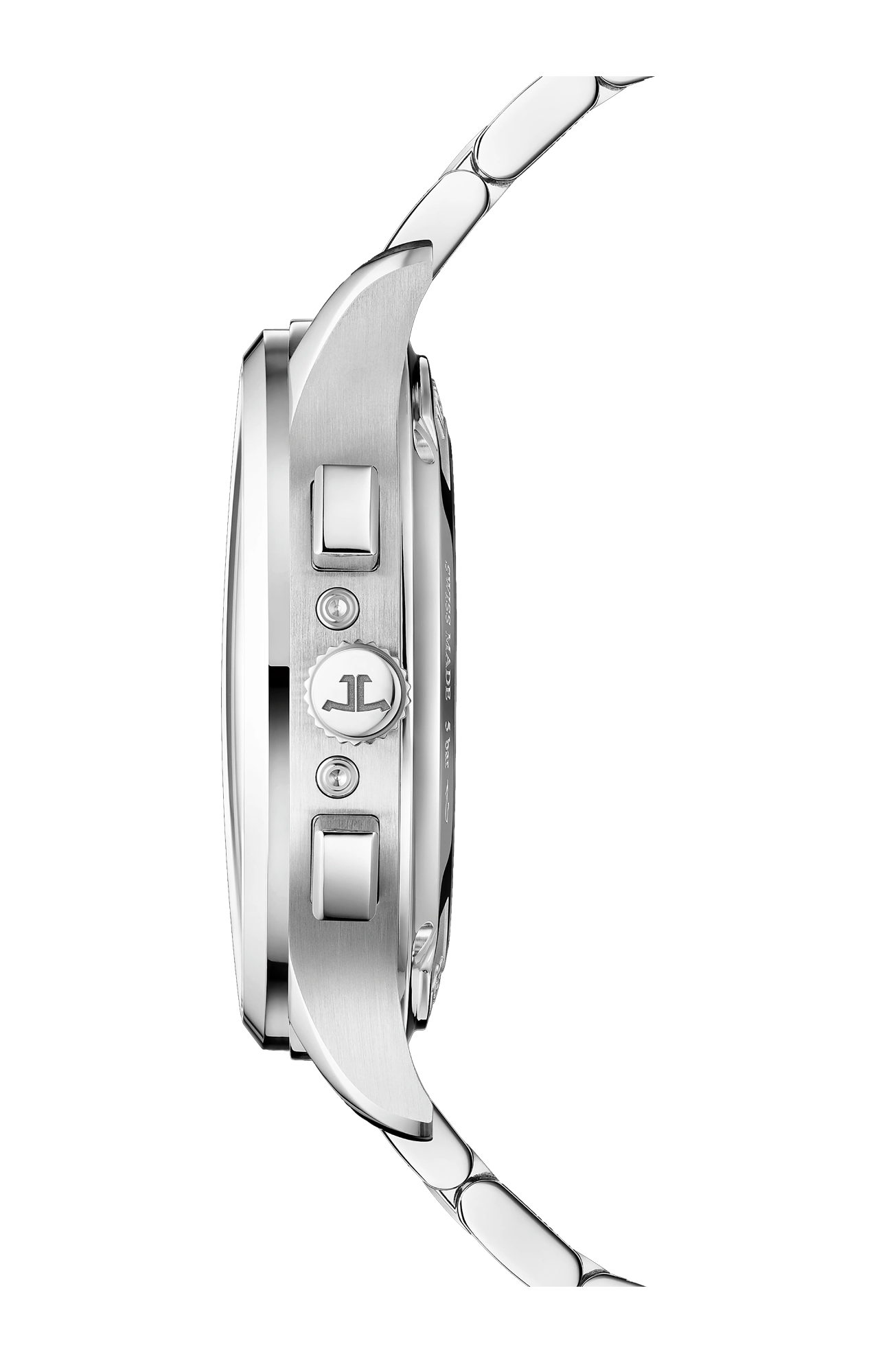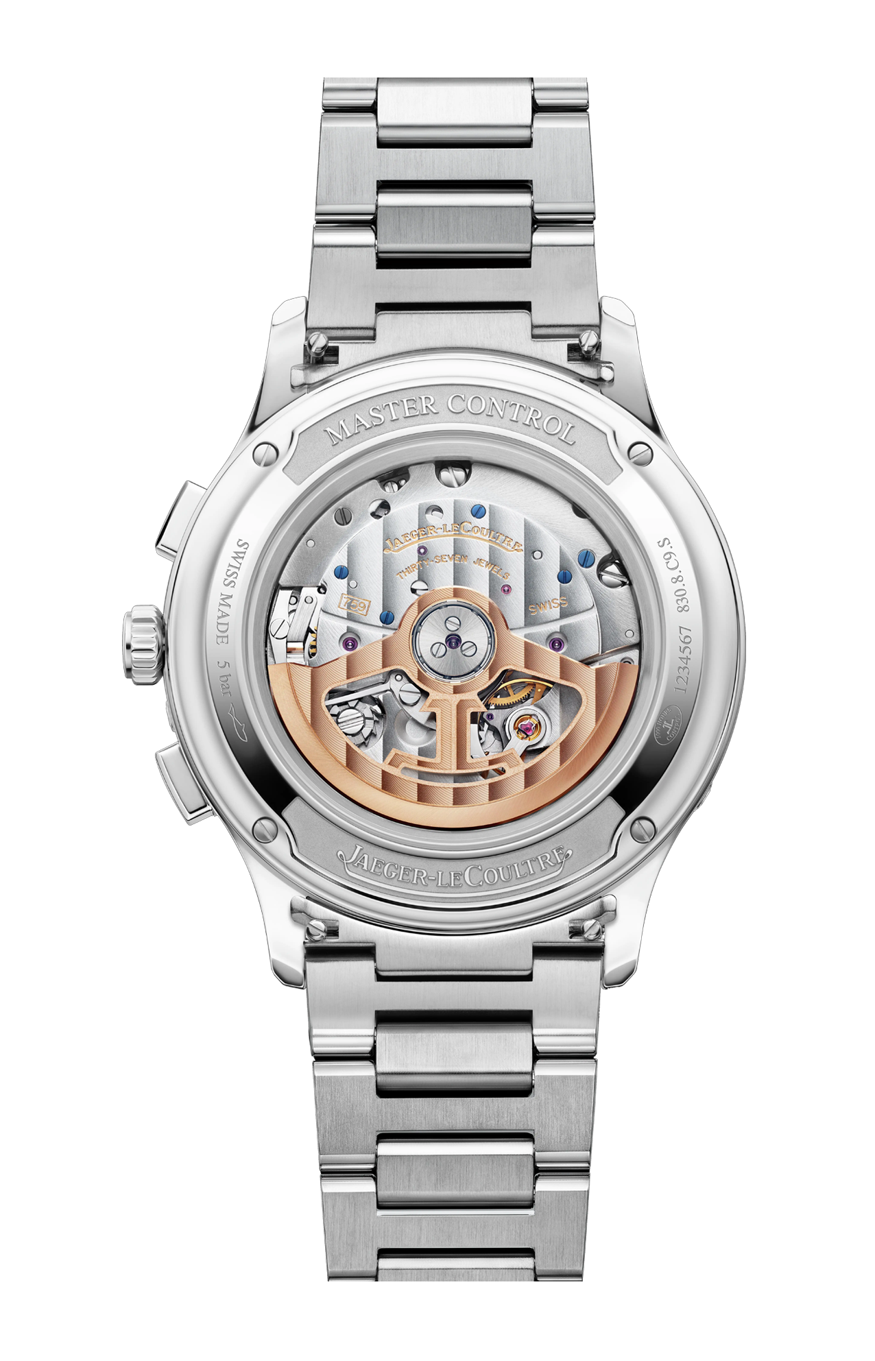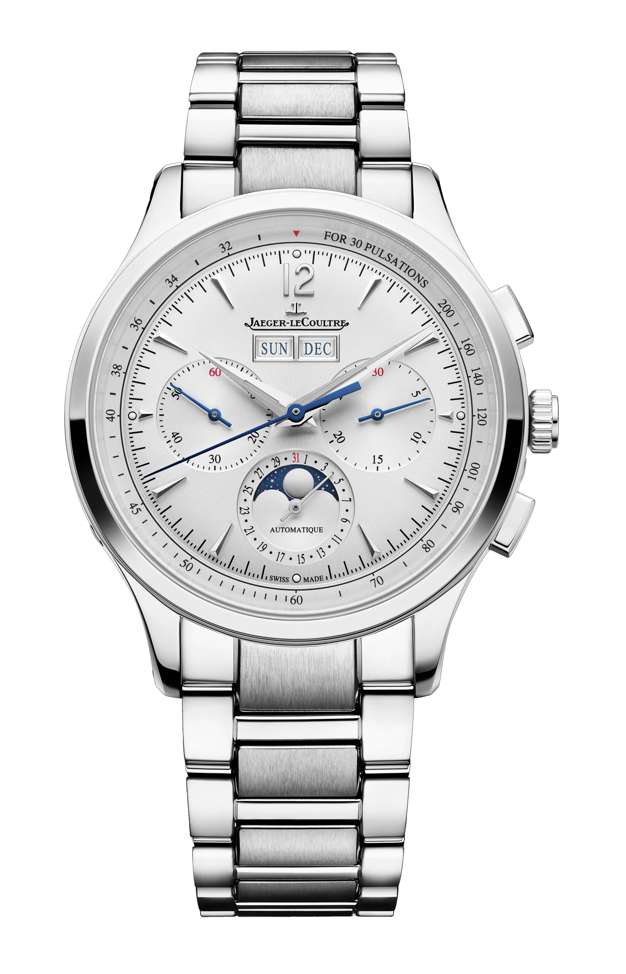 Il Master Control Chronograph Calendar fa rivivere i codici emblematici dell’iconica collezione: cassa rotonda, anse curve, doppia superficie lucida e satinata, lancette dauphine, indici applicati, logo e firma Jaeger-LeCoultre. Questo segnatempo presenta calendario, cronografo e fasi lunari ed è accompagnato da due cinturini diversi che, grazie a un nuovo sistema di intercambiabilità, permettono a chi lo indossa di passare, a seconda delle circostanze, da uno stile casual a un’eleganza più sofisticata. Il look dell’orologio cambia a seconda che si scelga il cinturino in acciaio o quello in pelle di vitello Novonappa con fibbia déployante. La semplice pressione del doppio pulsante situato tra le anse della cassa è sufficiente per cambiare il cinturino senza sforzo. Indipendentemente dal cinturino scelto, l’eleganza è una certezza al polso di chi lo indossa.