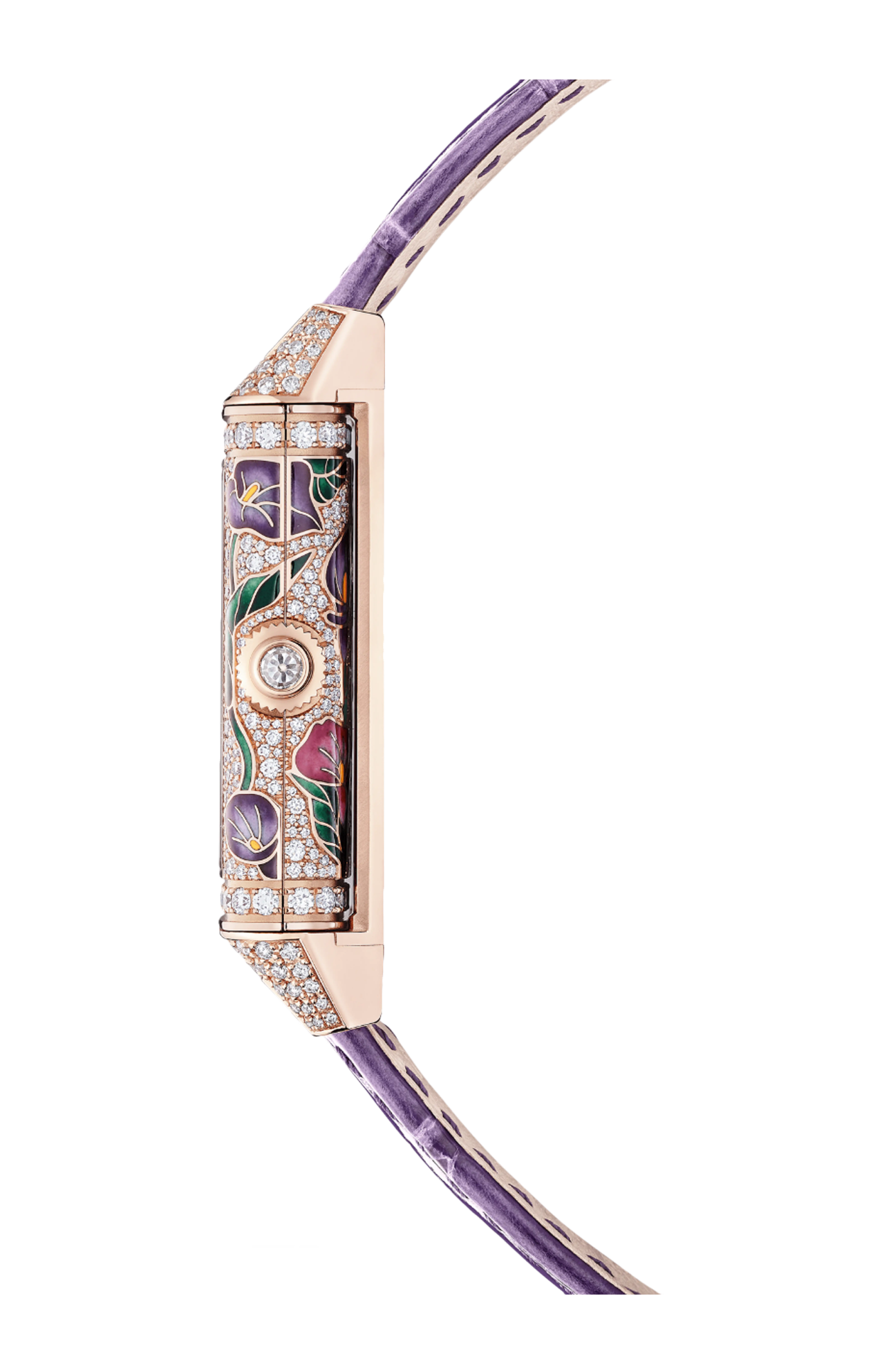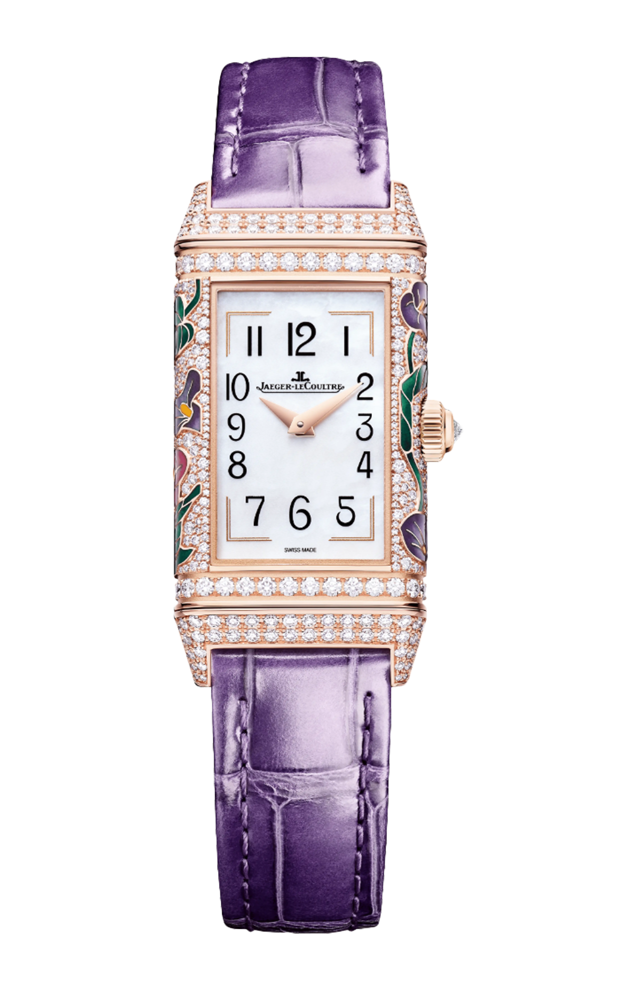 Nel giardino degli orologi Reverso One spicca un bouquet di calle viola. Il Reverso One Precious Flowers unisce la maestria orologiera e l’alta gioielleria in un’espressione artistica originale e raffinata. Ci sono volute 130 ore agli artigiani del nostro atelier dei mestieri rari™ per dare vita a questo orologio-gioiello che coniuga le tecniche di smaltatura Champlevé Grand Feu e di incastonatura a neve e a grani. Su entrambi i lati del quadrante, i fiori di calla smaltati invitano a scoprire il retro. Una volta capovolto, l’orologio presenta un motivo floreale dai colori vivaci su un tappeto di diamanti incastonati a neve. In totale, sono stati meticolosamente incastonati oltre 600 diamanti taglio brillante. Edizione limitata di 10 esemplari.