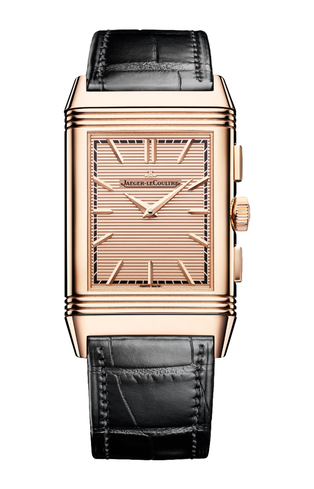 Nel Reverso Tribute Chronograph, la cassa, il quadrante e il calibro 860 sono impreziositi dall’oro rosa. Sotto un quadrante interamente in oro sul fronte, il retro altamente sofisticato rivela il funzionamento del cronografo con il suo contatore retrogrado dei 30 minuti. L’eccellente leggibilità del savoir-faire orologiero è qui davvero evidente: indici applicati, minuteria “chemin de fer” fluttuante sul rehaut, lancetta dei minuti azzurrata, ponti scheletrati e smussati... Con una coppia di cinturini intercambiabili inclusi – uno in pelle di vitello marrone basato su un design di casa Fagliano e l’altro in alligatore nero – l’orologio Reverso Tribute Chronograph offre al tempo stesso versatilità e raffinatezza. Edizione limitata a 250 esemplari.