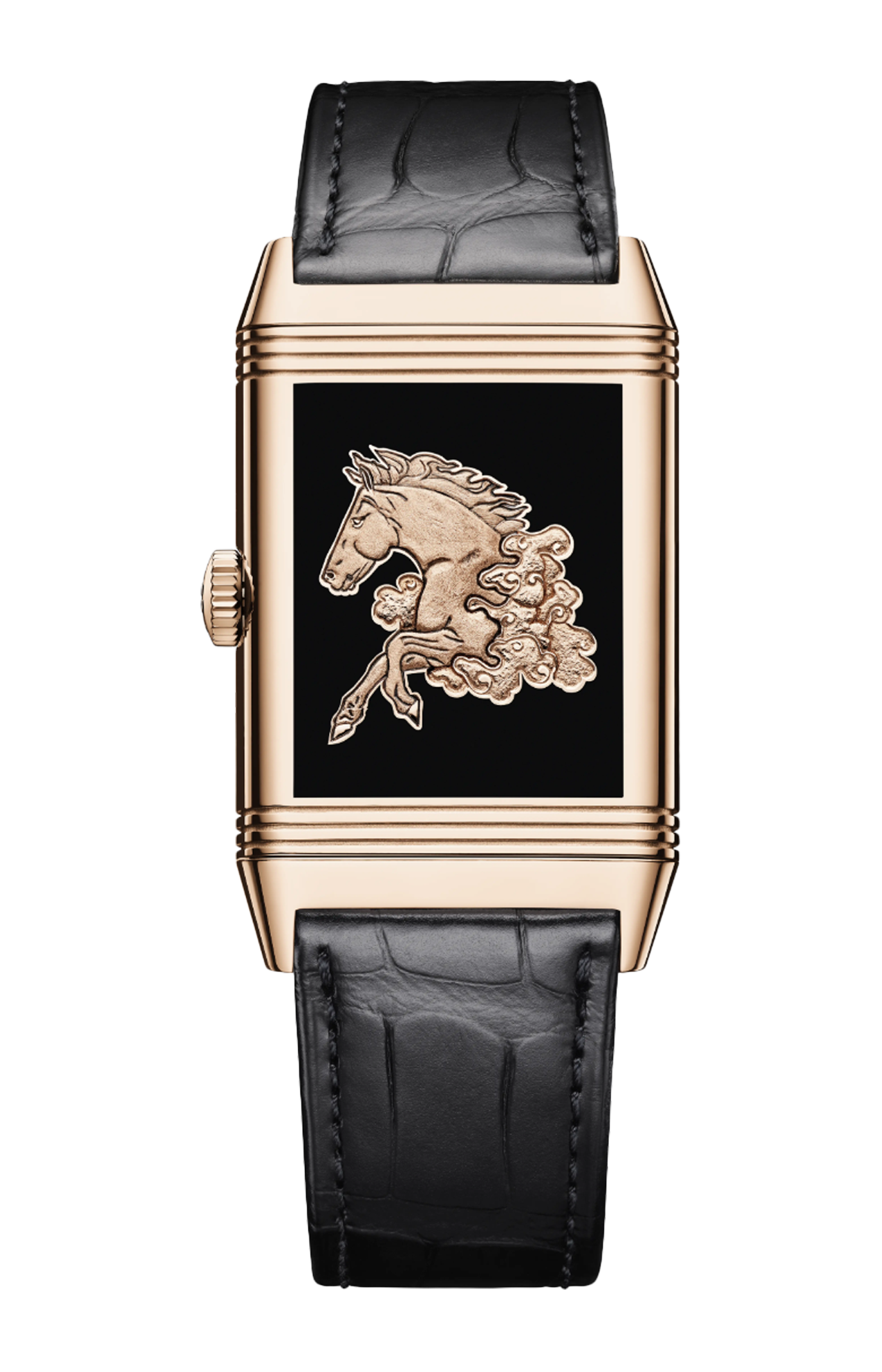 In omaggio all’astrologia cinese, il reverso tribute enamel creato presso il nostro atelier dei mestieri rari™ offre una splendida cornice al cavallo, l’animale zodiacale del 2026. Sia sul fronte che sul retro, i quadranti nero profondo sono smaltati grand feu. Liscio e brillante, questo colore si ottiene dopo diverse fasi di smaltatura e successivi passaggi in forno (800 °C). Sul retro, l’incisione di un maestoso cavallo circondato dalle fiamme ha richiesto ai nostri artigiani oltre 80 ore di lavoro. Ai lati del fronte elegantemente sobrio e del retro meticolosamente inciso, il cinturino in alligatore nero aggiunge un tocco di ricercatezza finale. Un orologio raffinato che ha come colori preferiti l’oro rosa e il nero.