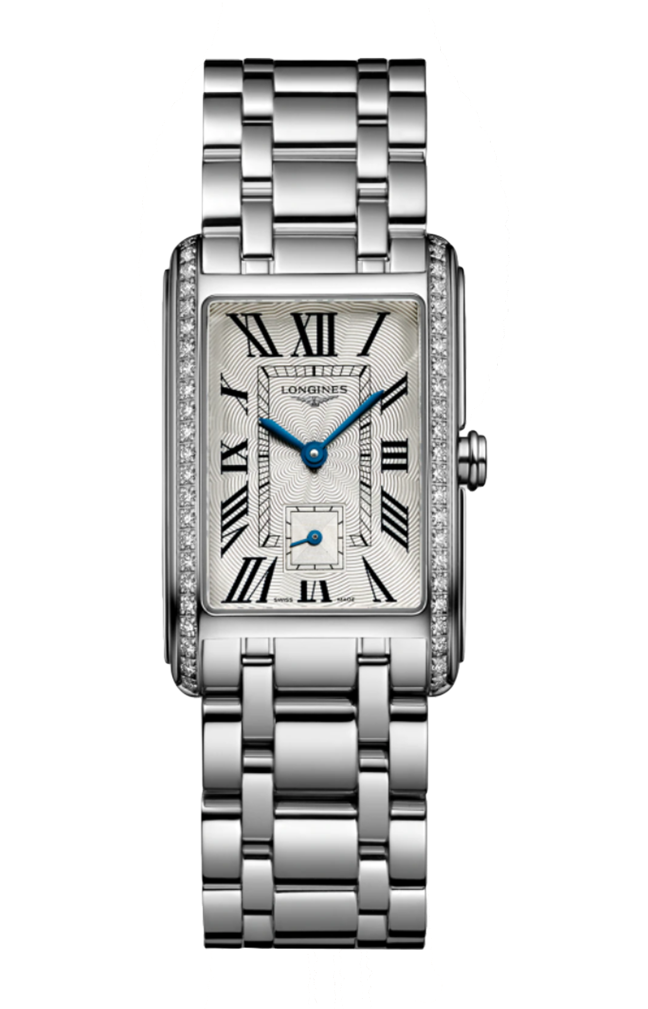 Orologio al quarzo, 23.30 x 37.00 mm, acciaio inossidabile, L5.512.0.71.6. Cassa con 46 diamanti top Wesselton IF-VVS incastonati, per un totale di 0.552 carati, impermeabile fino a 3 bar, vetro zaffiro antigraffio. Quadrante argento flinqué. Bracciale in acciaio inossidabile, con chiusura déployante a tripla sicurezza e meccanismo di apertura a pressione.