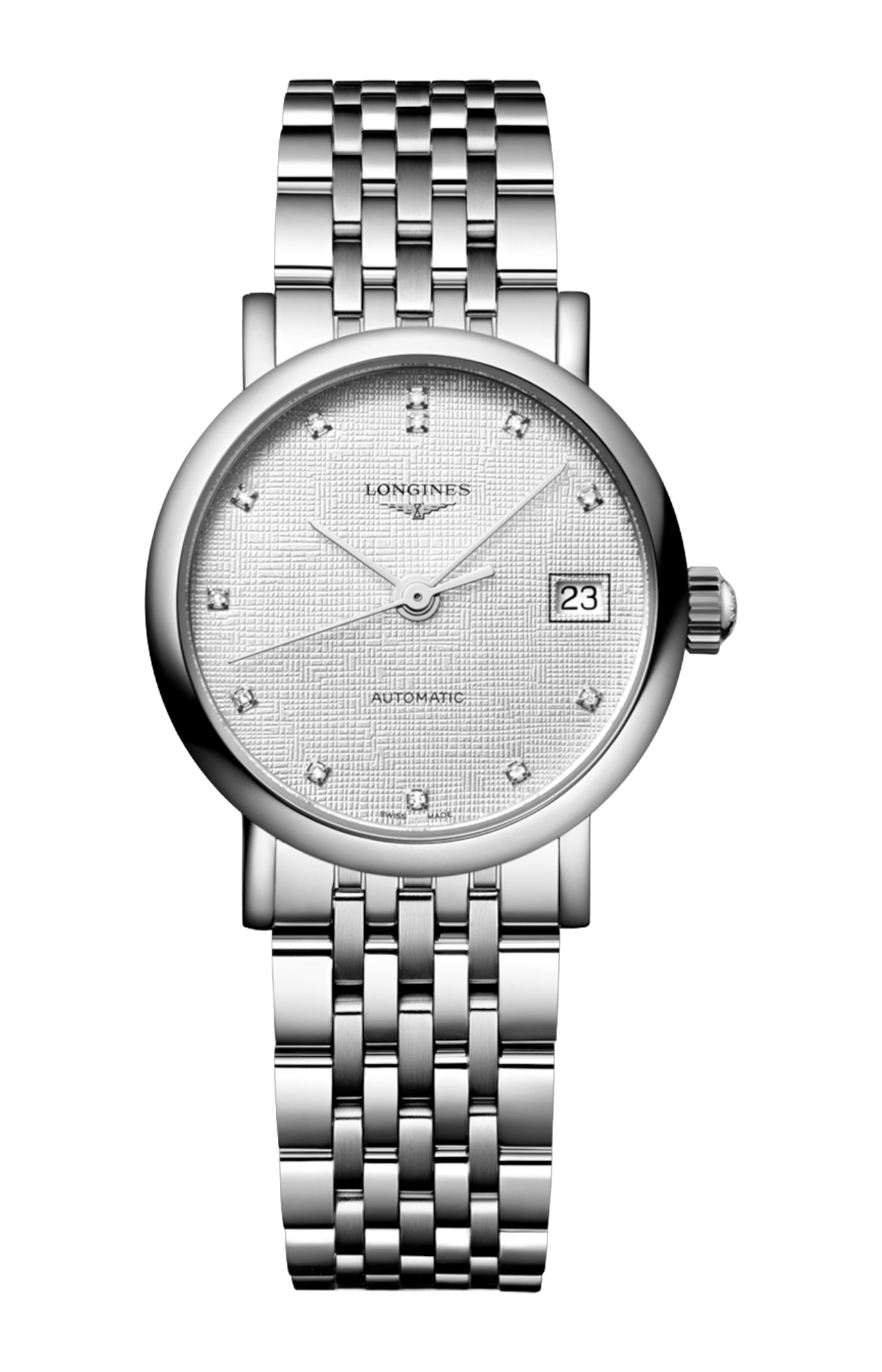 OROLOGIO AUTOMATICO, Ø 25.50 MM, ACCIAIO INOSSIDABILE, L4.309.4.79.6 DATE, MOVIMENTO MECCANICO A CARICA AUTOMATICA CON FREQUENZA DI 28'800 ALTERNANZE ORARIE E RISERVA DI CARICA DI CIRCA 45 ORE, BILANCIERE-SPIRALE IN SILICIO MONOCRISTALLINO. IMPERMEABILE FINO A 3 BAR, VETRO ZAFFIRO ANTIGRAFFIO. QUADRANTE STRIPED SILVER. BRACCIALE IN ACCIAIO INOSSIDABILE, CON CHIUSURA DÉPLOYANTE A TRIPLA SICUREZZA E MECCANISMO DI APERTURA A PRESSIONE.