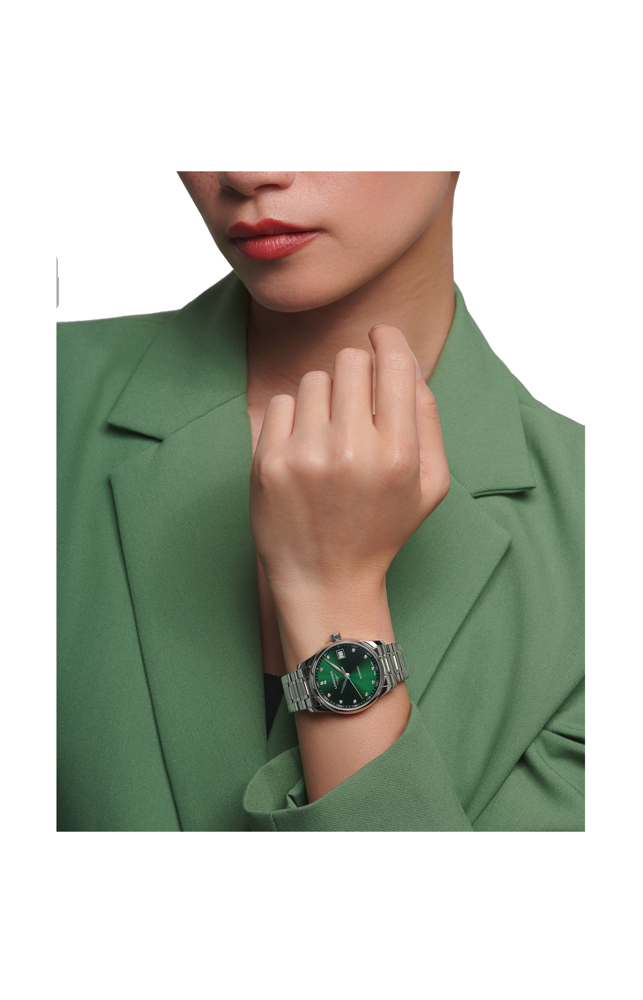 Date, movimento meccanico a carica automatica con frequenza di 25'200 alternanze orarie e riserva di carica di circa 72 ore, bilanciere-spirale in silicio monocristallino. Impermeabile fino a 3 bar, vetro zaffiro antigraffio con trattamento antiriflesso multistrato su entrambi i lati. Quadrante verde. Bracciale in acciaio inossidabile, con chiusura déployante a tripla sicurezza e meccanismo di apertura a pressione.