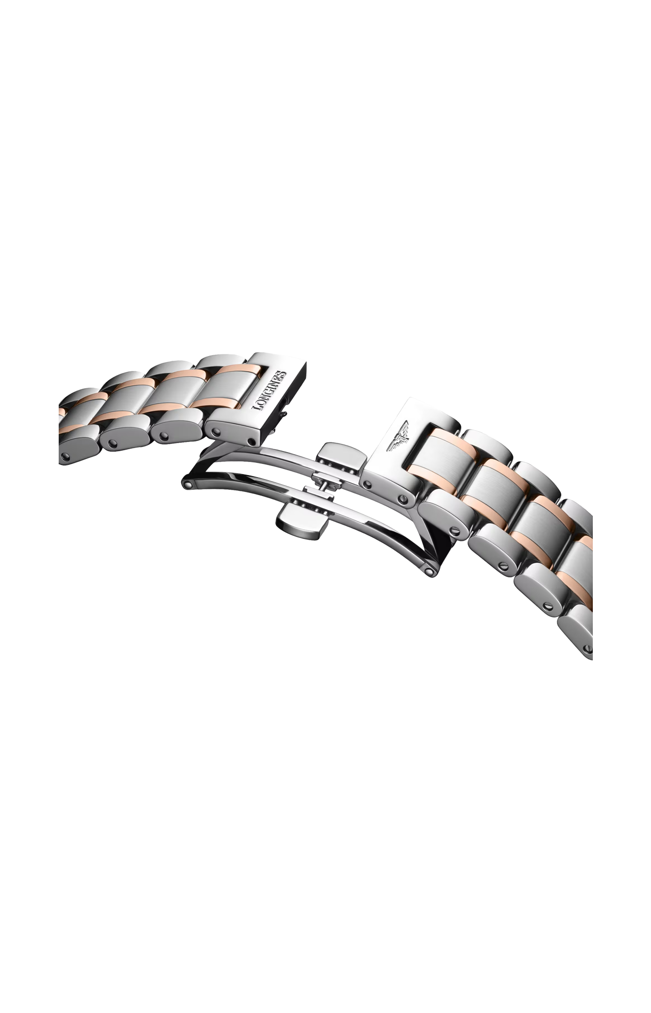 Movimento meccanico a carica automatica con frequenza di 25'200 alternanze orarie e riserva di carica di circa 72 ore, bilanciere-spirale in silicio monocristallino. Impermeabile fino a 3 bar, vetro zaffiro antigraffio con trattamento antiriflesso multistrato su entrambi i lati. Quadrante argento. Bracciale in acciaio inossidabile e lunetta girevole bidirezionale con inserto spazzolato circolare sovrastato da una coiffe in oro rosa 18 carati 5N, con chiusura DÉPLOYANTE a tripla sicurezza e meccanismo di apertura a pressione.