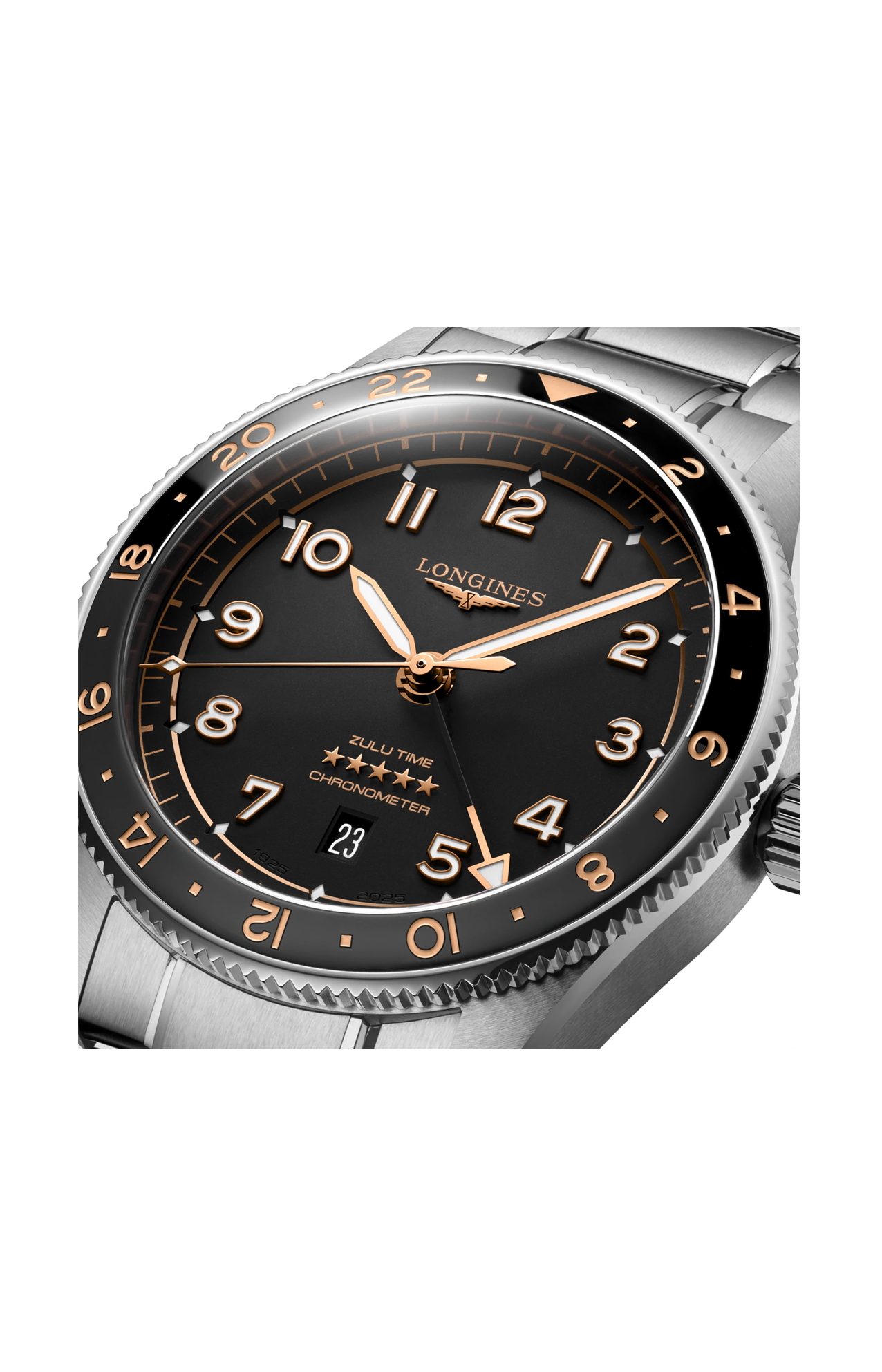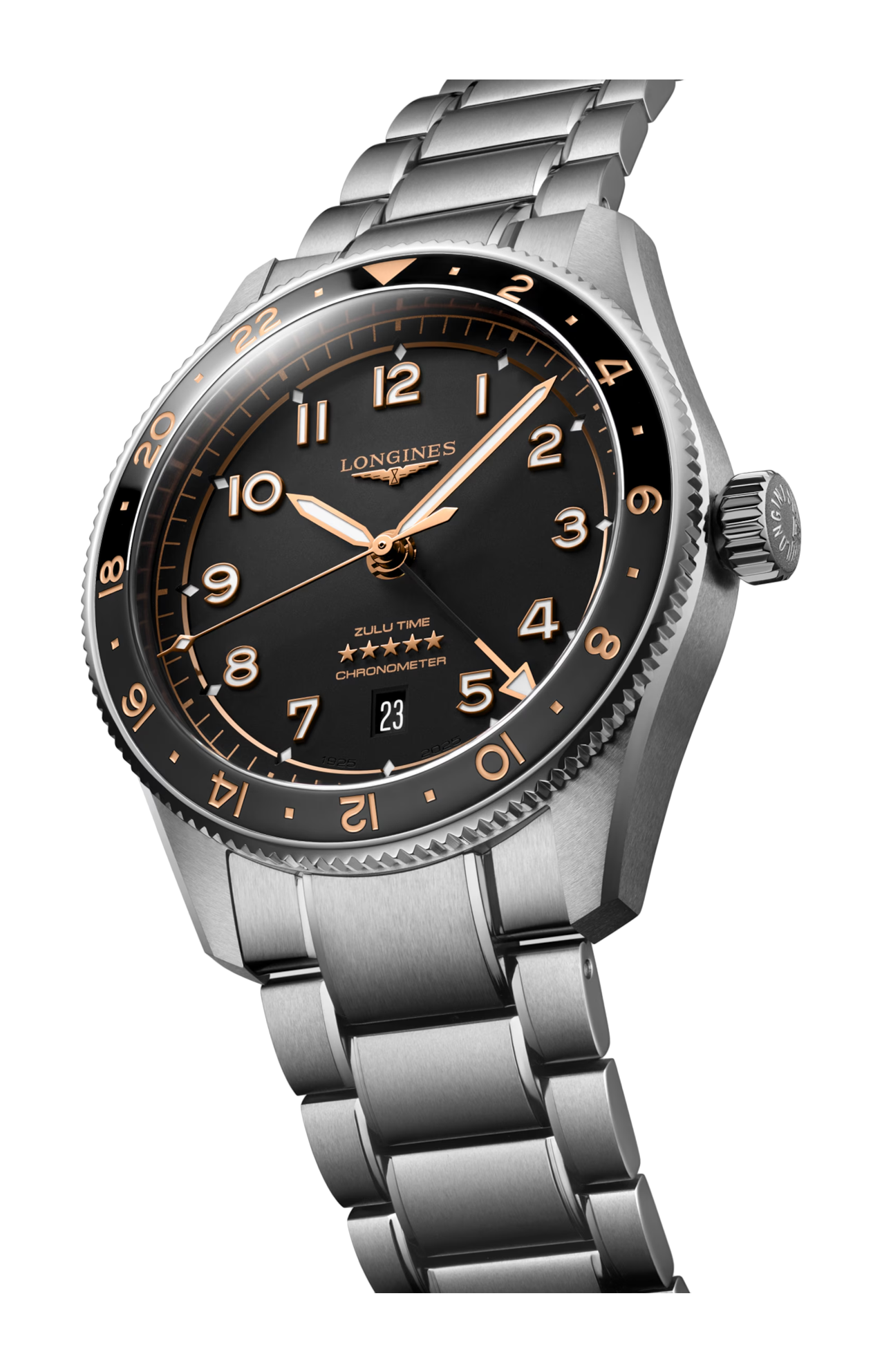 GMT date, movimento meccanico a carica automatica con frequenza di 25'200 alternanze orarie e riserva di carica di circa 72 ore, bilanciere-spirale in silicio monocristallino. Lunetta girevole bidirezionale corona a vite, impermeabile fino a 10 bar, vetro zaffiro antigraffio con trattamento antiriflesso multistrato su entrambi i lati. Quadrante nero mat, Swiss Super-Luminova®. Bracciale in acciaio inossidabile, con chiusura déployante a doppia sicurezza e meccanismo di apertura a pressione.