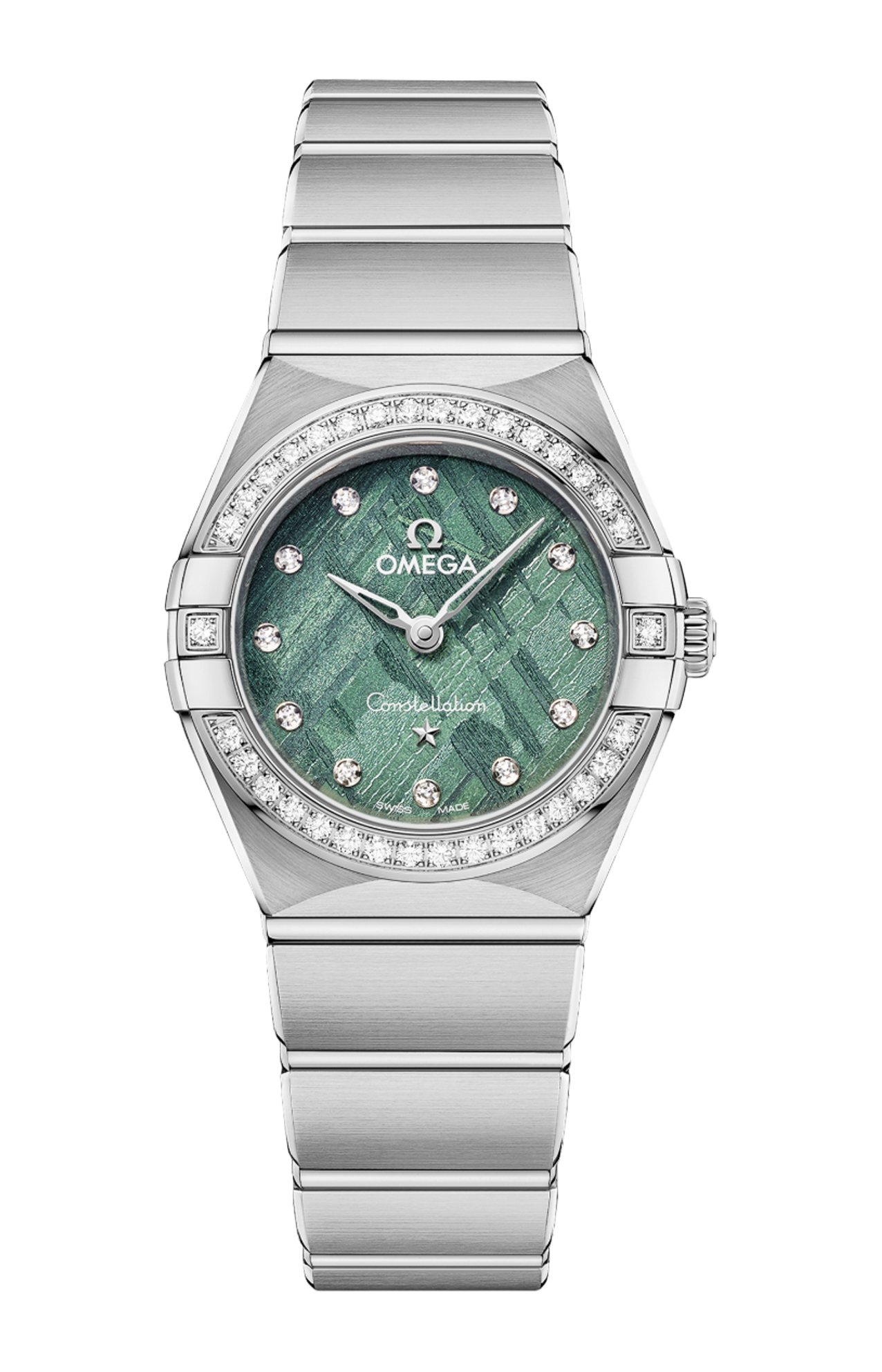 L’orologio presenta una cassa da 25 mm corredata da un bracciale “Mono Rang” in acciaio inossidabile e integra molte delle caratteristiche distintive della linea Constellation, come le griffe lucide, le sfaccettature a mezzaluna e la lunetta tempestata di diamanti.