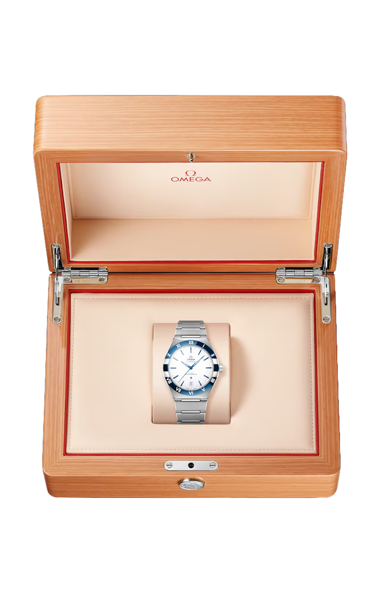 Questo modello da 41 mm in acciaio inossidabile presenta una lunetta in ceramica blu lucida con numeri romani in smalto bianco “grand feu”, un quadrante in ceramica bianca e un datario a finestrella a ore 6. Le lancette, il logo Omega, la stella Constellation e gli indici sfaccettati sono tutti azzurrati.