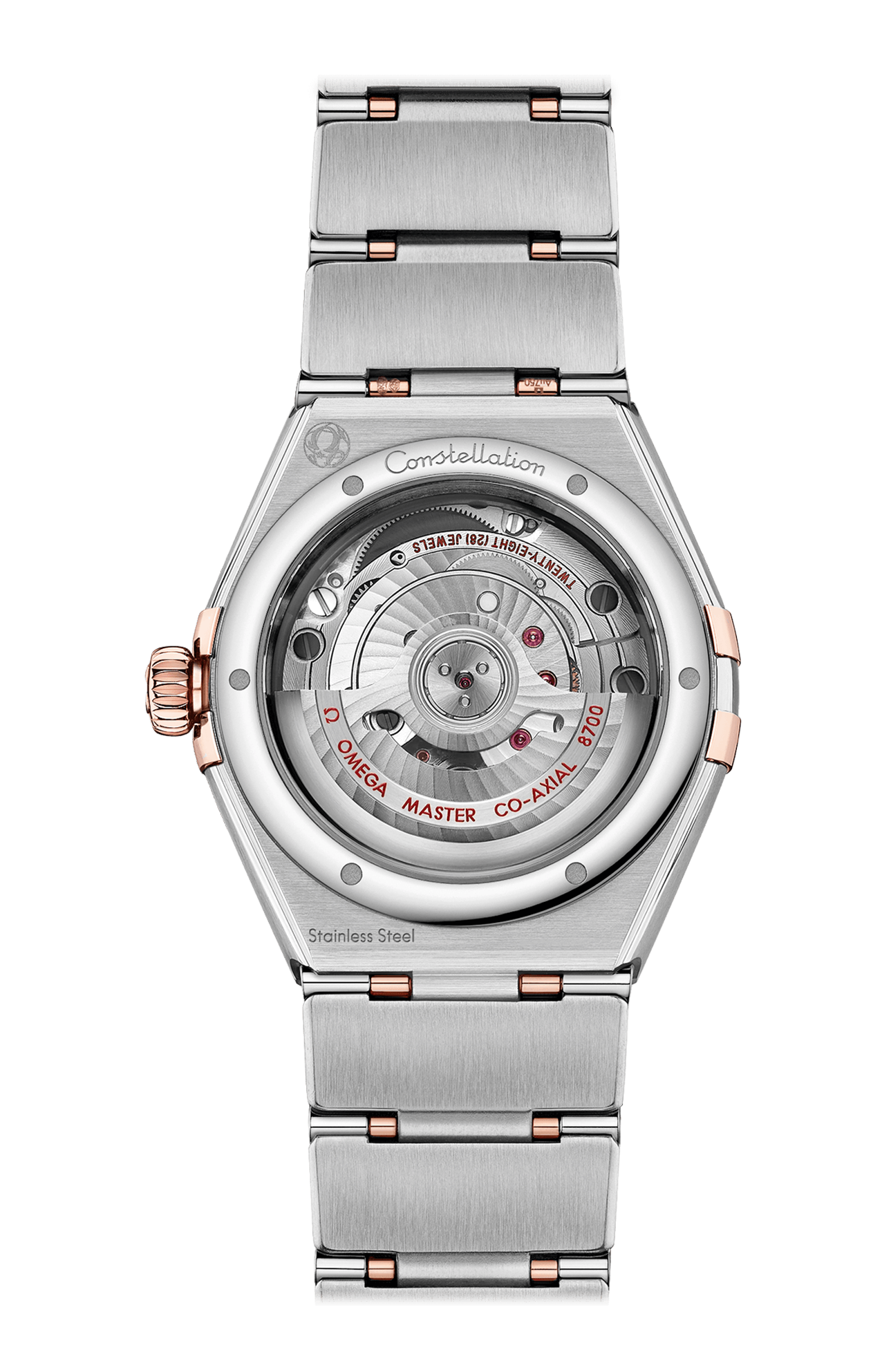 Il segnatempo batte al ritmo del calibro Omega Co-Axial Master Chronometer 8700, visibile attraverso il vetro zaffiro bombato resistente ai graffi.