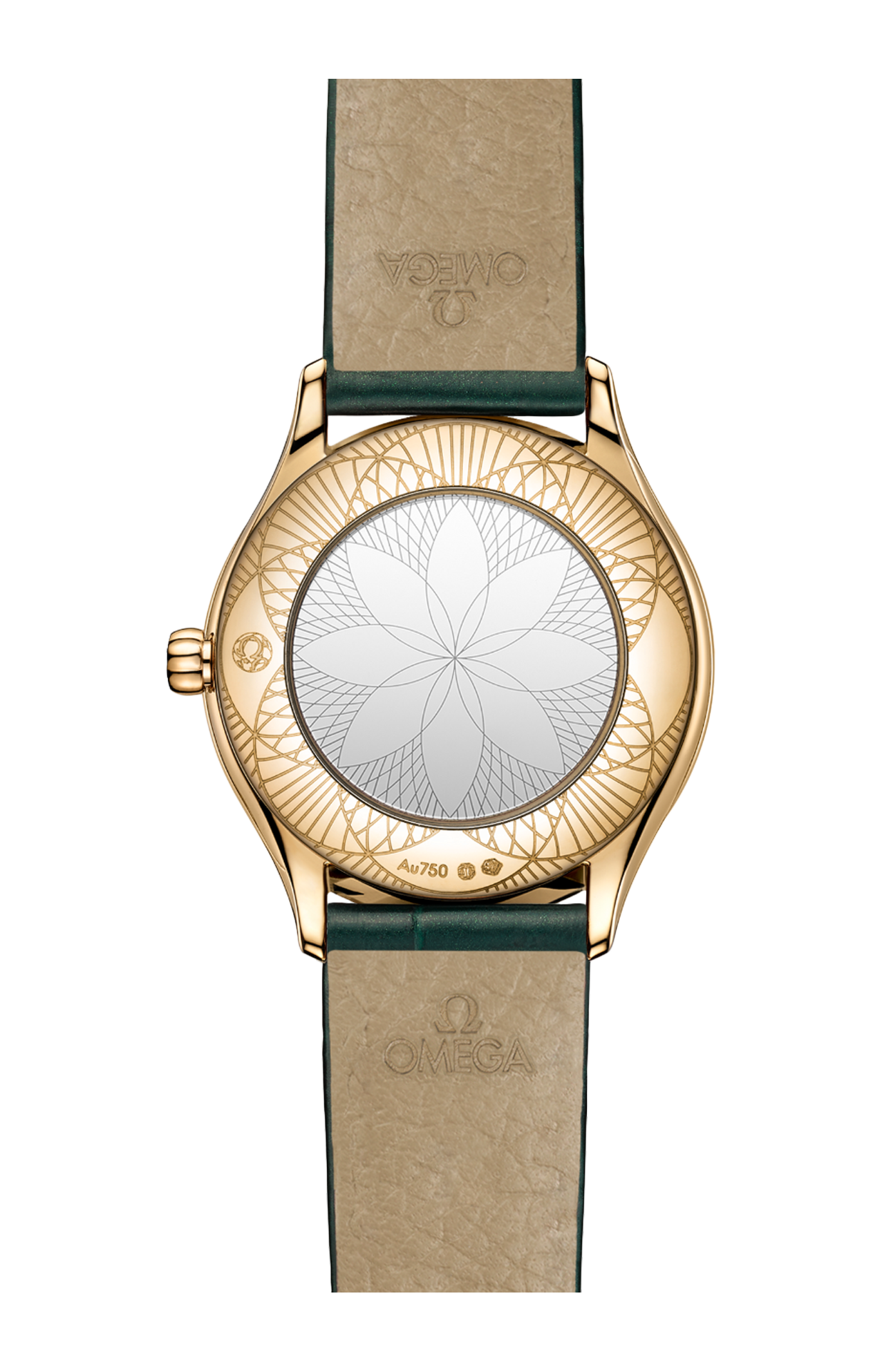 Corredato da un cinturino a doppio giro in pelle di alligatore verde scintillante con fibbia Trésor, l’orologio è animato dal calibro Omega 4061, alloggiato nello speciale fondello a specchio con motivo metallizzato “Her Time”.
